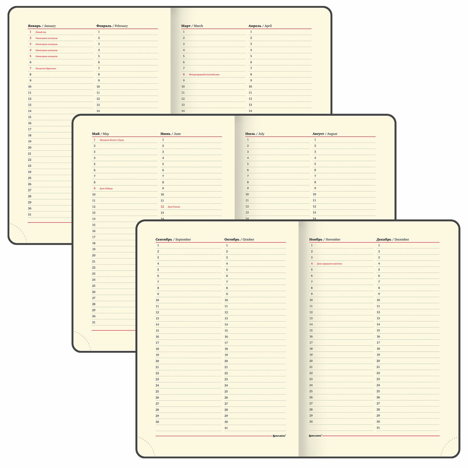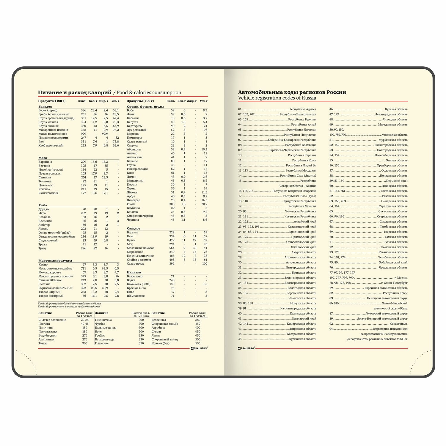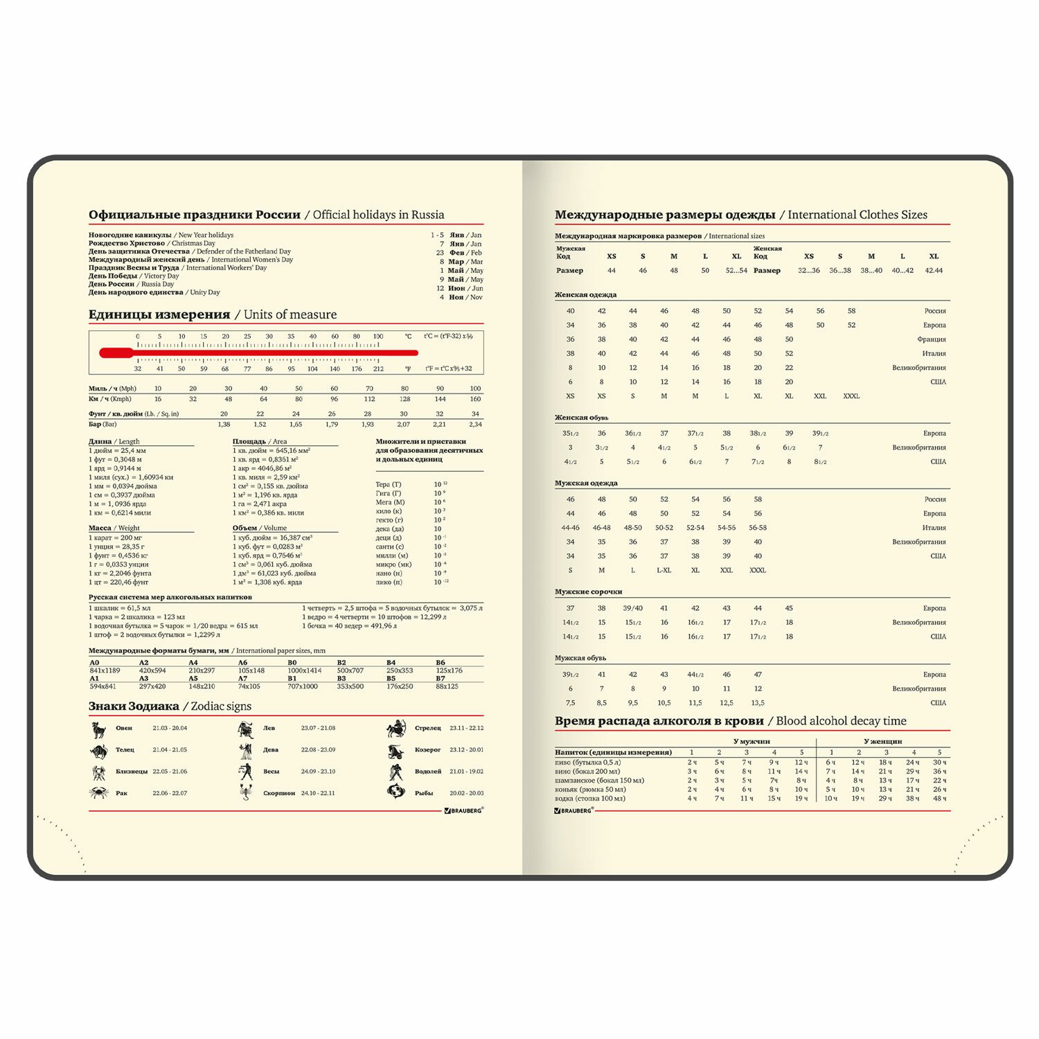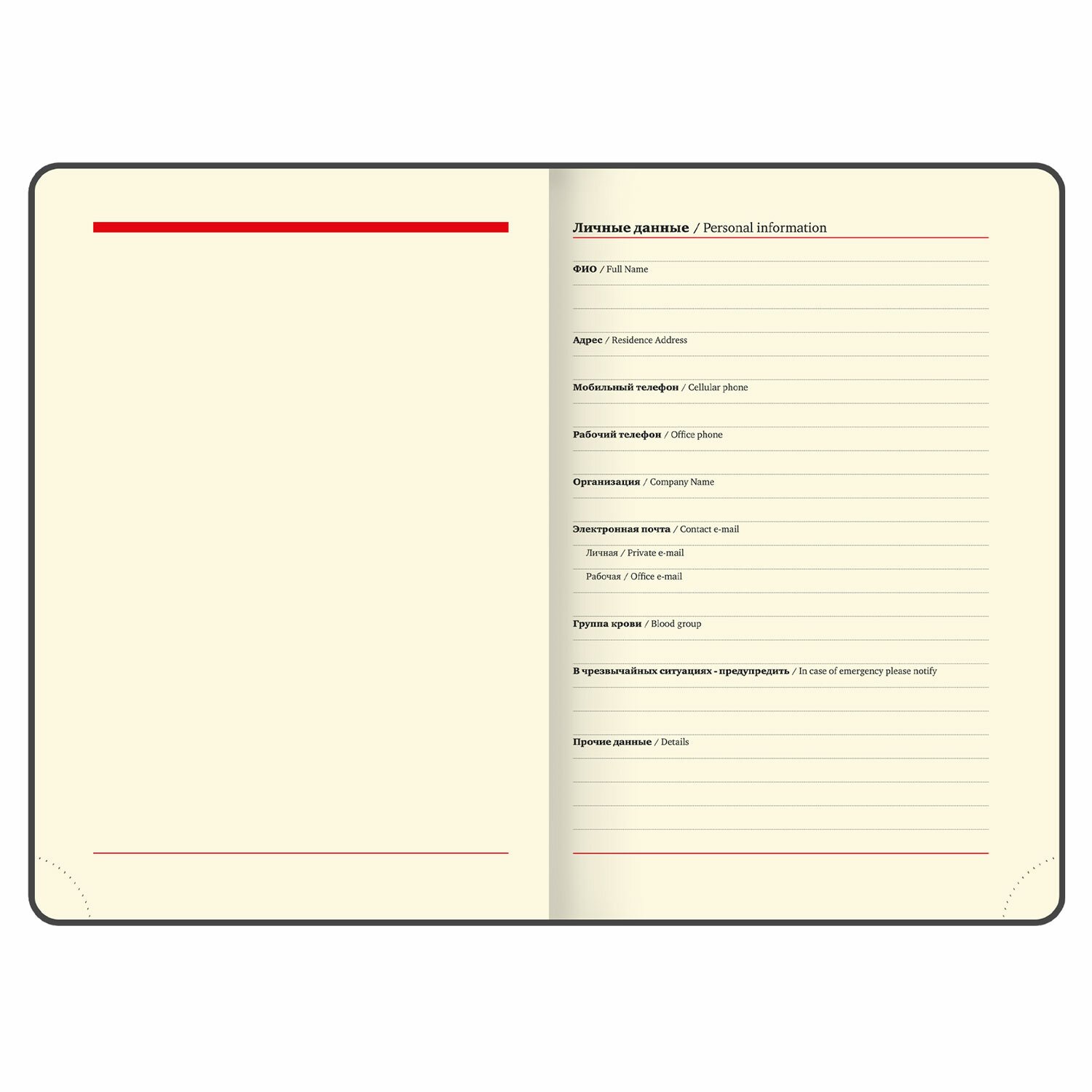 Внутренний блок включает 160 листов тонированной бумаги плотностью 70 г/м2. Каждая страничка имеет перфорированный угол. Благодаря большому формату А4 (210х297 мм) ежедневник удобно использовать как в офисе, так и на выездных деловых встречах.