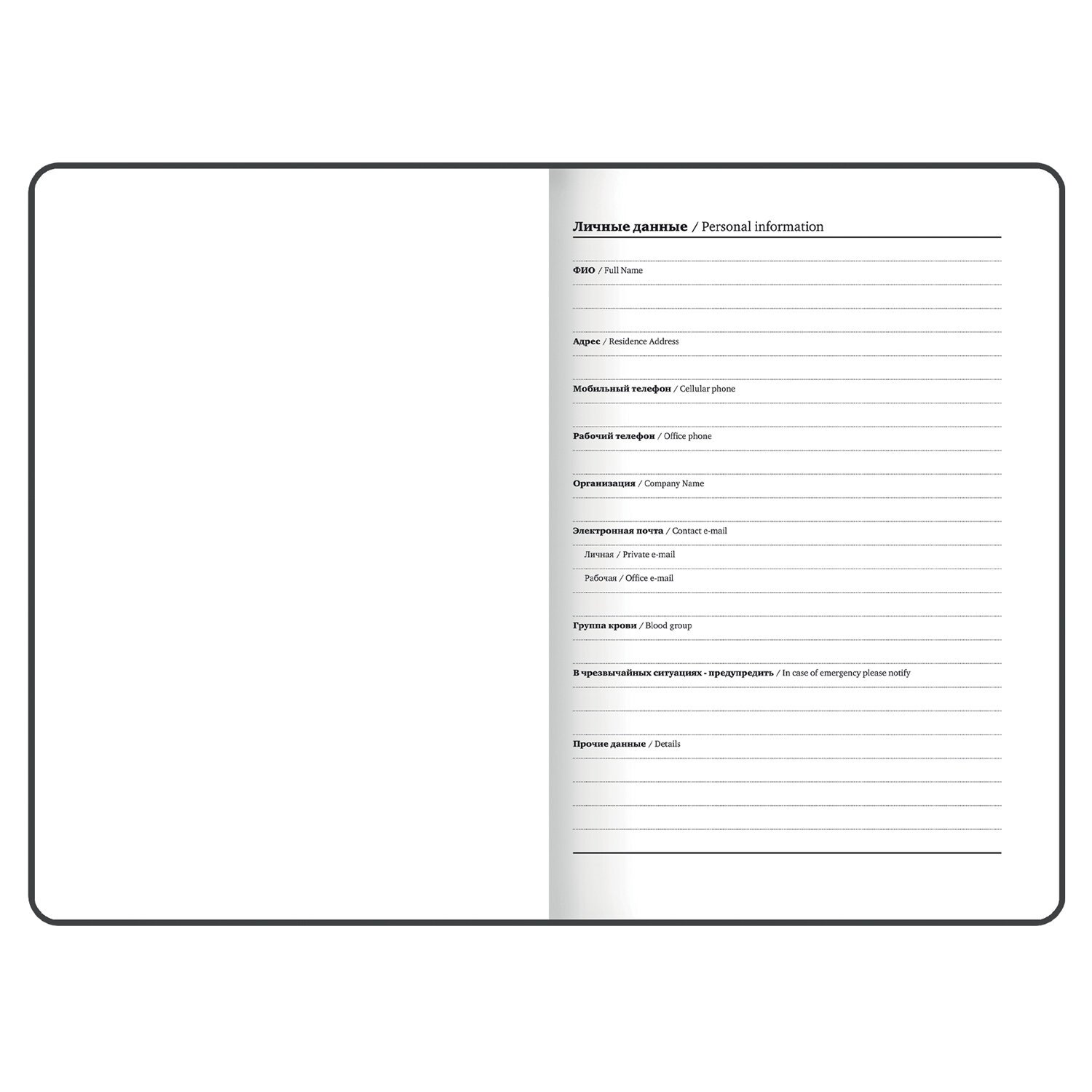 Внутренний блок содержит 128 листов офсетной бумаги плотностью 65 г/м2. Обложка 7БЦ (твердый переплет с матовой пленкой) обеспечивает долгий срок службы. Снабжен резинкой-фиксатором, благодаря чему ежедневник не откроется в сумке или портфеле.