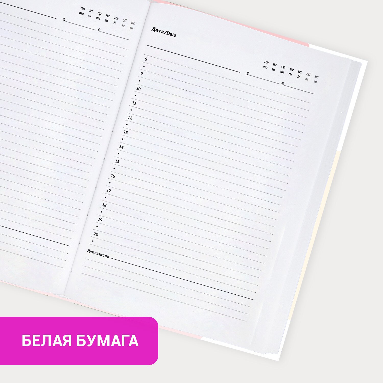 Внутренний блок содержит 128 листов офсетной бумаги плотностью 60 г/м2. Обложка 7БЦ (твердый переплет с матовой пленкой и тиснением фольгой) обеспечивает долгий срок службы. Снабжен резинкой-фиксатором, благодаря чему ежедневник не откроется в сумке или портфеле. Отличительная особенность – это поля, на которых можно проставить даты. Они не пропечатаны, поэтому владелец может отводить на каждый день сколько угодно листов и записывать все важные сведения. В конце ежедневника имеются 4 страницы для записей и заметок.