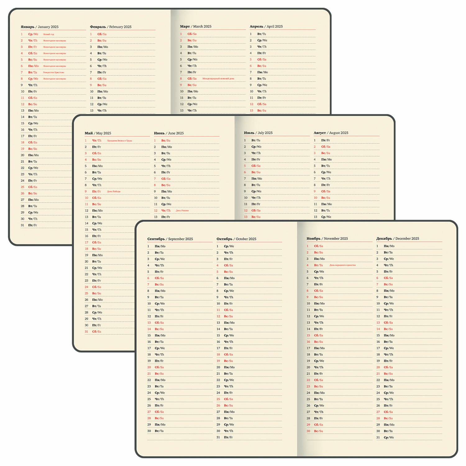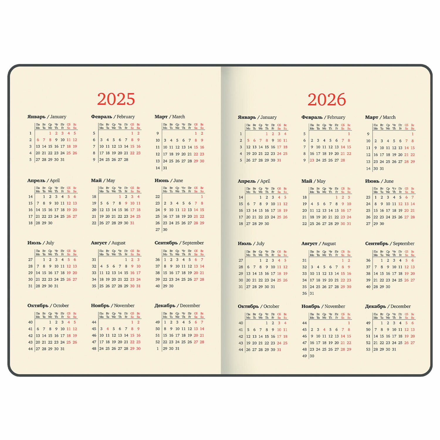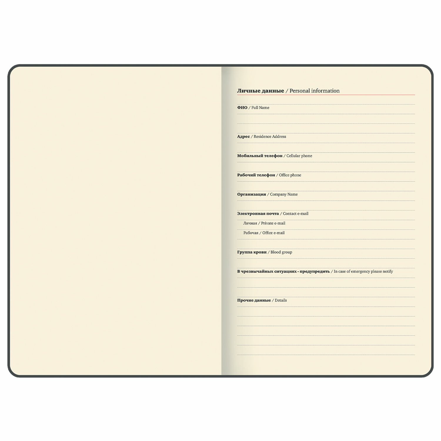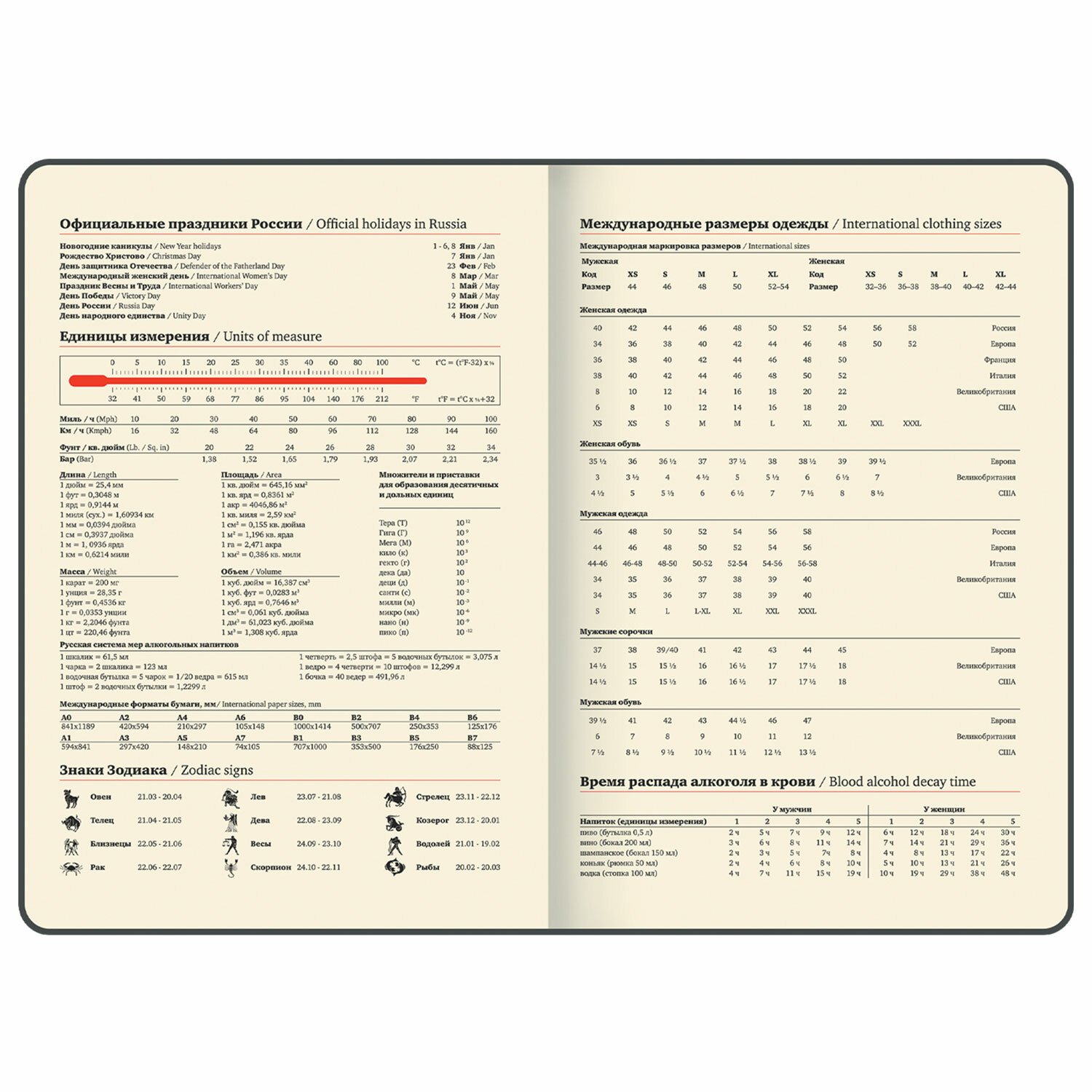 Внутренний блок включает 64 листа кремовой бумаги плотностью 70 г/м2. Благодаря большому формату А4 еженедельник удобно использовать как в офисе, так и на выездных деловых встречах. Твердая обложка, стилизованная под фактурную кожу красного цвета, подходит для горячего тиснения. Дополнением является закладка-ляссе, с помощью которой при необходимости можно быстро открыть еженедельник на нужной странице. Для заметок в еженедельнике имеется 7 страниц в конце внутреннего блока. Еженедельник снабжен обширным справочным материалом.