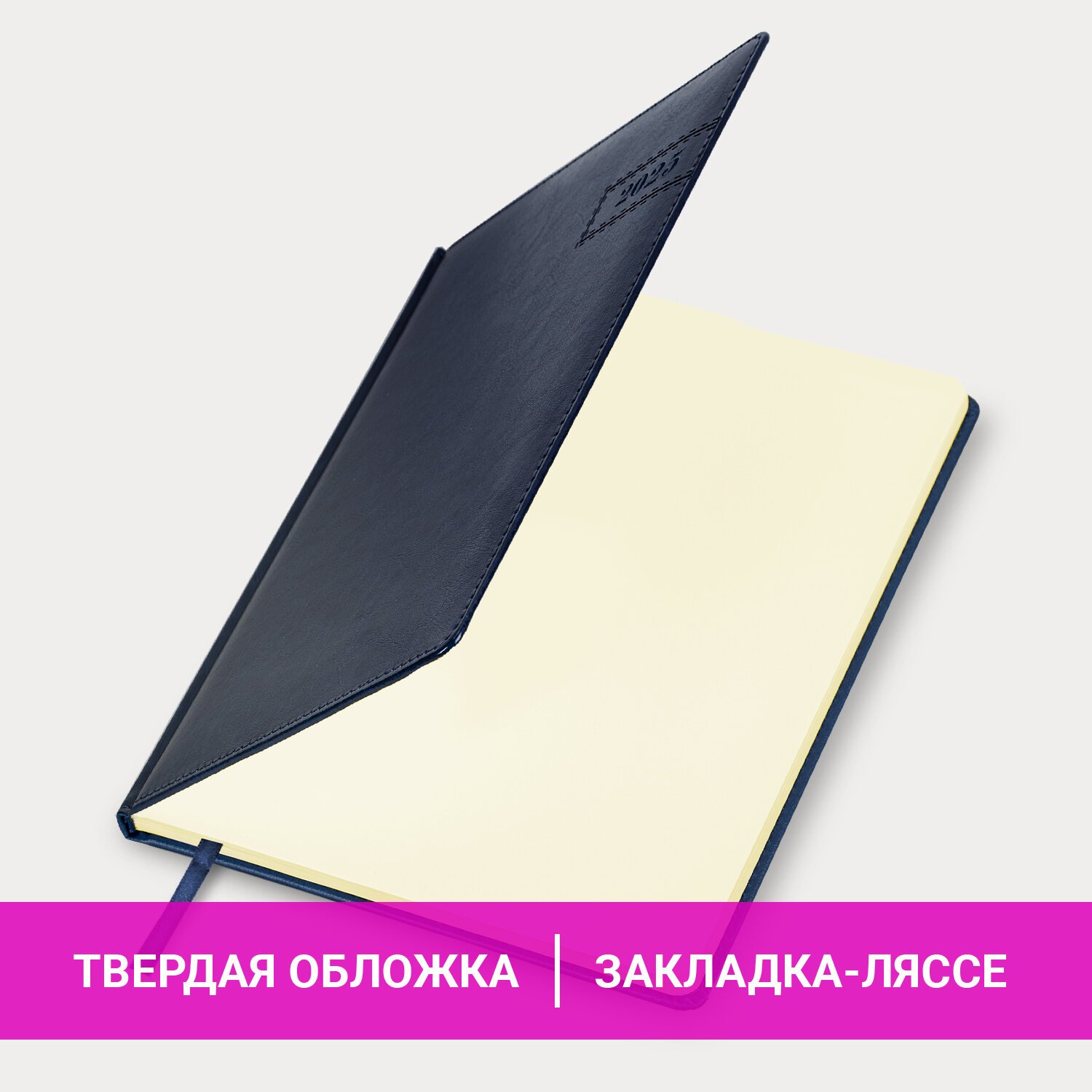Внутренний блок включает 64 листа кремовой бумаги плотностью 70 г/м2. Благодаря большому формату А4 еженедельник удобно использовать как в офисе, так и на выездных деловых встречах. Твердая обложка, стилизованная под фактурную кожу благородного синего цвета, подходит для горячего тиснения. Дополнением является закладка-ляссе, с помощью которой при необходимости можно быстро открыть еженедельник на нужной странице. Для заметок в еженедельнике имеется 7 страниц в конце внутреннего блока. Еженедельник снабжен обширным справочным материалом.