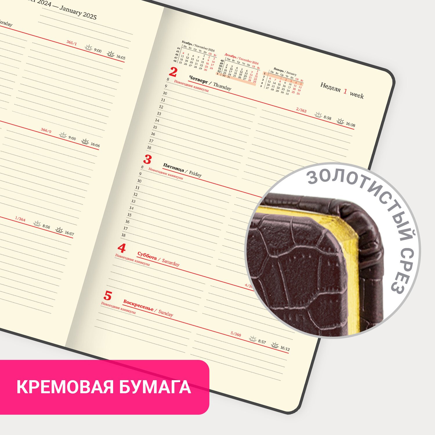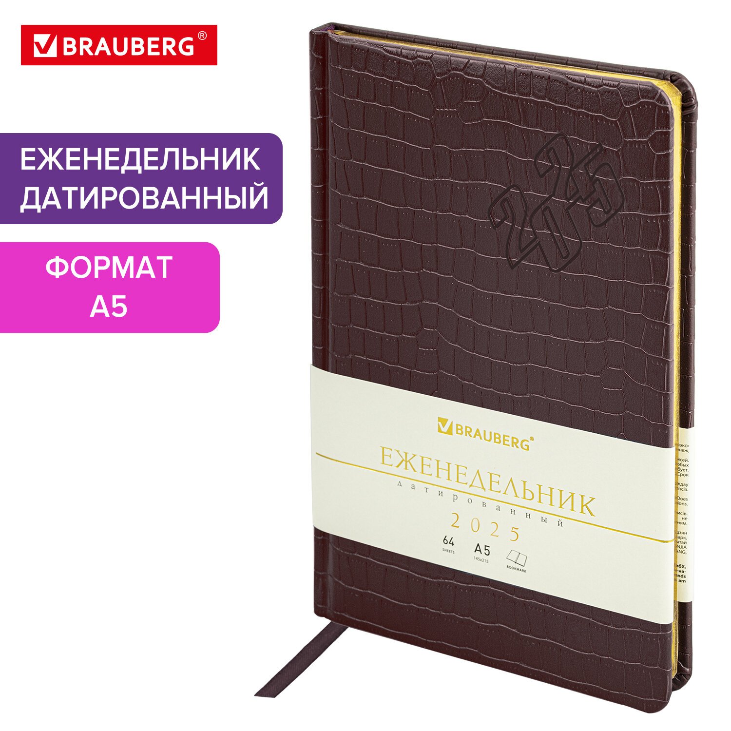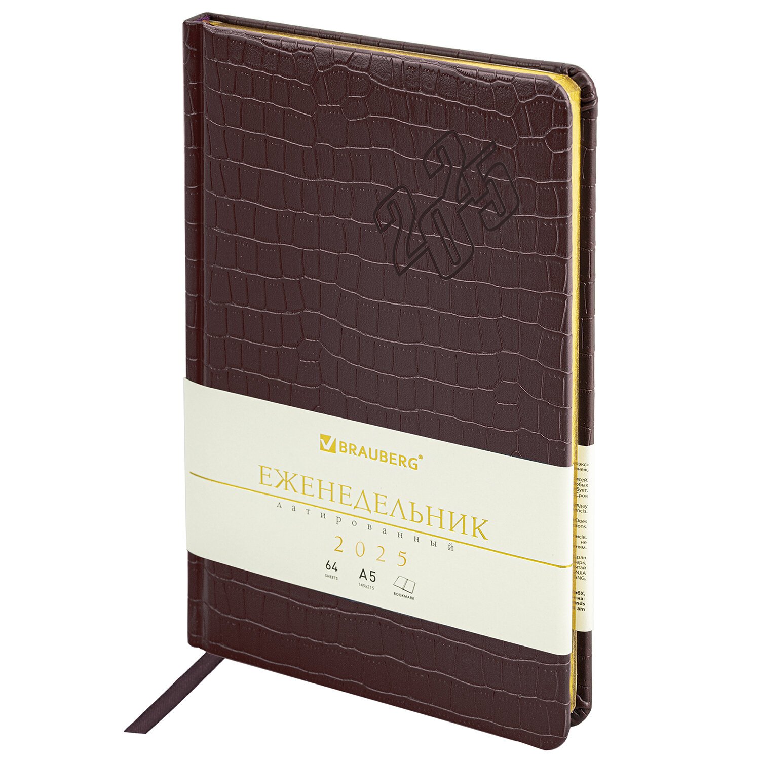 Еженедельник датированный 2025 А5 145х215 мм BRAUBERG "Comodo", под кожу, темно-коричневый, 115956