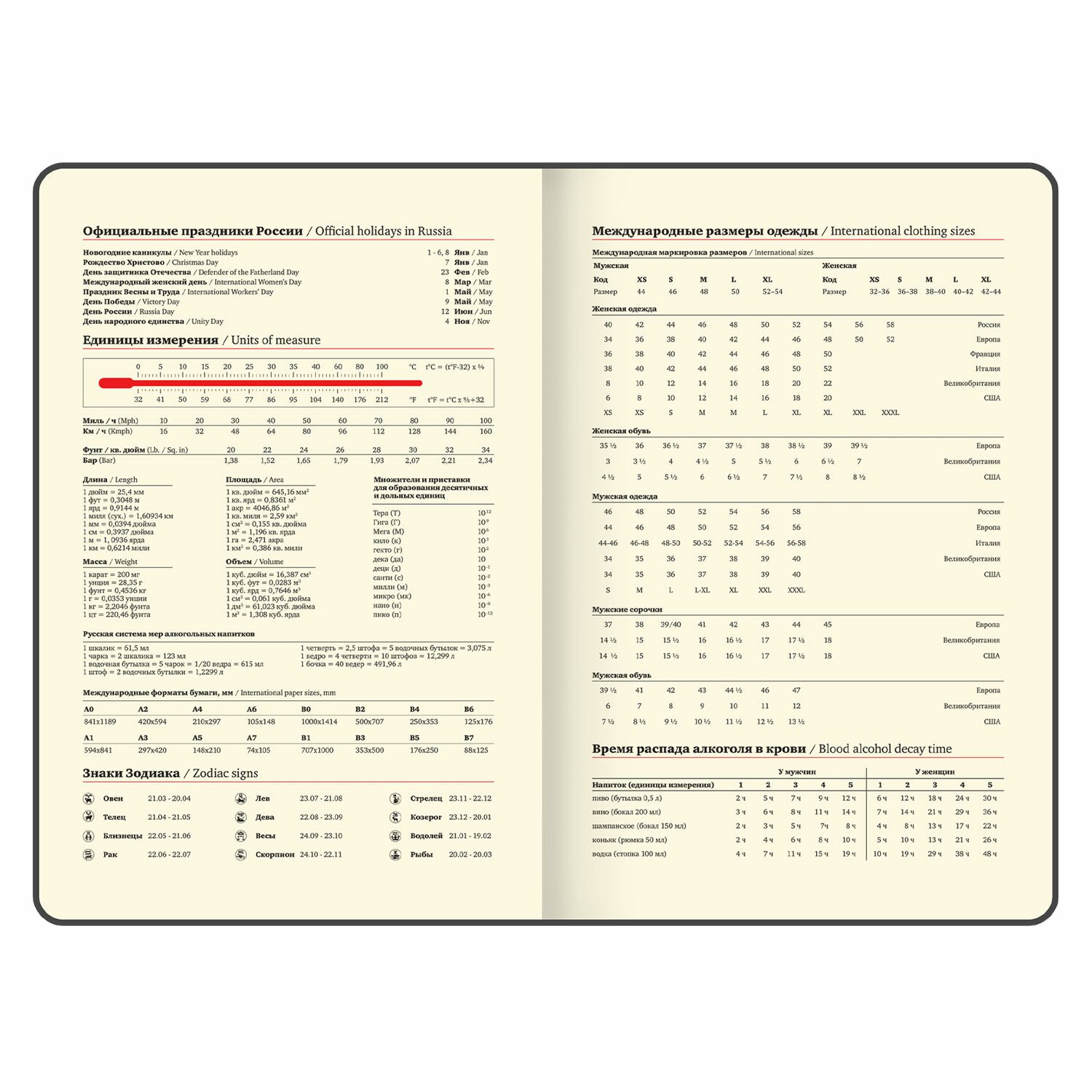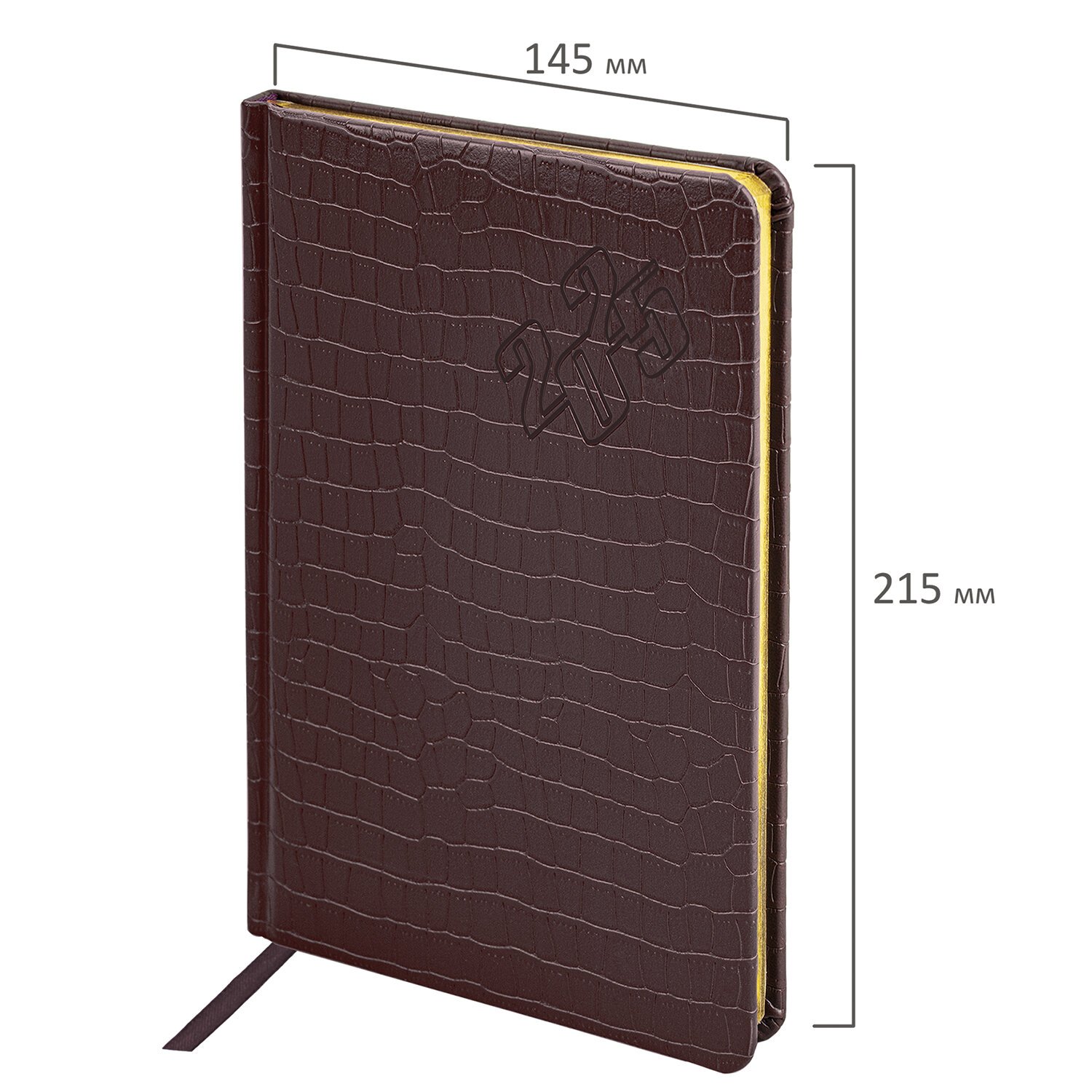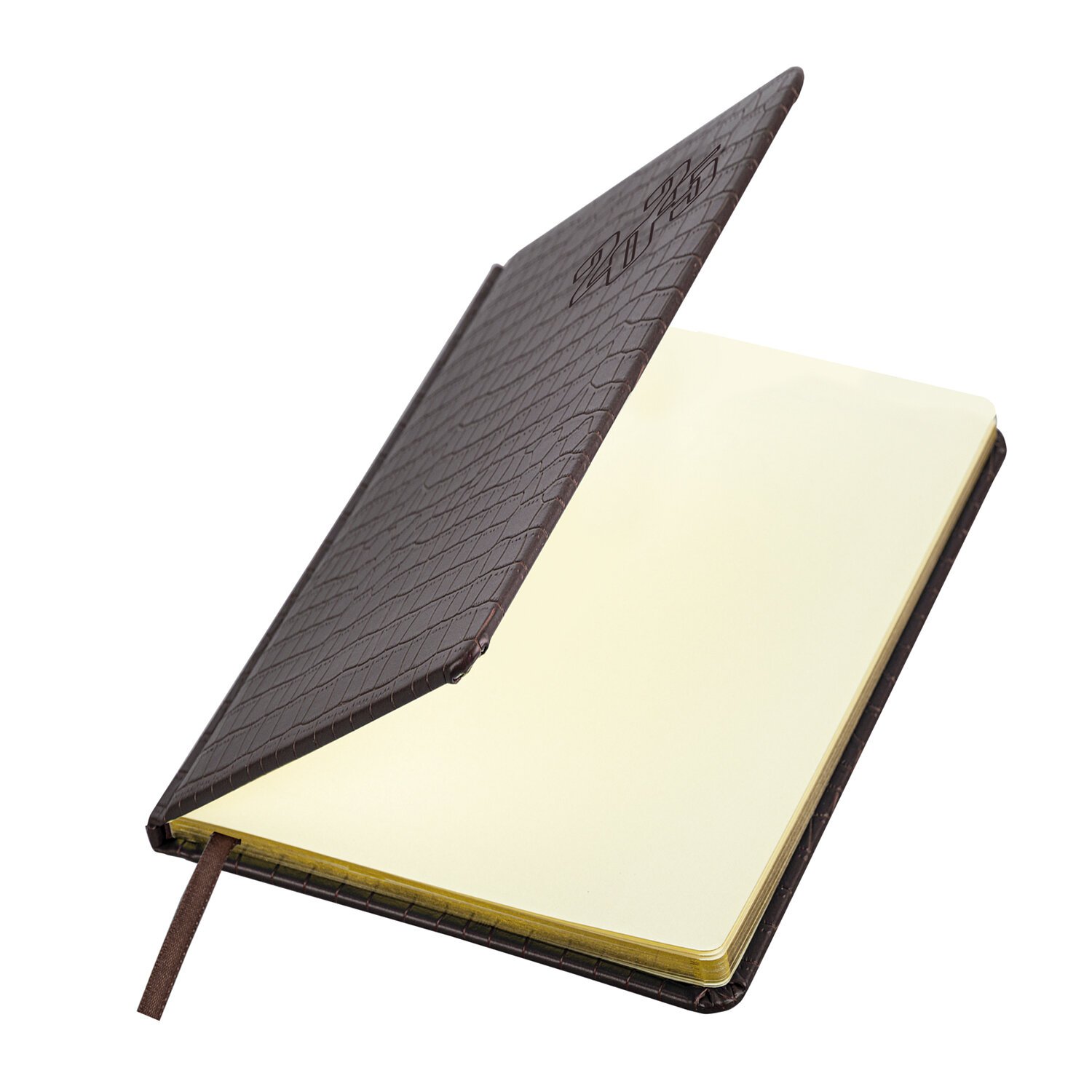Внутренний блок включает 64 листа тонированной бумаги плотностью 70 г/м2. Благодаря стандартному формату А5 (145х215 мм) еженедельник удобно использовать как в офисе, так и на выездных деловых встречах. Твердая обложка благородного темно-коричневого цвета, стилизованная под кожу крокодила, подходит для горячего тиснения. Срез еженедельника фольгирован золотой фольгой, что придает ему особый шарм. Дополнением является закладка-ляссе, с помощью которой при необходимости можно быстро открыть еженедельник на нужной странице. Для заметок в еженедельнике имеется 7 страниц в конце внутреннего блока. Помимо прочего, еженедельник снабжен обширным справочным материалом.