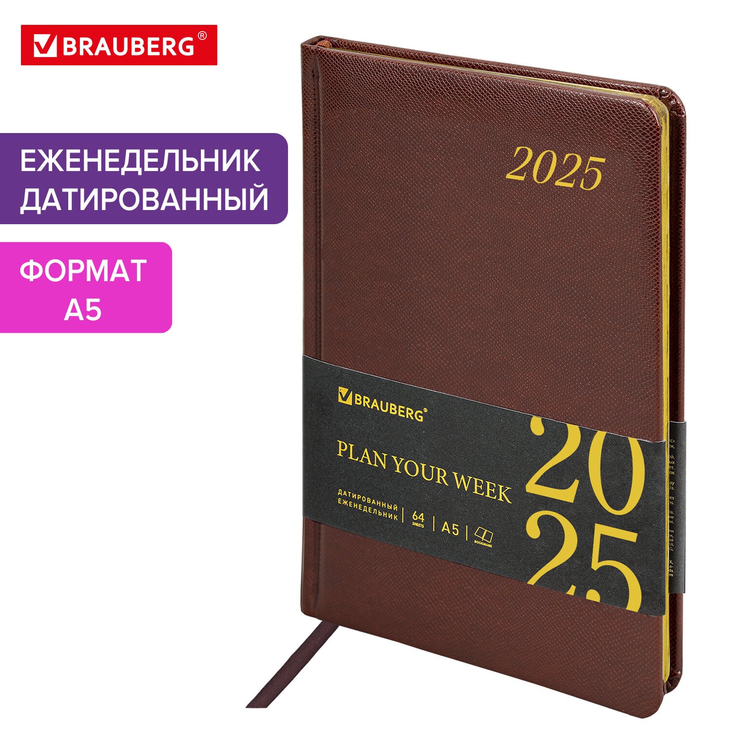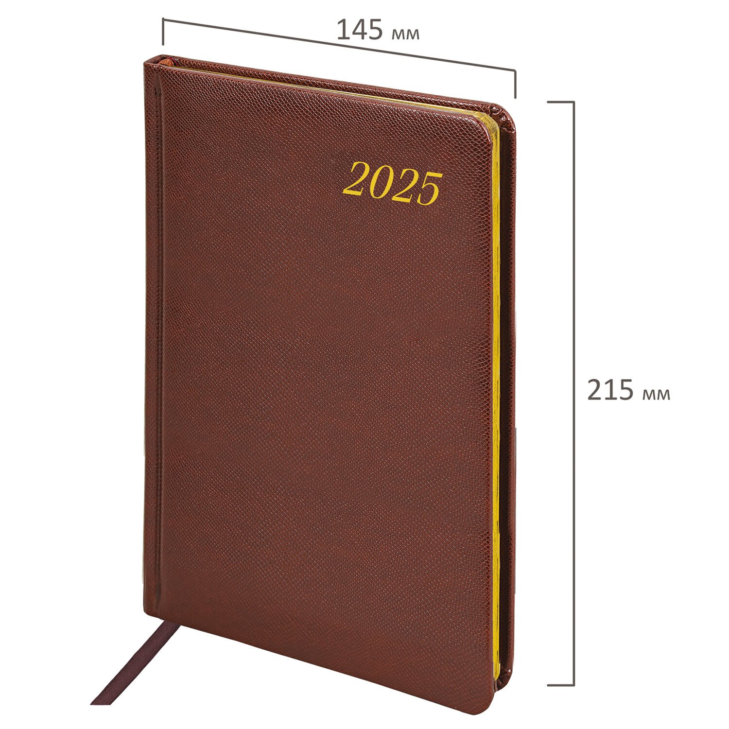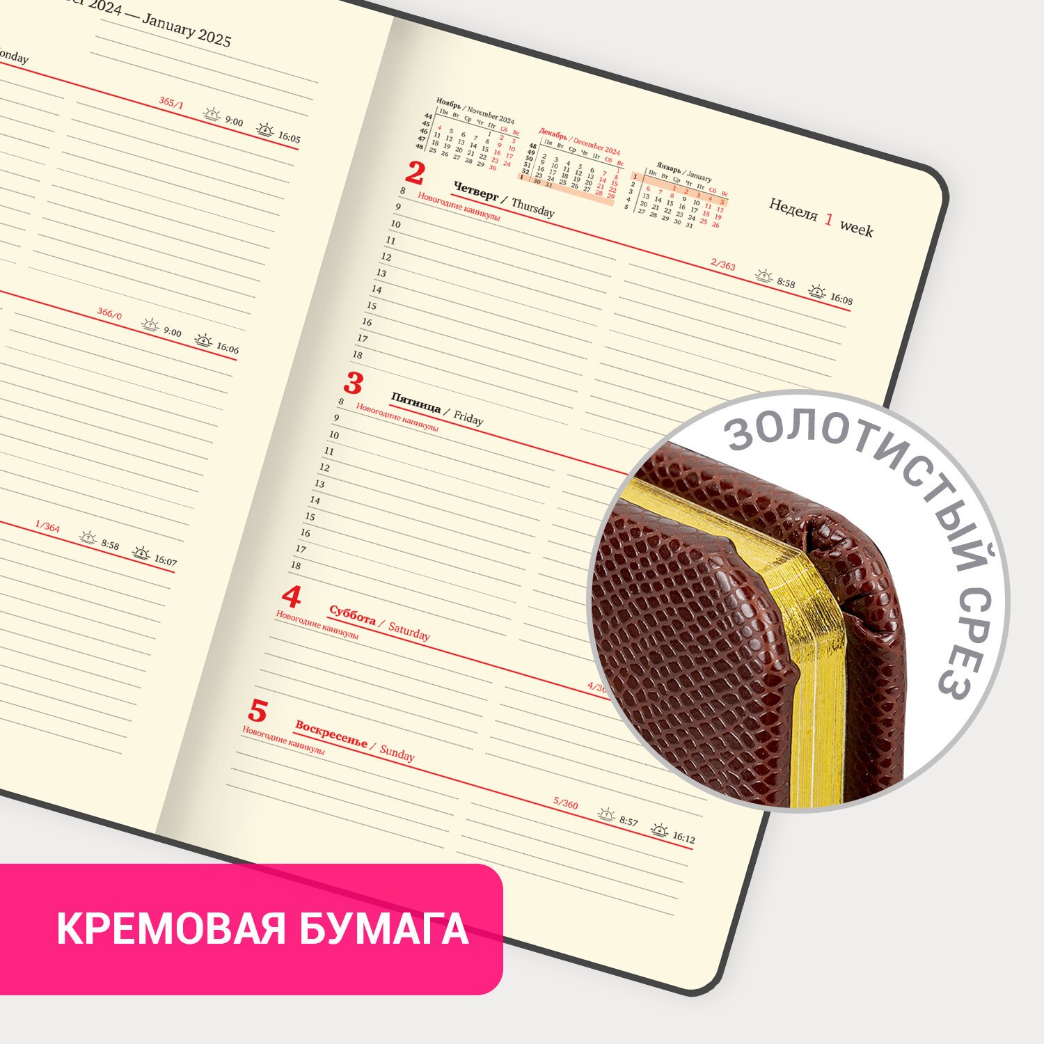 Еженедельник датированный 2025, А5, 145х215 мм, BRAUBERG "Iguana", под кожу, коричневый, 115959