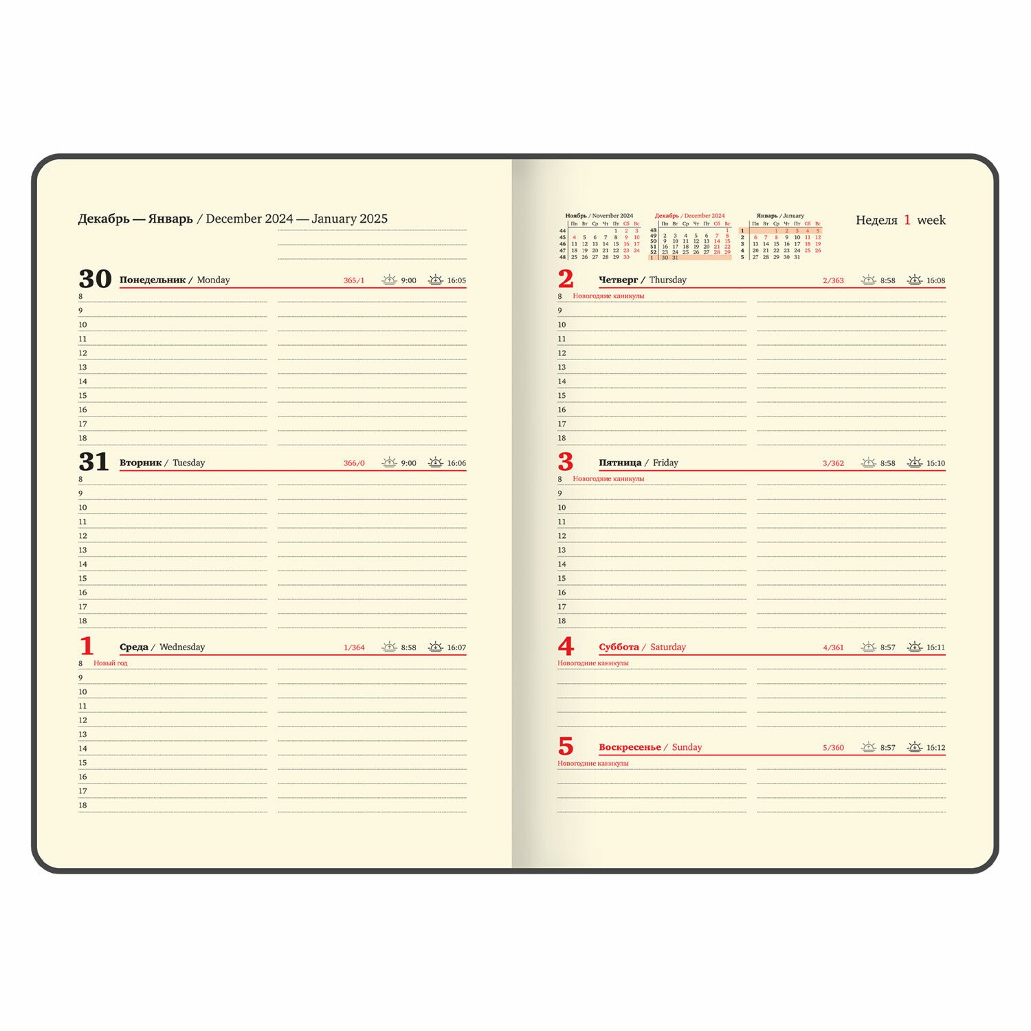 Внутренний блок включает 64 листа тонированной бумаги плотностью 70 г/м2. Благодаря стандартному формату А5 еженедельник удобно использовать как в офисе, так и на выездных деловых встречах. Твердая обложка, стилизованная под кожу рептилии, имеет благородный коричневый цвет и подходит для горячего тиснения. Срез еженедельника фольгирован золотой фольгой, что придает ему особый шарм. Дополнением является закладка-ляссе, с помощью которой при необходимости можно быстро открыть еженедельник на нужной странице. Для заметок в еженедельнике имеется 7 страниц в конце внутреннего блока. Еженедельник снабжен обширным справочным материалом.