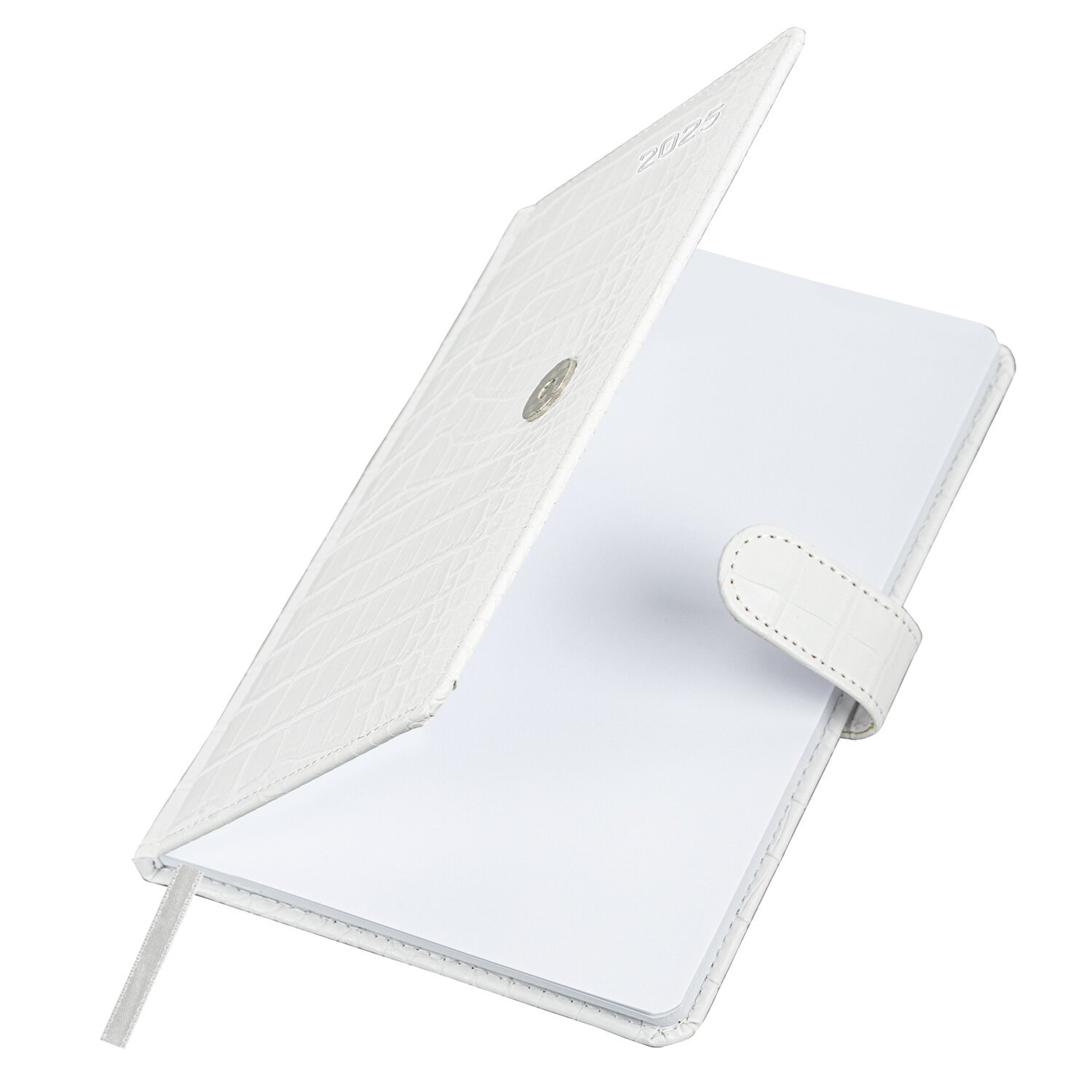 Внутренний блок включает 64 листа белой бумаги плотностью 70 г/м2. Благодаря стандартному формату А5 еженедельник удобно использовать как в офисе, так и на выездных деловых встречах. Твердая обложка, стилизованная под кожу крокодила, фиксируется магнитной застежкой, поэтому еженедельник не откроется в сумке или портфеле и страницы не помнутся. Подходит для горячего тиснения. Дополнением является закладка-ляссе, с помощью которой при необходимости можно быстро открыть еженедельник на нужной странице. Для заметок в еженедельнике имеется 7 страниц в конце внутреннего блока. Еженедельник снабжен обширным справочным материалом. Выполнен в классическом белом цвете.