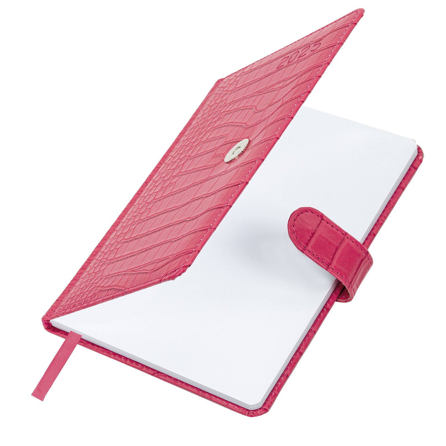 Внутренний блок включает 64 листа белой бумаги плотностью 70 г/м2. Благодаря стандартному формату А5 еженедельник удобно использовать как в офисе, так и на выездных деловых встречах. Твердая обложка, стилизованная под кожу крокодила, фиксируется магнитной застежкой, поэтому еженедельник не откроется в сумке или портфеле и страницы не помнутся. Подходит для горячего тиснения. Дополнением является закладка-ляссе, с помощью которой при необходимости можно быстро открыть еженедельник на нужной странице. Для заметок в еженедельнике имеется 7 страниц в конце внутреннего блока. Еженедельник снабжен обширным справочным материалом. Выполнен в ярком розовом цвете.