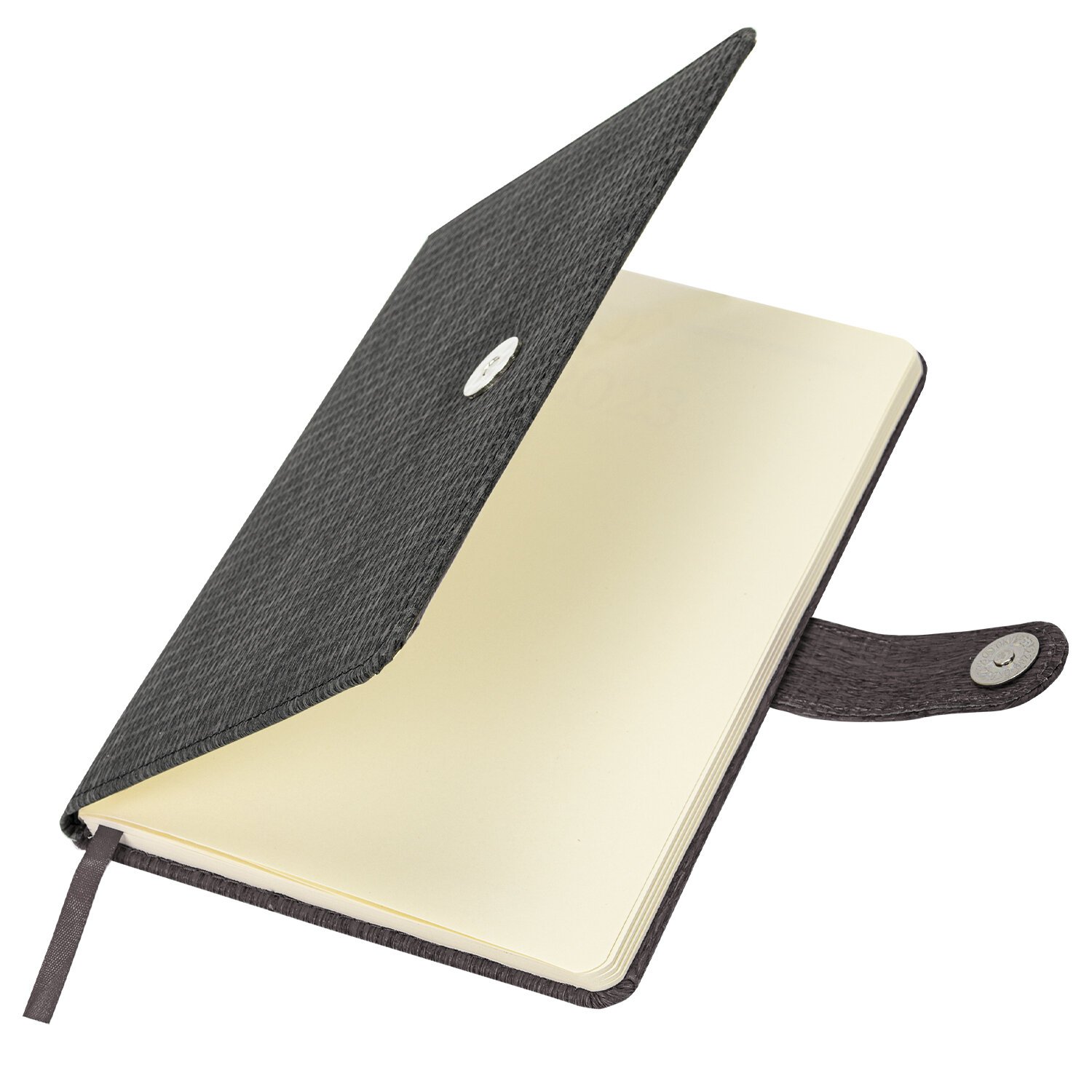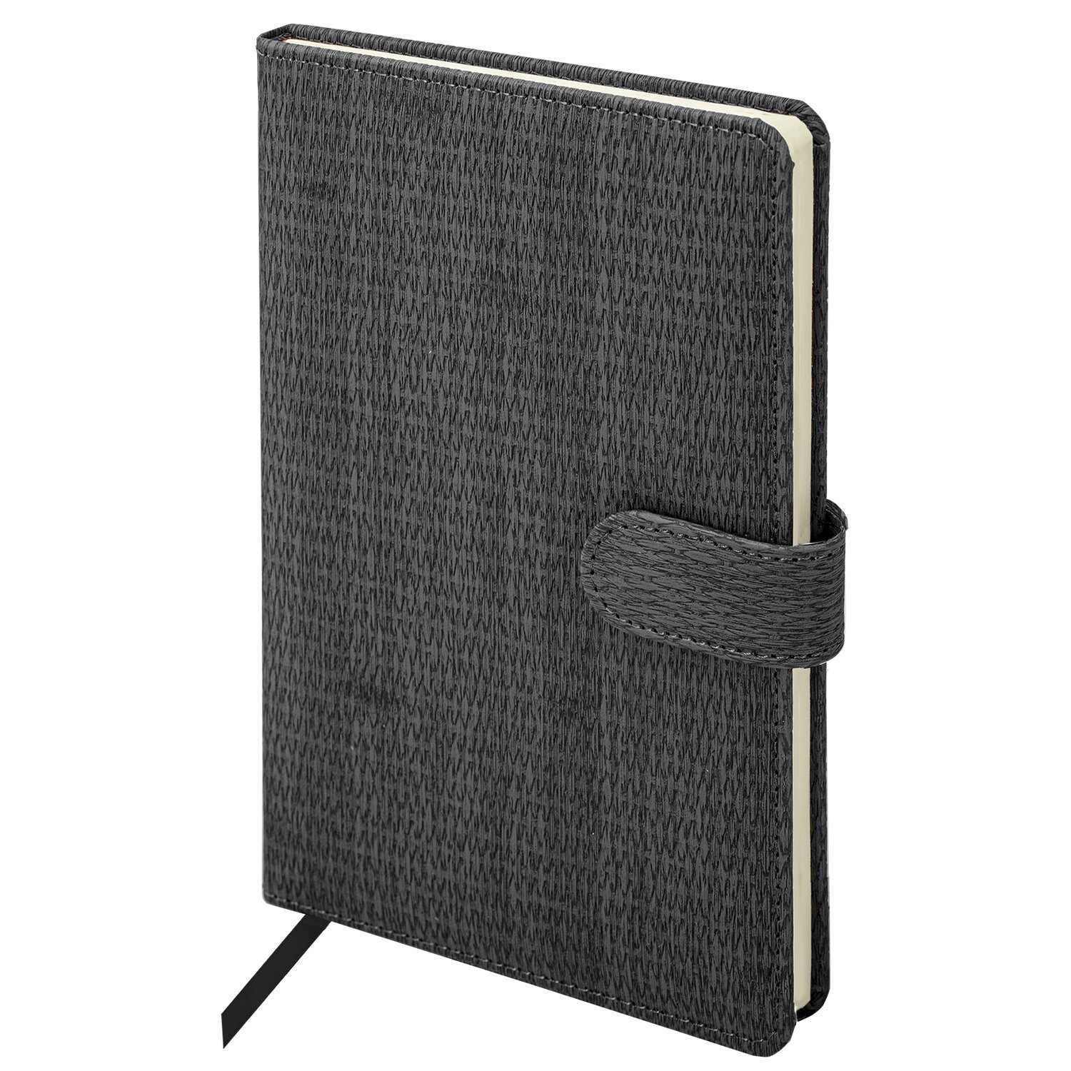 Внутренний блок включает 64 листа тонированной бумаги плотностью 70 г/м2. Благодаря стандартному формату А5 еженедельник удобно использовать как в офисе, так и на выездных деловых встречах. Твердая обложка, стилизованная под кожу с текстурной выработкой, фиксируется магнитной застежкой, поэтому еженедельник не откроется в сумке или портфеле и страницы не помнутся. Подходит для горячего тиснения. Дополнением является закладка-ляссе, с помощью которой при необходимости можно быстро открыть еженедельник на нужной странице. Для заметок в еженедельнике имеется 7 страниц в конце внутреннего блока. Помимо прочего, еженедельник снабжен обширным справочным материалом. Выполнен в черном цвете.
