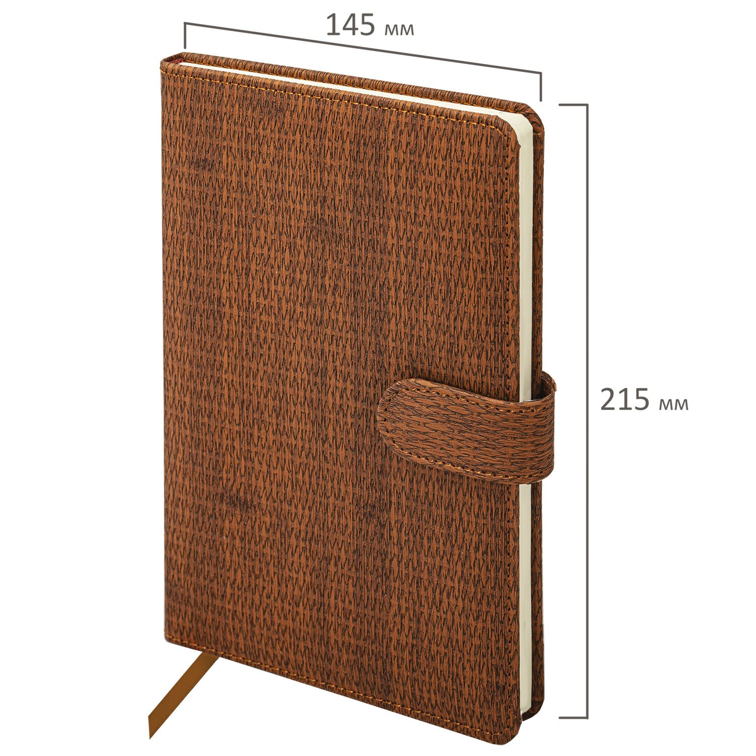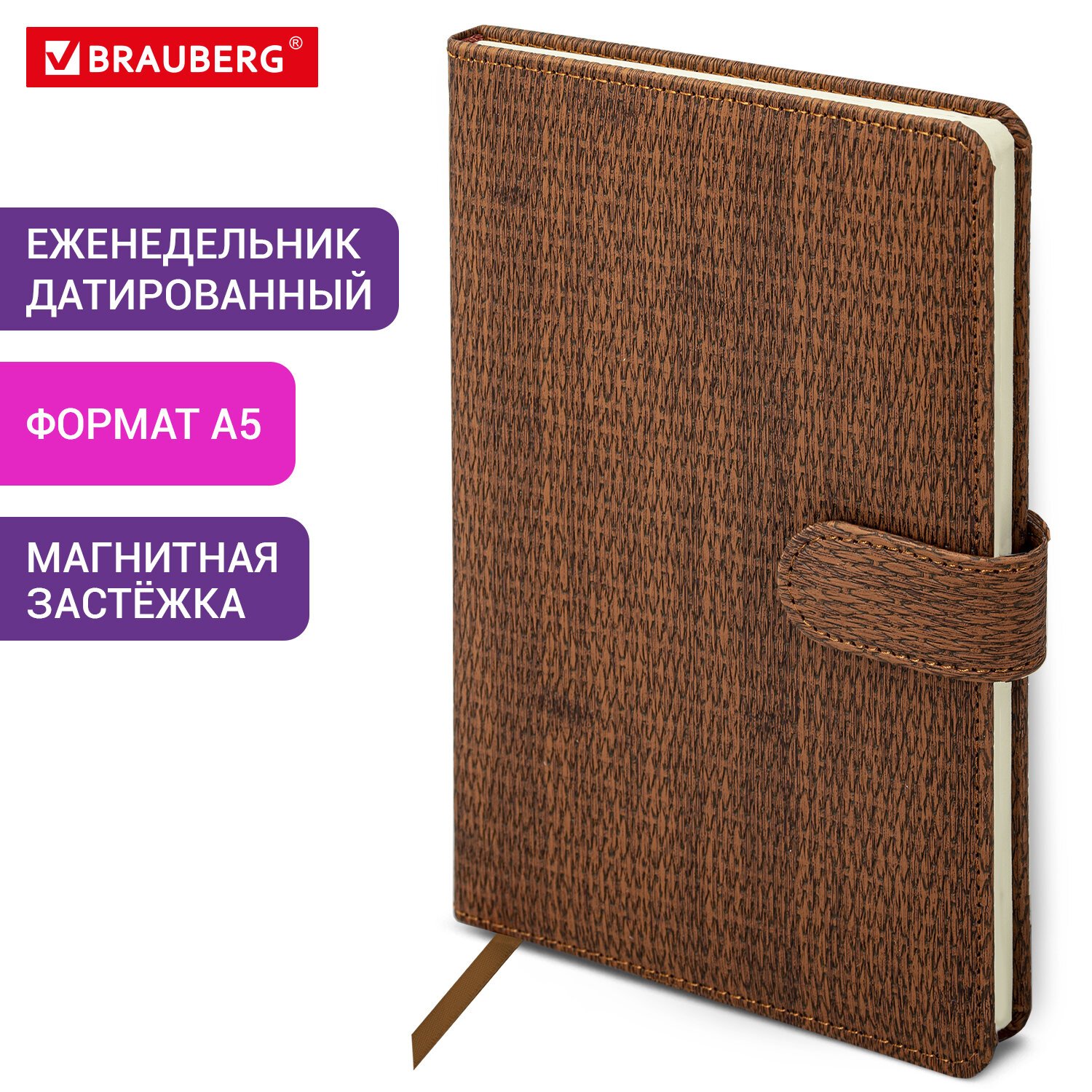 Внутренний блок включает 64 листа тонированной бумаги плотностью 70 г/м2. Благодаря стандартному формату А5 (145х215 мм) еженедельник удобно использовать как в офисе, так и на выездных деловых встречах. Твердая обложка, стилизованная под кожу с текстурной выработкой, фиксируется магнитной застежкой, поэтому еженедельник не откроется в сумке или портфеле и страницы не помнутся. Подходит для горячего тиснения. Дополнением является закладка-ляссе, с помощью которой при необходимости можно быстро открыть еженедельник на нужной странице. Для заметок в еженедельнике имеется 7 страниц в конце внутреннего блока. Помимо прочего, еженедельник снабжен обширным справочным материалом. Выполнен в благородном коричневом цвете.