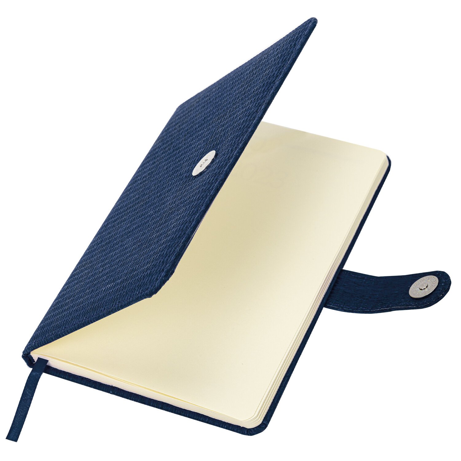 Внутренний блок включает 64 листа тонированной бумаги плотностью 70 г/м2. Благодаря стандартному формату А5 еженедельник удобно использовать как в офисе, так и на выездных деловых встречах. Твердая обложка, стилизованная под кожу с текстурной выработкой, фиксируется магнитной застежкой, поэтому еженедельник не откроется в сумке или портфеле и страницы не помнутся. Подходит для горячего тиснения. Дополнением является закладка-ляссе, с помощью которой при необходимости можно быстро открыть еженедельник на нужной странице. Для заметок в еженедельнике имеется 7 страниц в конце внутреннего блока. Помимо прочего, еженедельник снабжен обширным справочным материалом. Выполнен в классическом темно-синем цвете.
