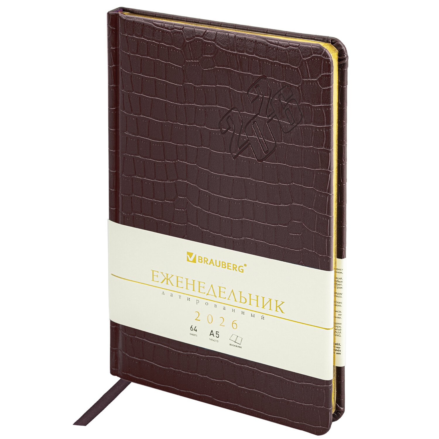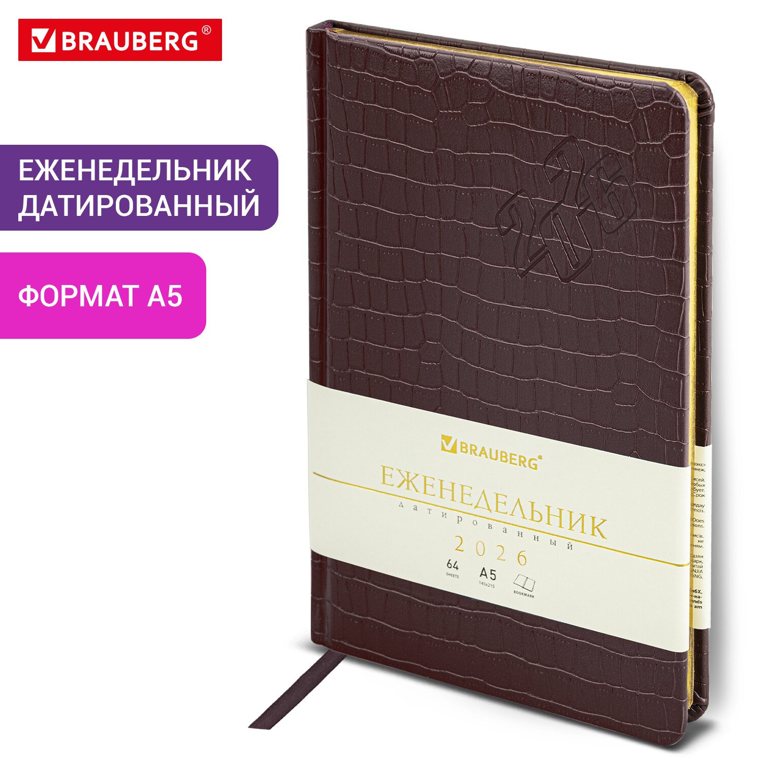 Еженедельник датированный 2026 А5 145х215мм BRAUBERG Party, под кожу, коричневый, 117177