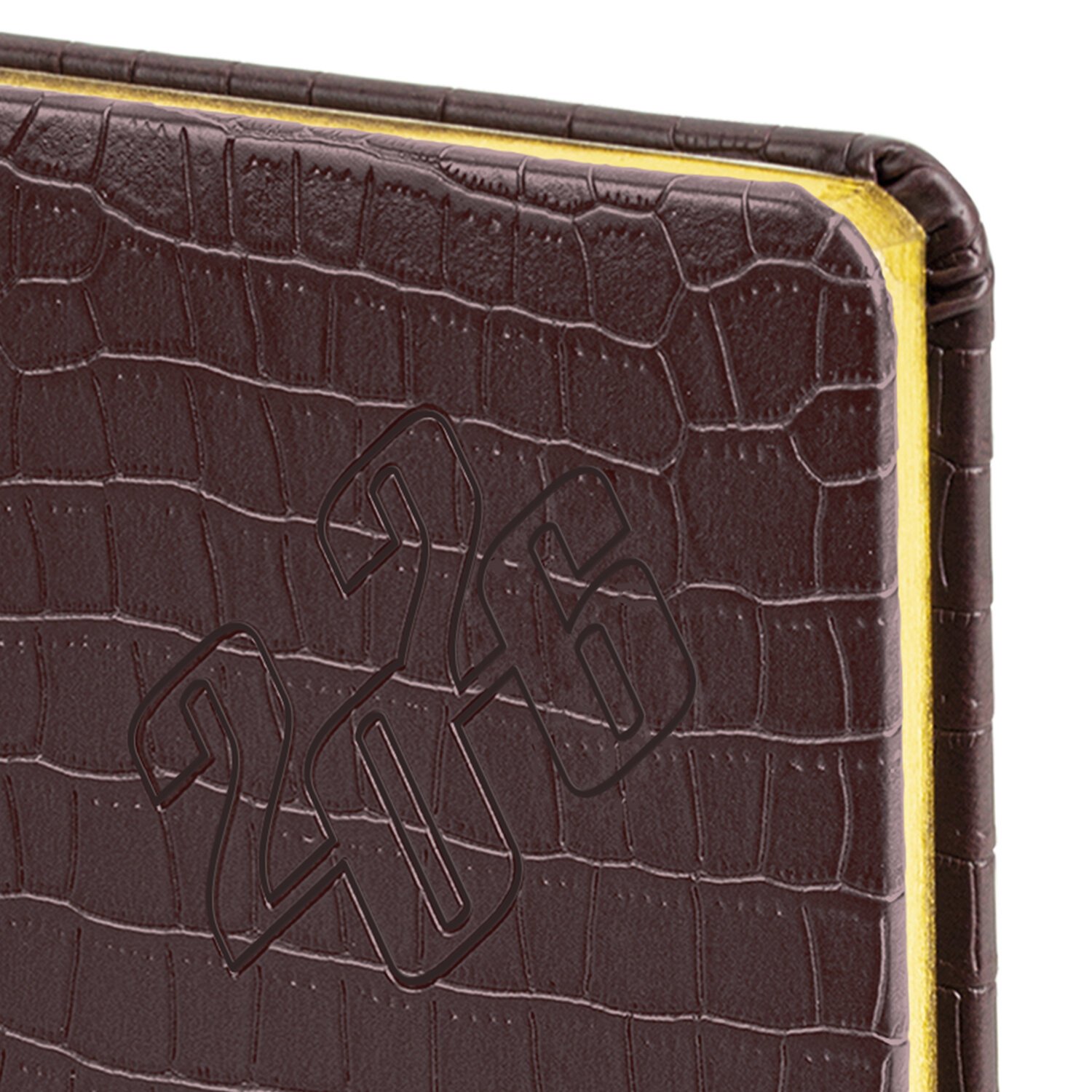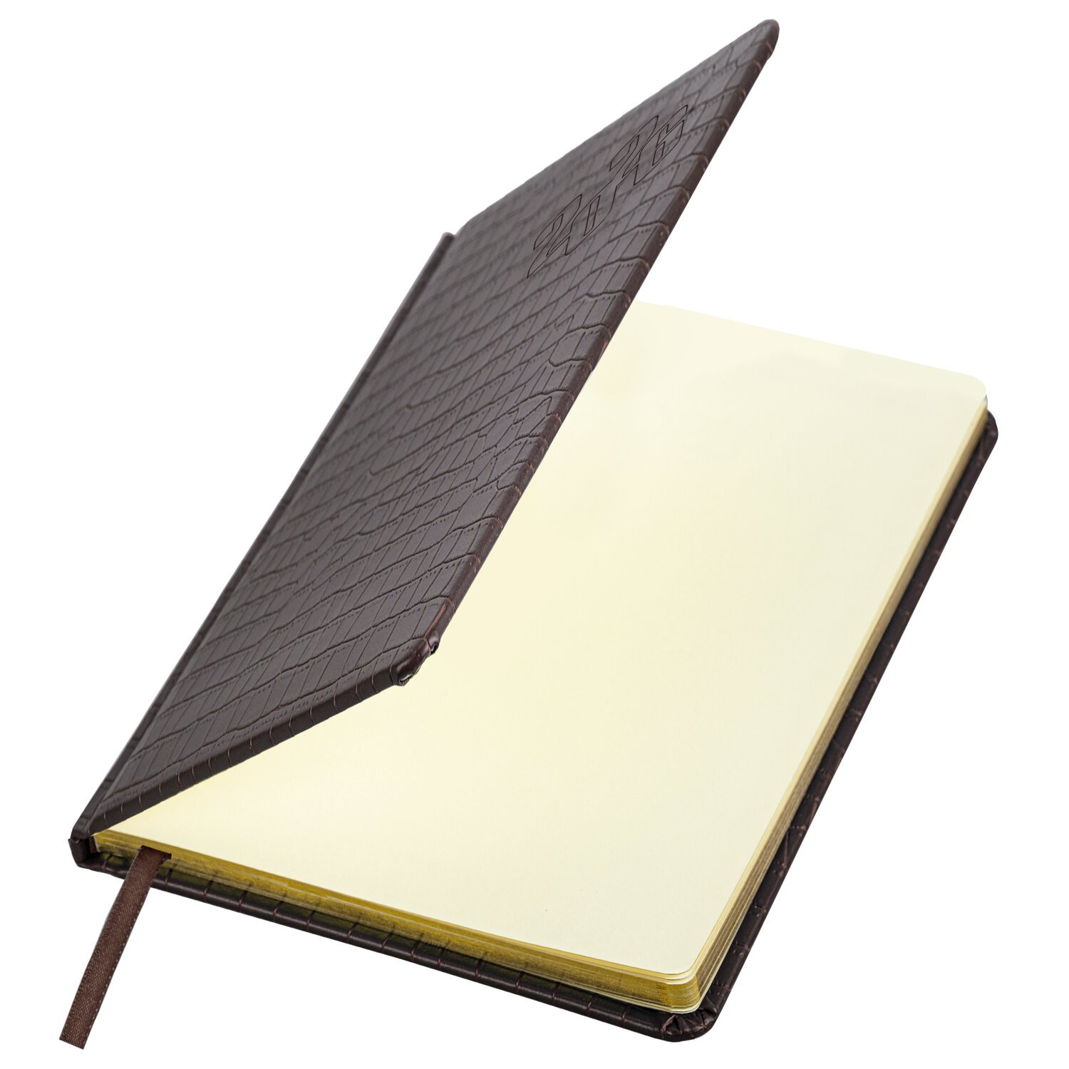 Внутренний блок включает 64 листа тонированной бумаги плотностью 70 г/м2. Благодаря стандартному формату А5 (145х215 мм) еженедельник удобно использовать как в офисе, так и на выездных деловых встречах. Твердая обложка благородного темно-коричневого цвета, стилизованная под кожу крокодила, подходит для горячего тиснения. Срез еженедельника фольгирован золотой фольгой, что придает ему особый шарм. Дополнением является закладка-ляссе, с помощью которой при необходимости можно быстро открыть еженедельник на нужной странице. Для заметок в еженедельнике имеется 7 страниц в конце внутреннего блока. Помимо прочего, еженедельник снабжен обширным справочным материалом.