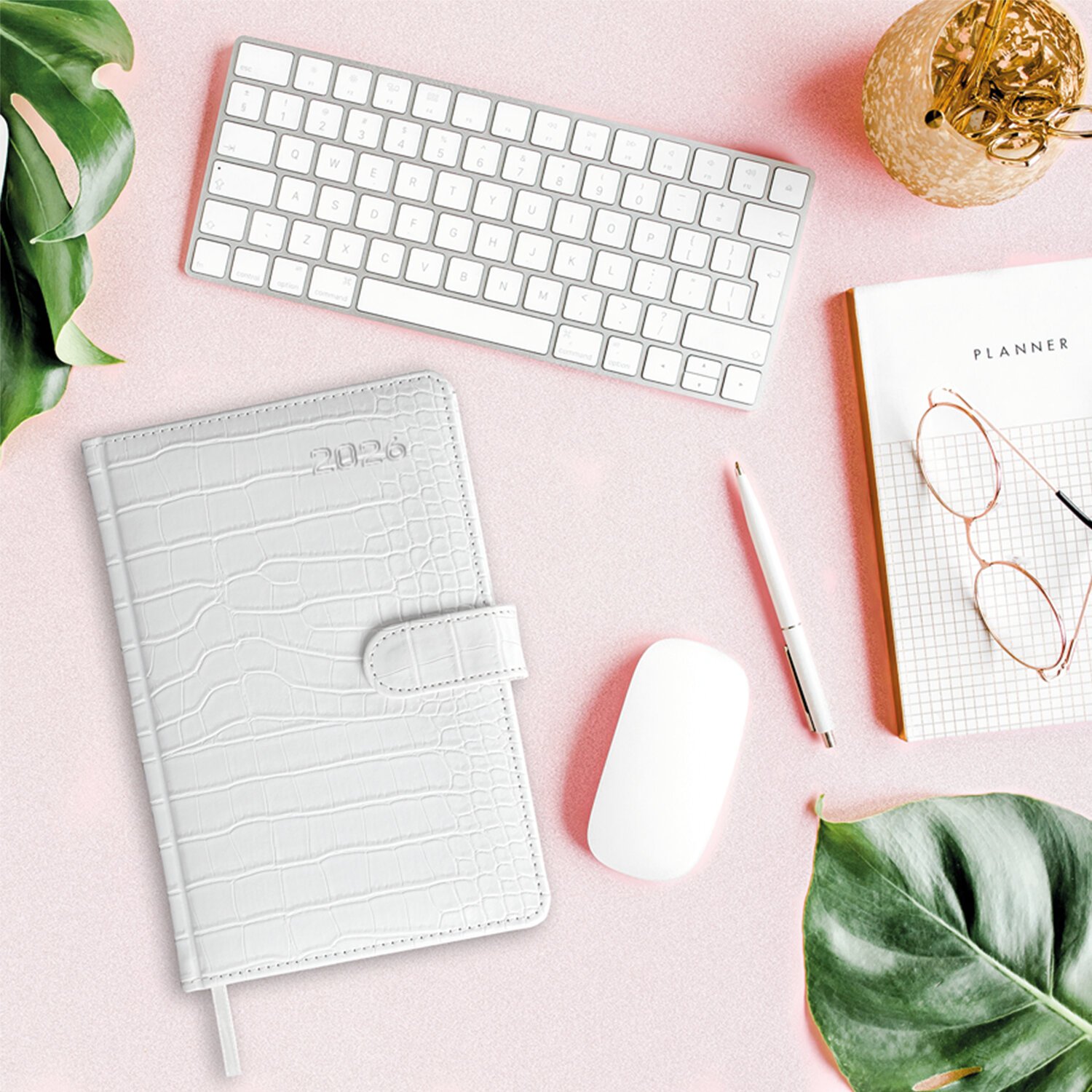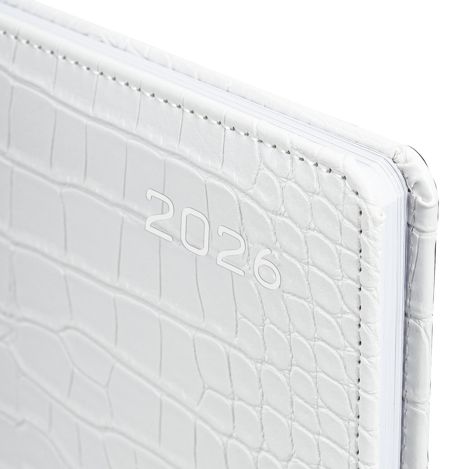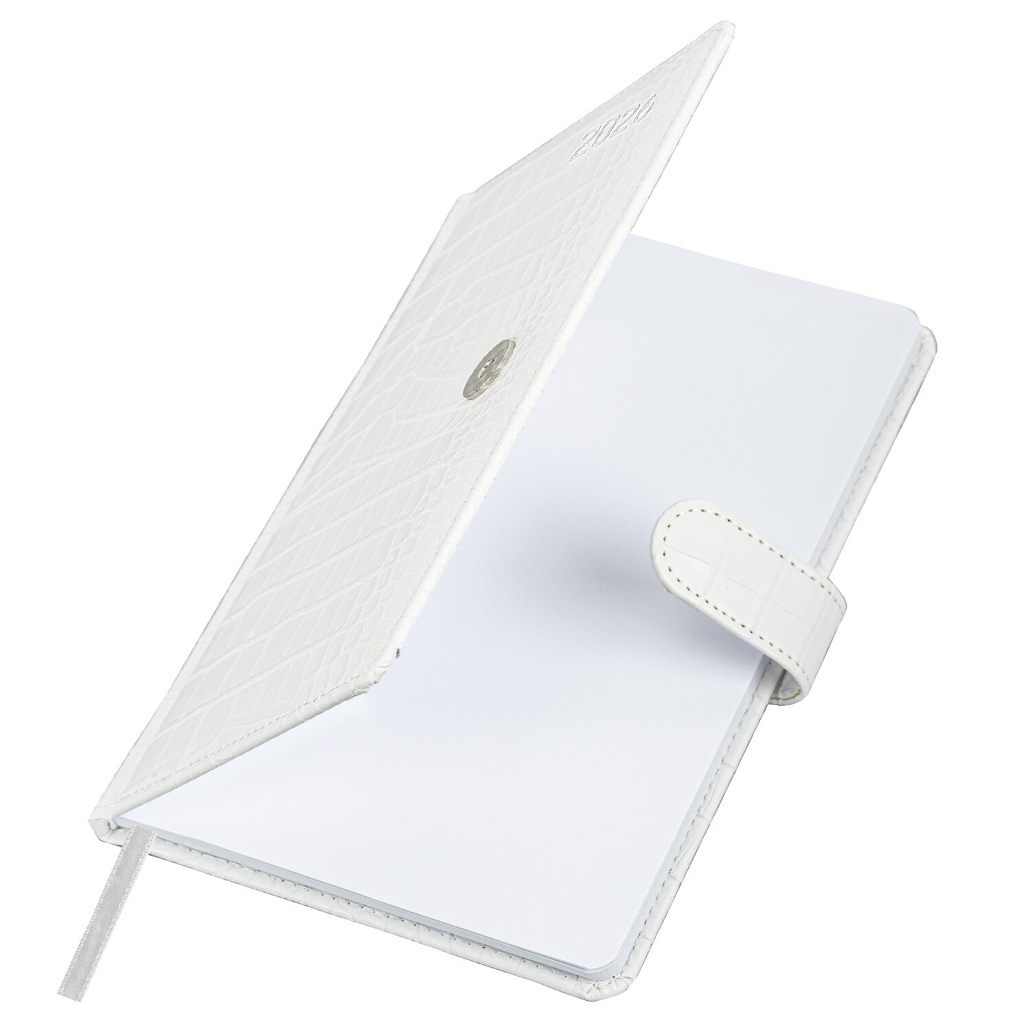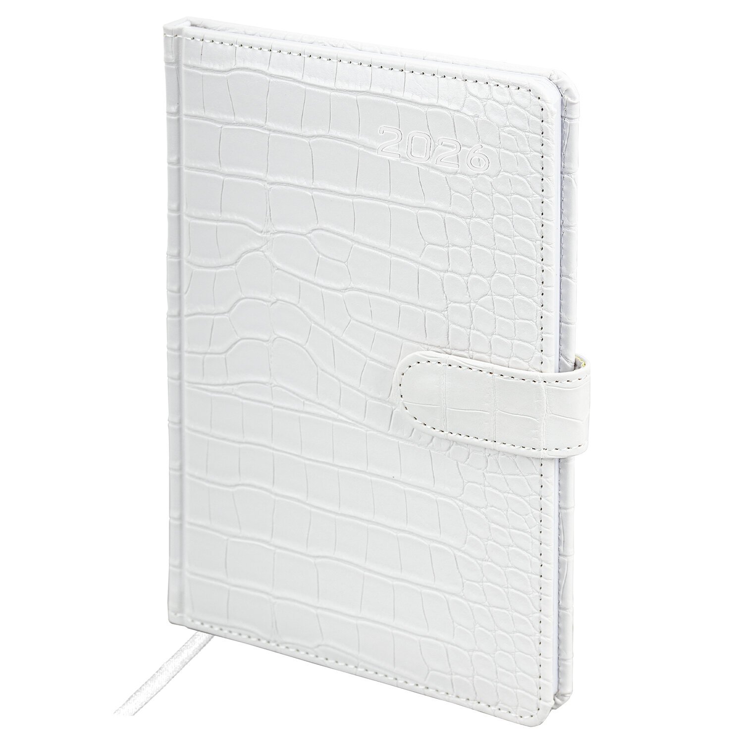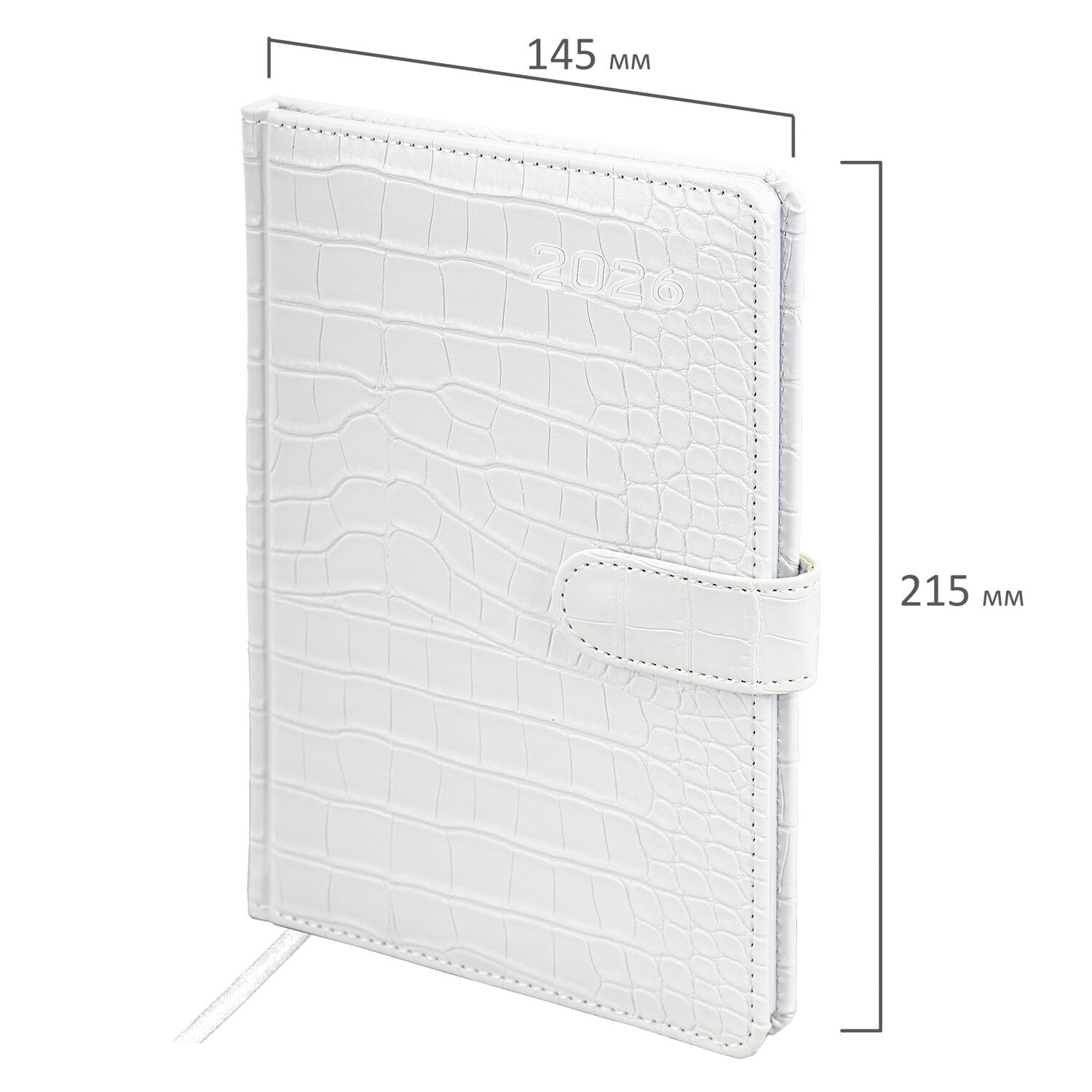 Внутренний блок включает 64 листа белой бумаги плотностью 70 г/м2. Благодаря стандартному формату А5 еженедельник удобно использовать как в офисе, так и на выездных деловых встречах. Твердая обложка, стилизованная под кожу крокодила, фиксируется магнитной застежкой, поэтому еженедельник не откроется в сумке или портфеле и страницы не помнутся. Подходит для горячего тиснения. Дополнением является закладка-ляссе, с помощью которой при необходимости можно быстро открыть еженедельник на нужной странице. Для заметок в еженедельнике имеется 7 страниц в конце внутреннего блока. Еженедельник снабжен обширным справочным материалом. Выполнен в классическом белом цвете.