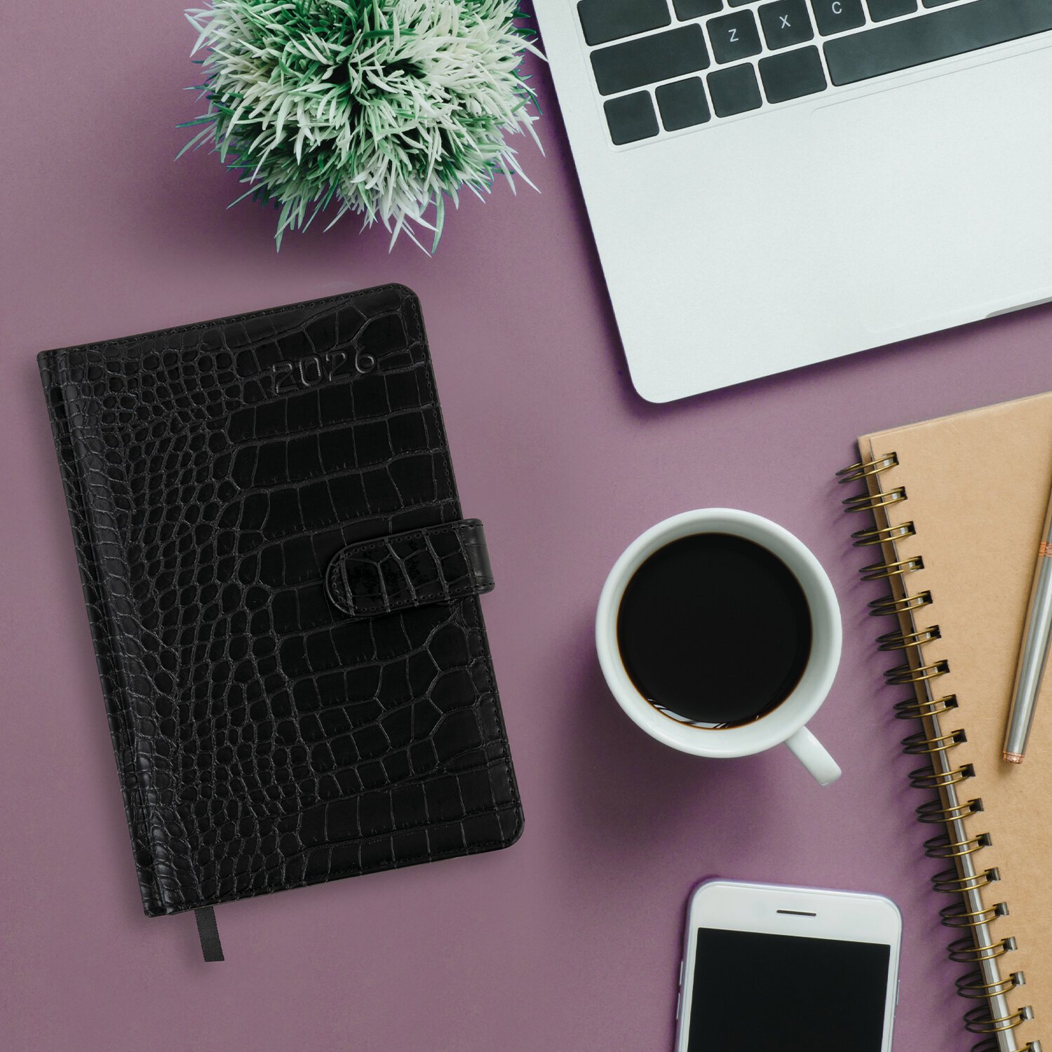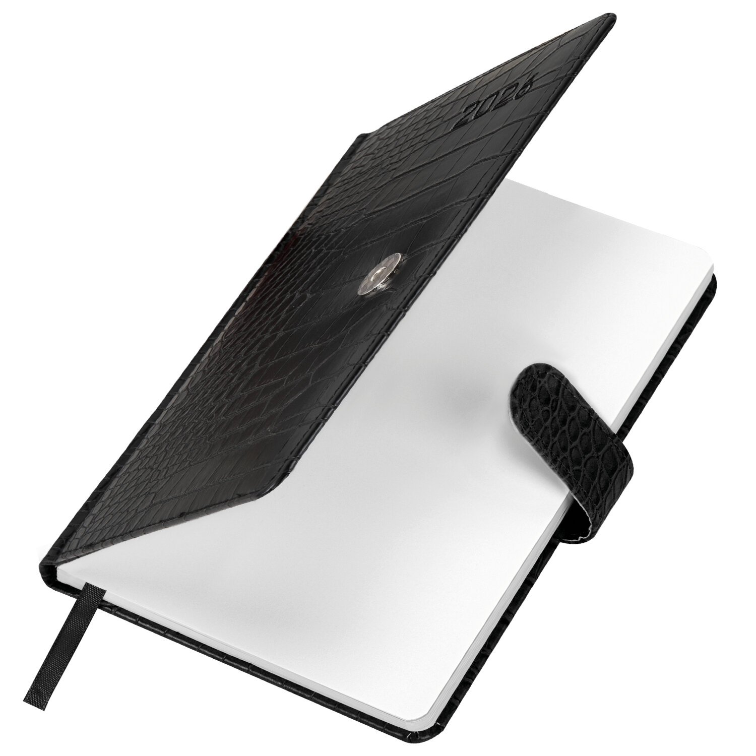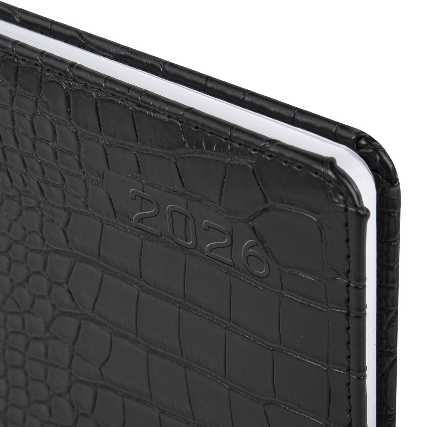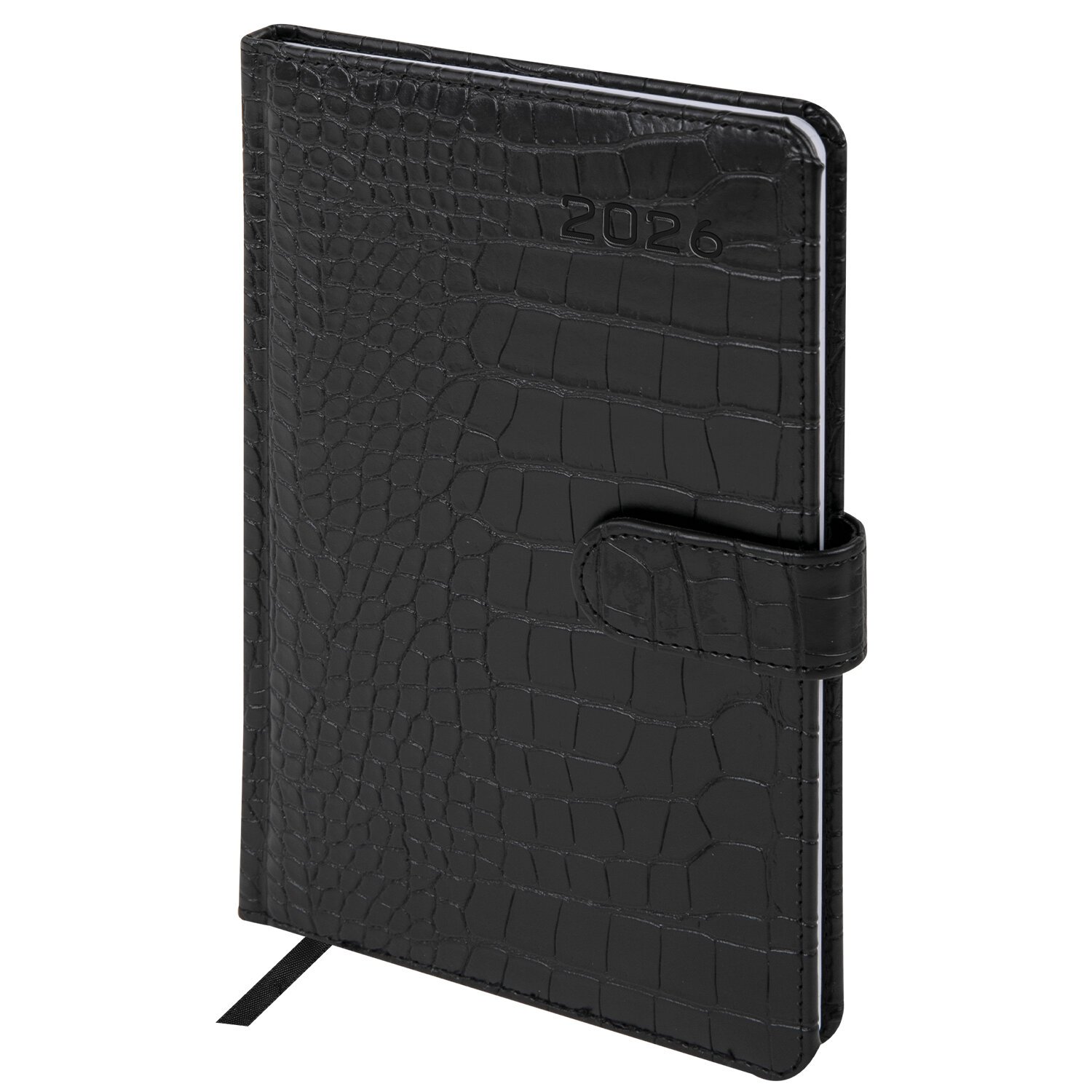Внутренний блок включает 64 листа белой бумаги плотностью 70 г/м2. Благодаря стандартному формату А5 еженедельник удобно использовать как в офисе, так и на выездных деловых встречах. Твердая обложка, стилизованная под кожу крокодила, фиксируется магнитной застежкой, поэтому еженедельник не откроется в сумке или портфеле и страницы не помнутся. Подходит для горячего тиснения. Дополнением является закладка-ляссе, с помощью которой при необходимости можно быстро открыть еженедельник на нужной странице. Для заметок в еженедельнике имеется 7 страниц в конце внутреннего блока. Еженедельник снабжен обширным справочным материалом. Выполнен в классическом черном цвете.
