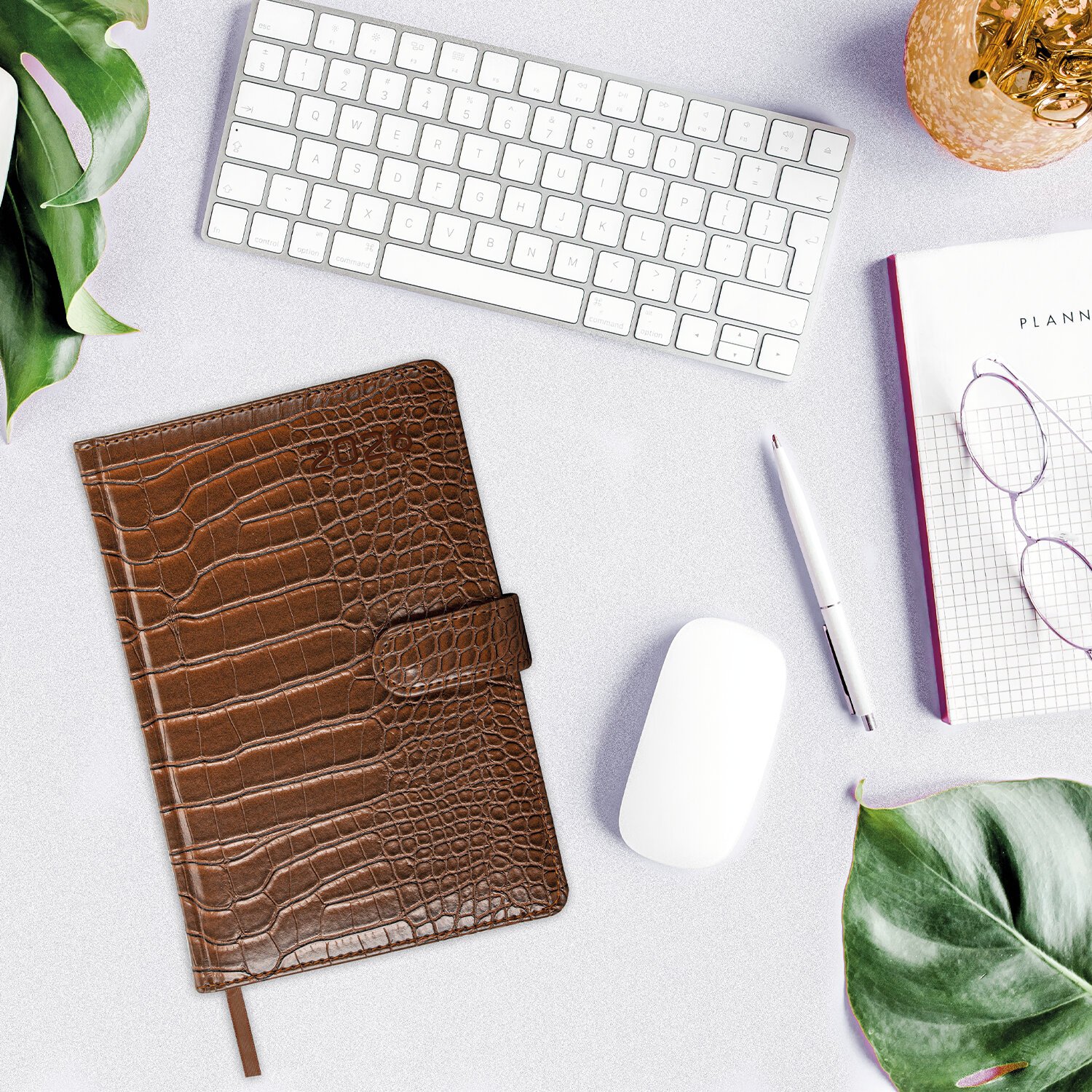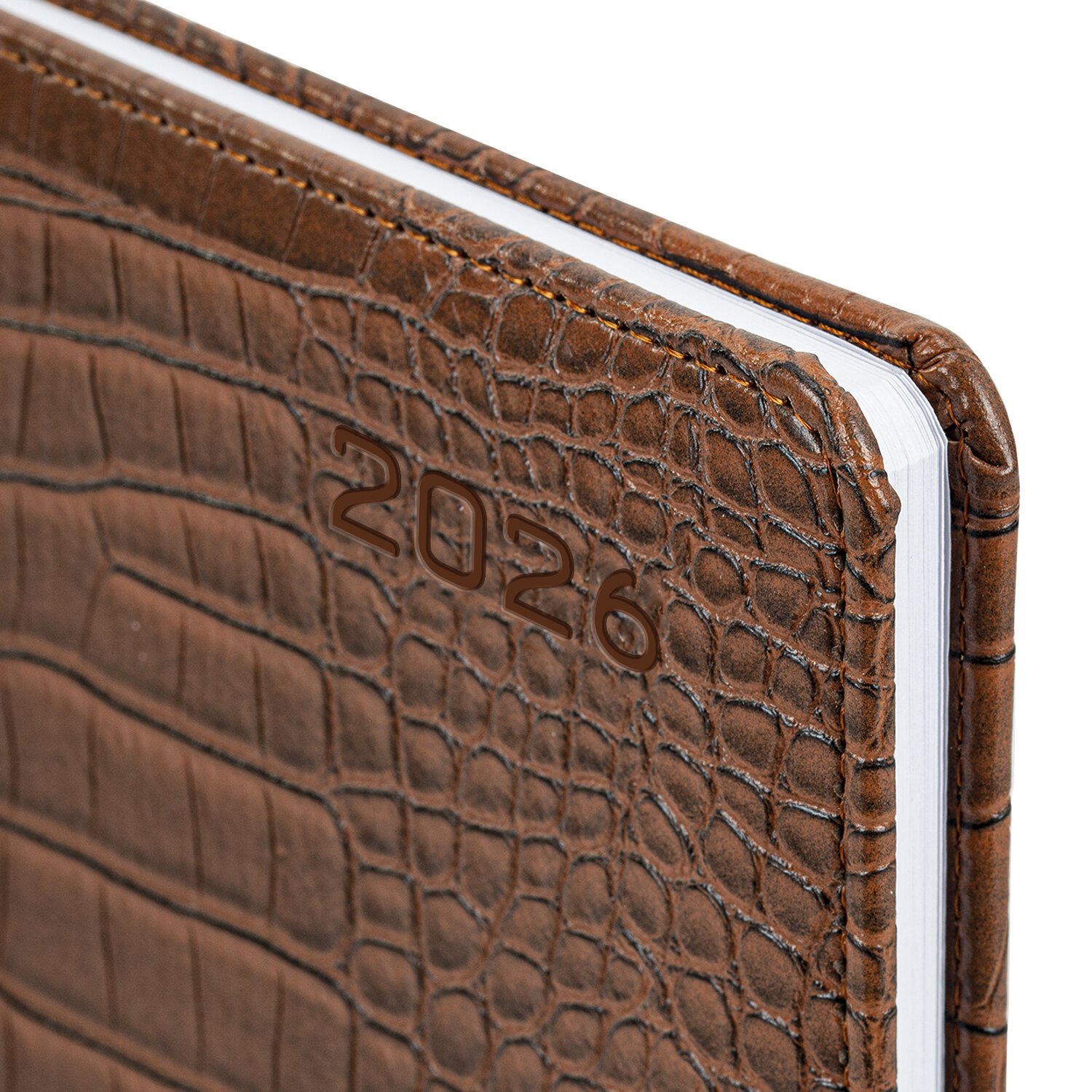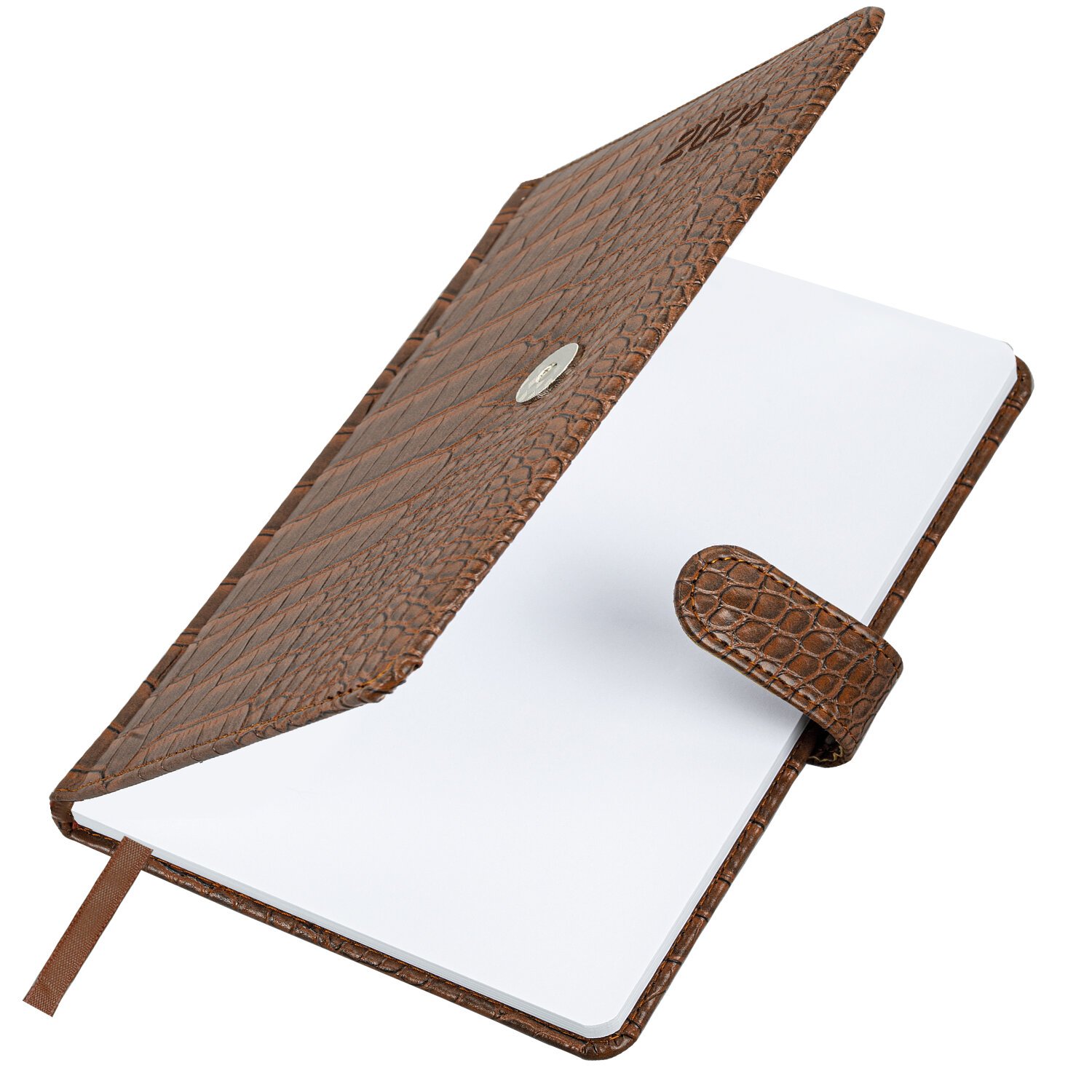 Внутренний блок включает 64 листа белой бумаги плотностью 70 г/м2. Благодаря стандартному формату А5 еженедельник удобно использовать как в офисе, так и на выездных деловых встречах. Твердая обложка, стилизованная под кожу крокодила благородного коричневого цвета, фиксируется магнитной застежкой, поэтому еженедельник не откроется в сумке или портфеле и страницы не помнутся. Подходит для горячего тиснения. Дополнением является закладка-ляссе, с помощью которой при необходимости можно быстро открыть еженедельник на нужной странице. Для заметок в еженедельнике имеется 7 страниц в конце внутреннего блока. Еженедельник снабжен обширным справочным материалом.