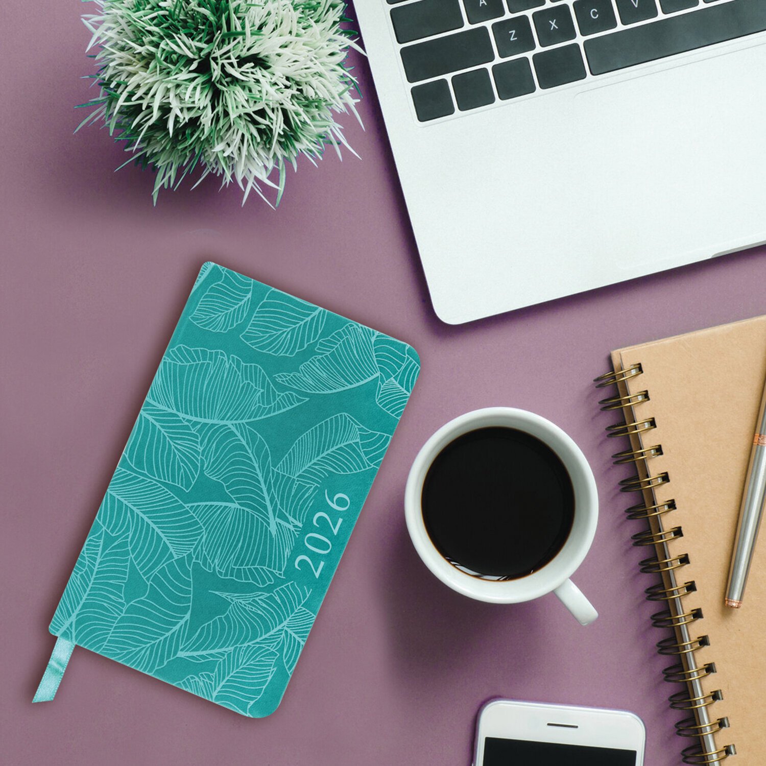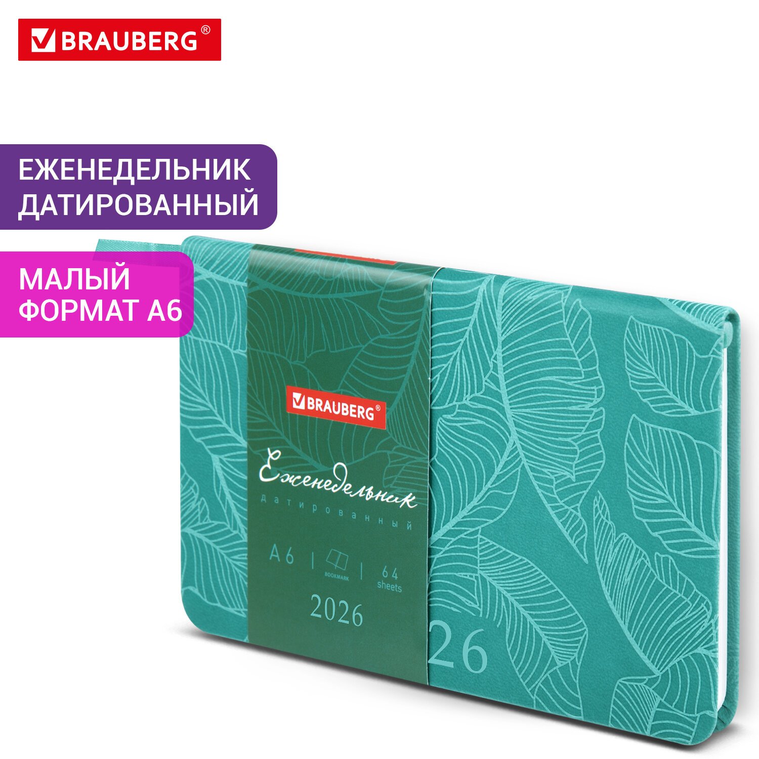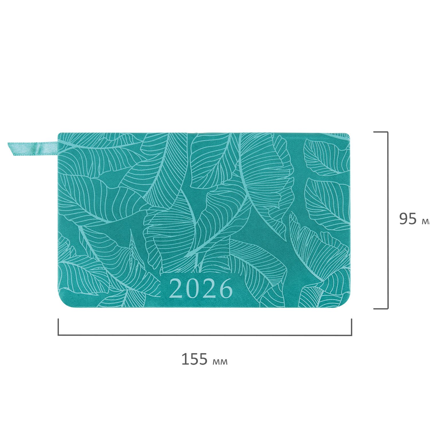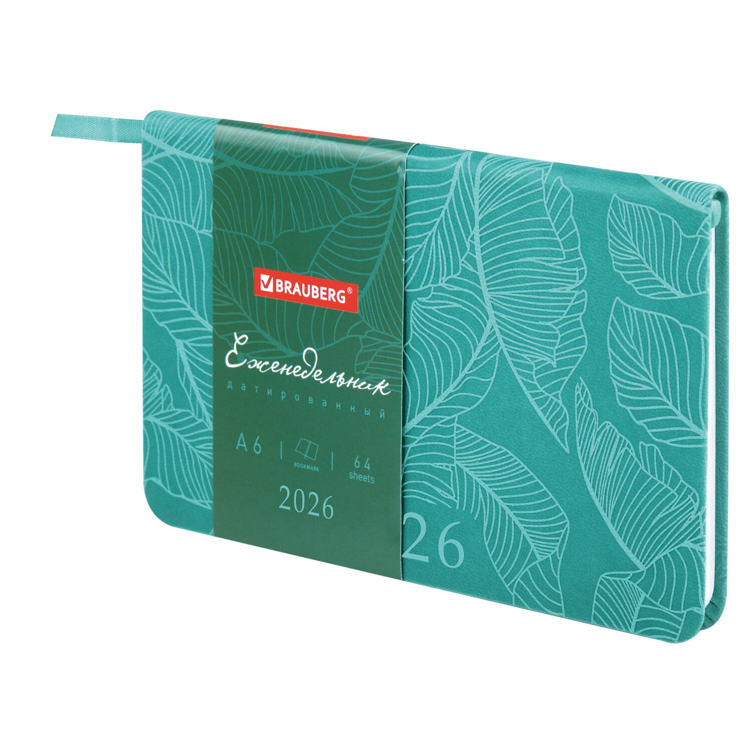 Еженедельник датированный 2026 МАЛЫЙ ФОРМАТ 95х155мм А6 BRAUBERG Foliage, под кожу, бирюза, 117197