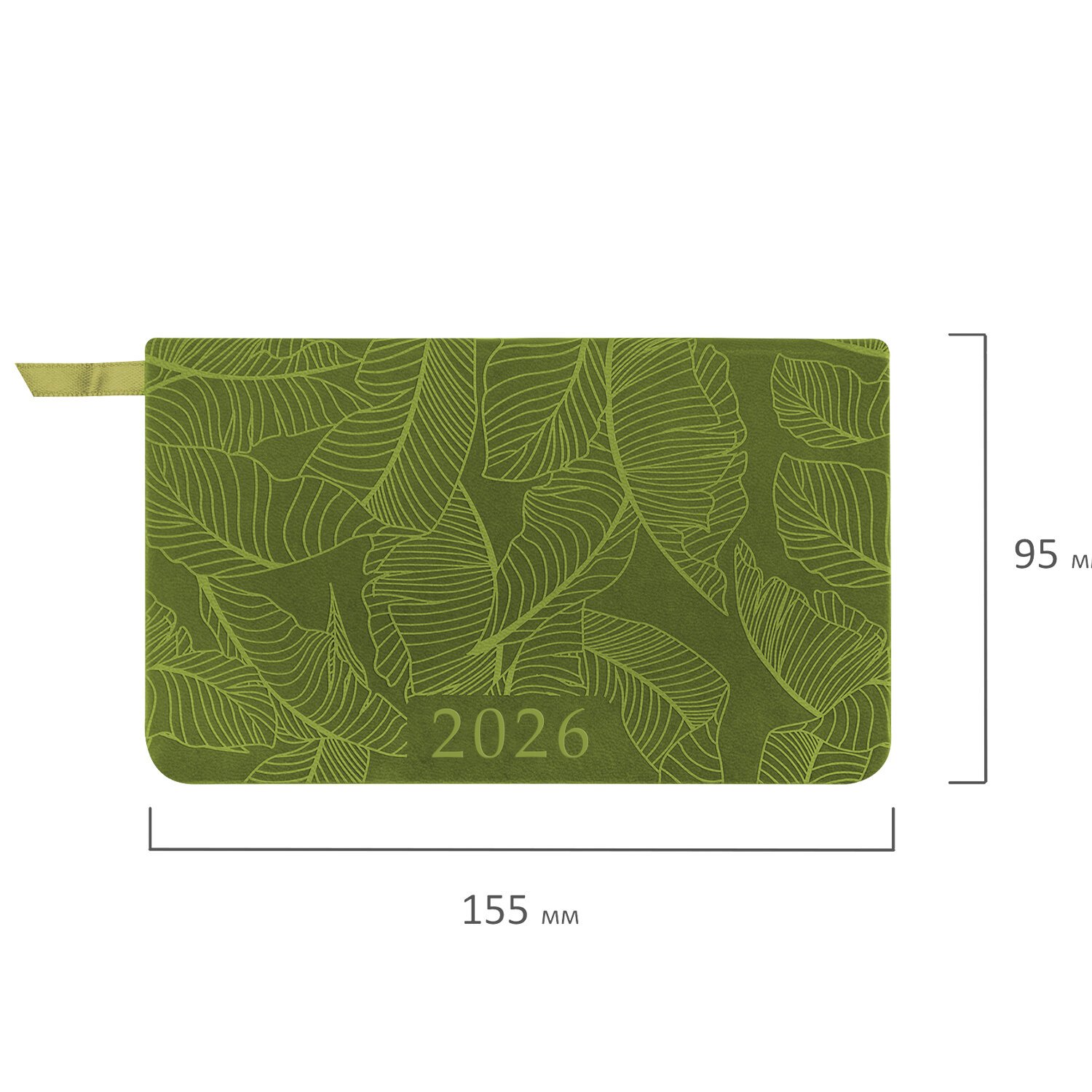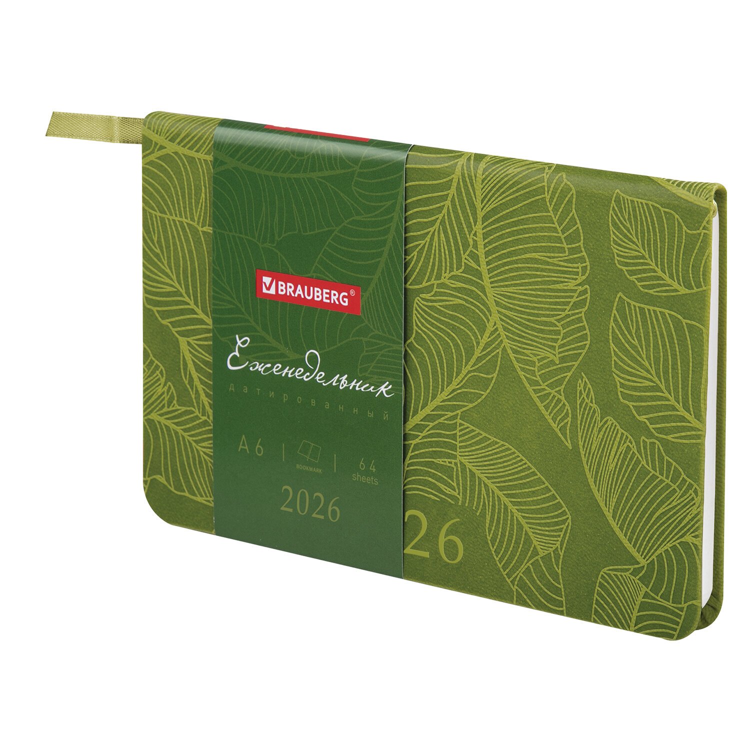 Еженедельник датированный 2026 МАЛЫЙ ФОРМАТ 95х155мм А6 BRAUBERG Foliage, под кожу, зеленый, 117198