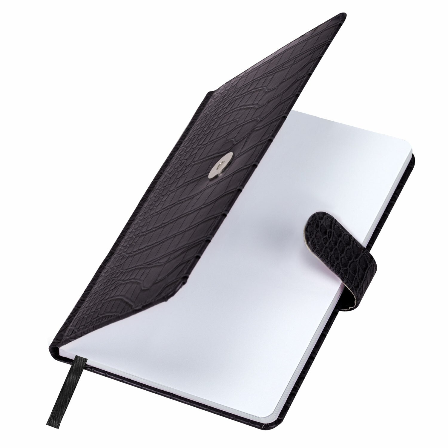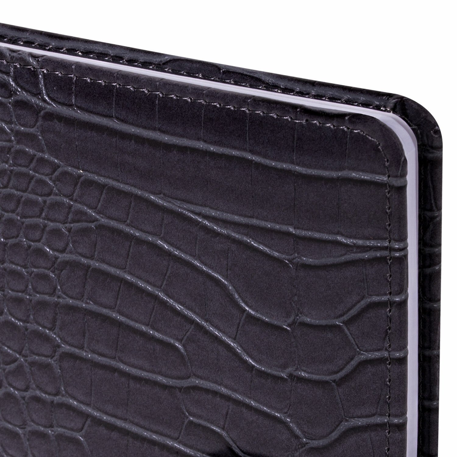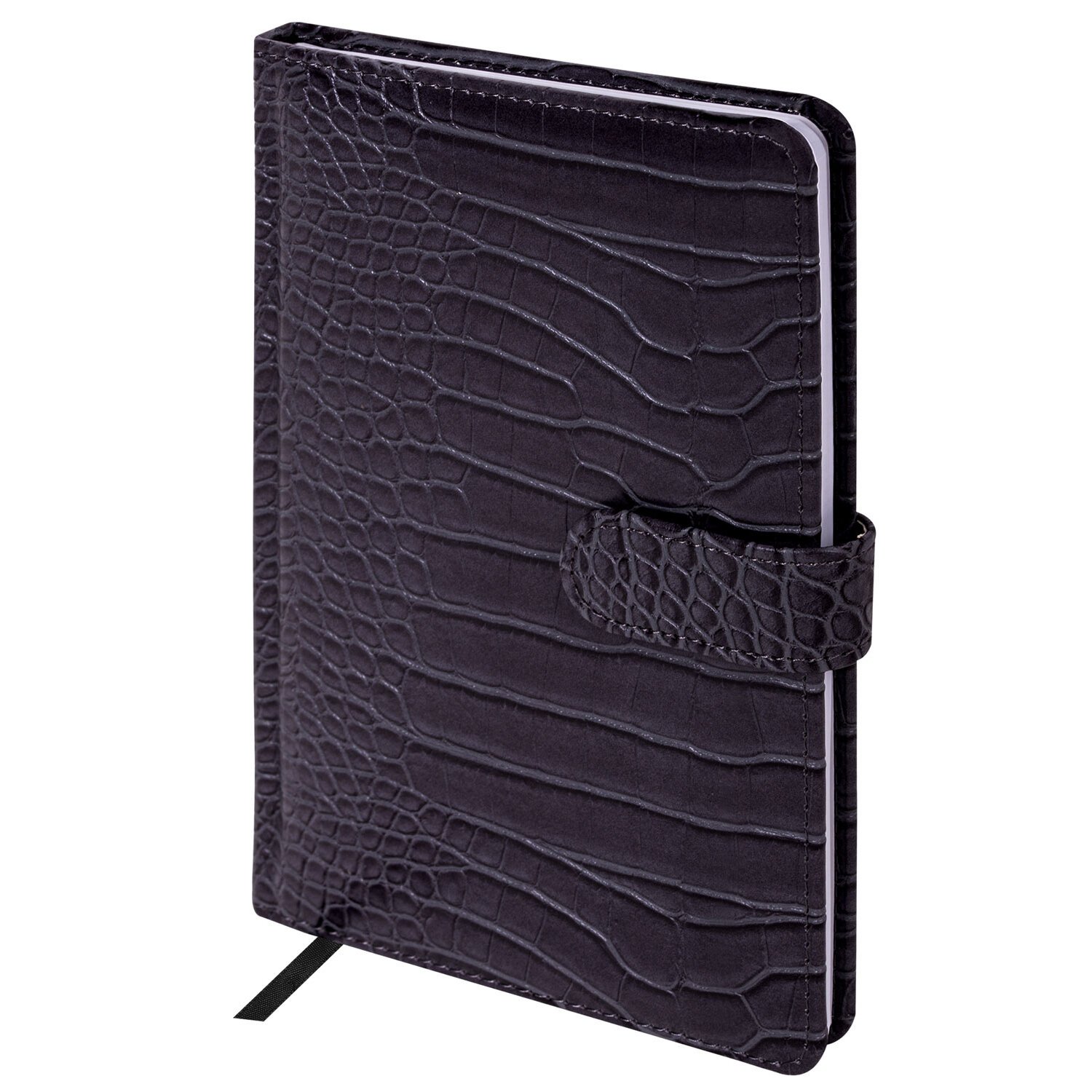 Внутренний блок включает 64 листа тонированной бумаги плотностью 70 г/м2. Благодаря стандартному формату А5 еженедельник удобно использовать как в офисе, так и на выездных деловых встречах. Твердая обложка, стилизованная под кожу крокодила, фиксируется магнитной застежкой, поэтому еженедельник не откроется в сумке или портфеле и страницы не помнутся. Подходит для горячего тиснения. Дополнением является закладка-ляссе, с помощью которой при необходимости можно быстро открыть еженедельник на нужной странице. Помимо прочего, еженедельник снабжен обширным справочным материалом. Выполнен в черном цвете.