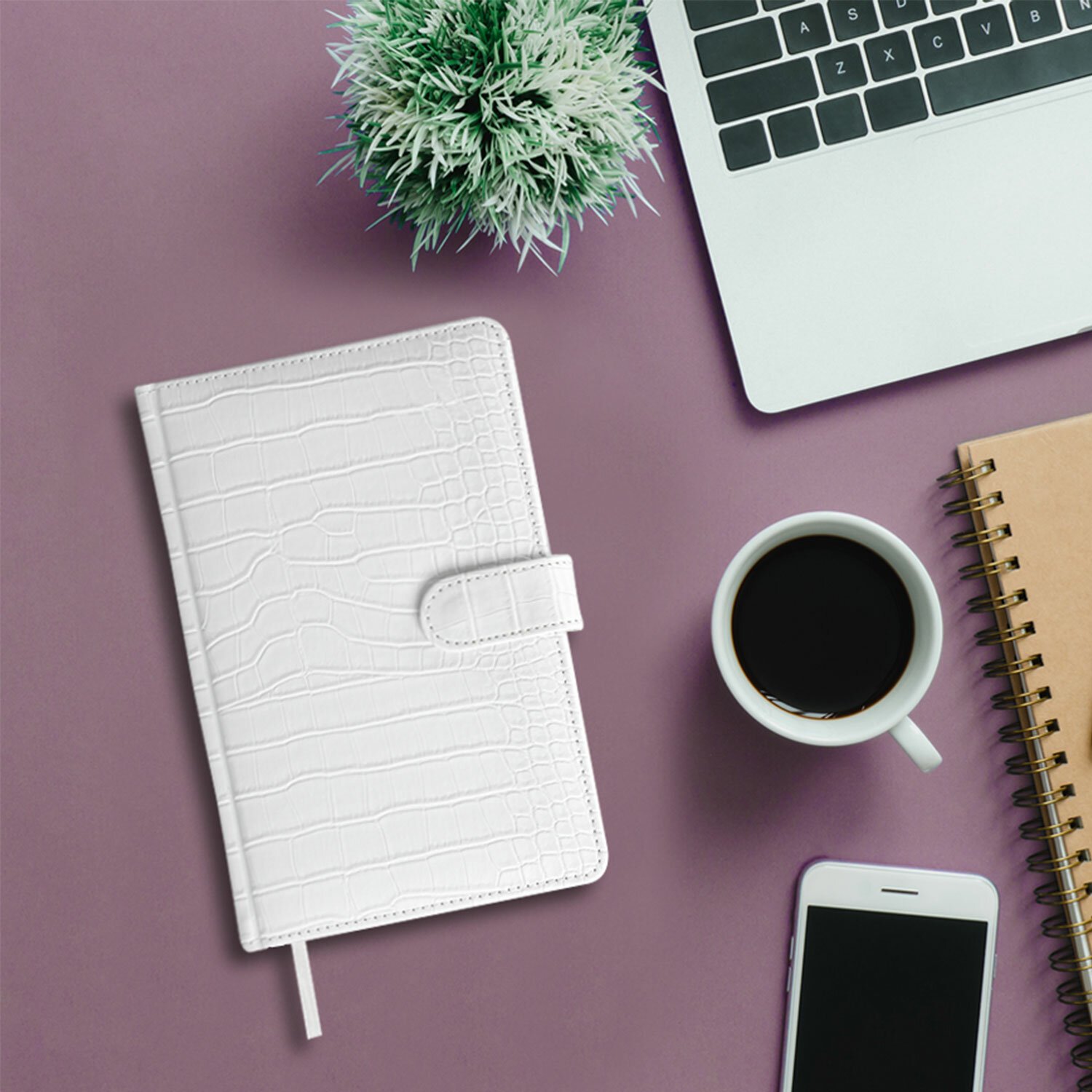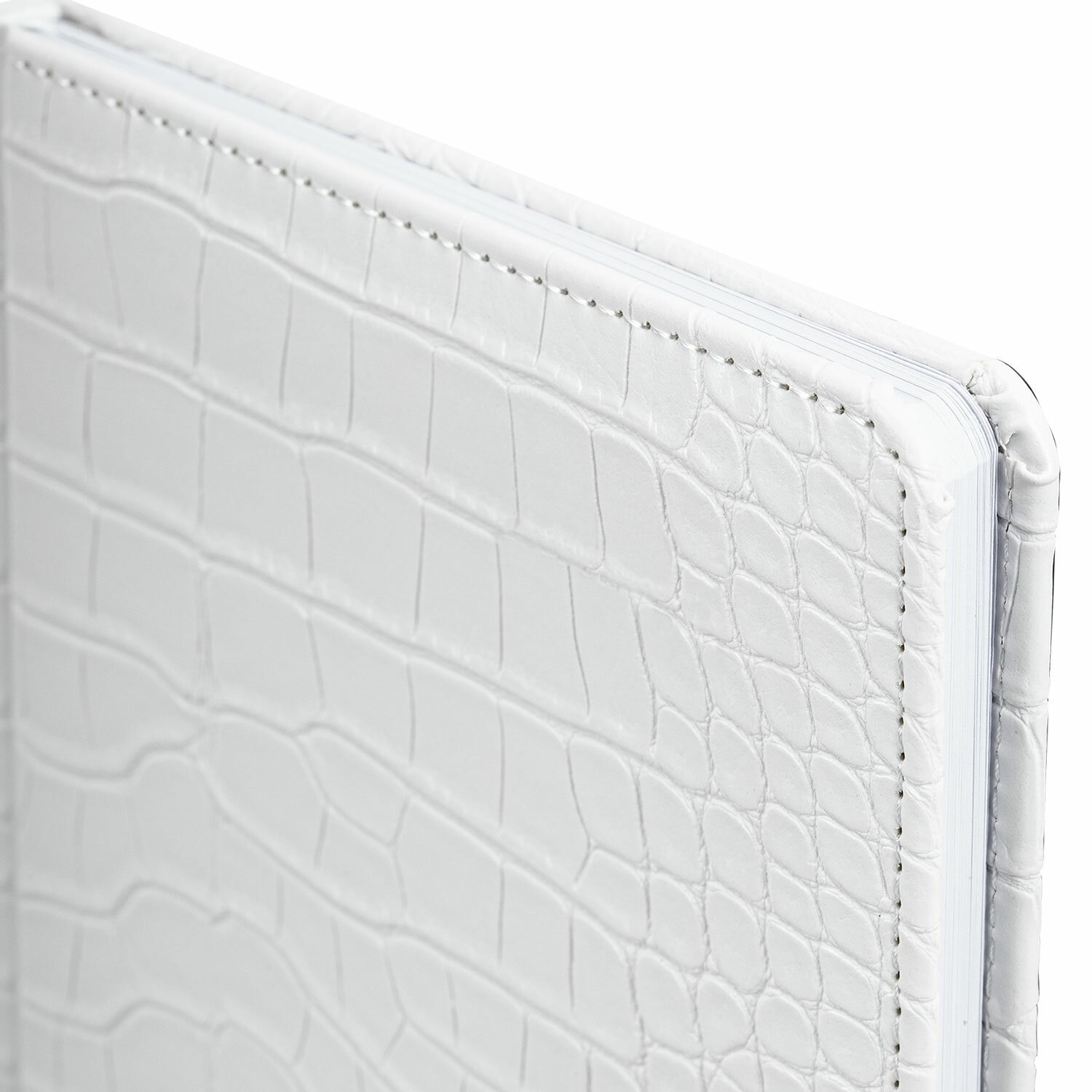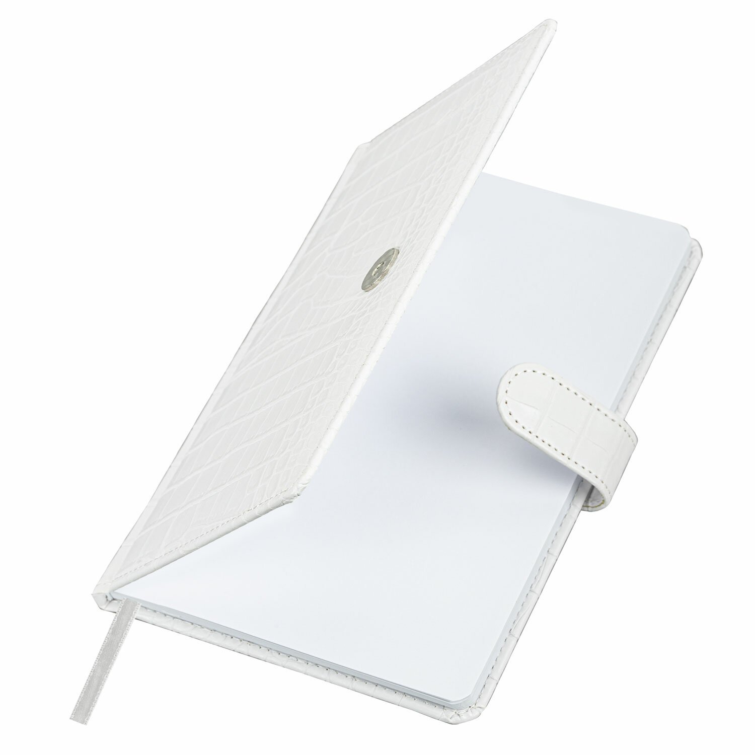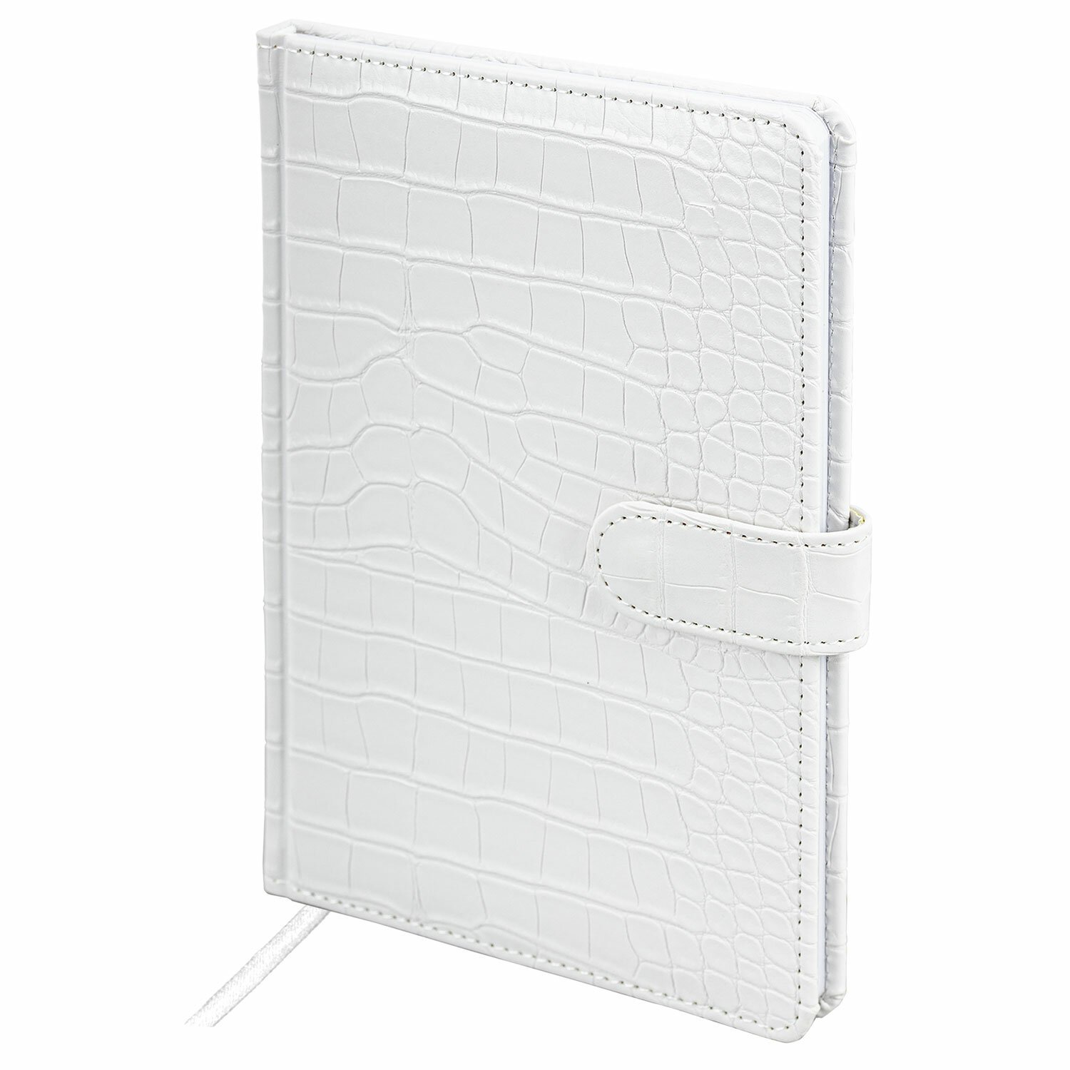 Внутренний блок включает 64 листа тонированной бумаги плотностью 70 г/м2. Благодаря стандартному формату А5 еженедельник удобно использовать как в офисе, так и на выездных деловых встречах. Твердая обложка, стилизованная под кожу крокодила, фиксируется магнитной застежкой, поэтому еженедельник не откроется в сумке или портфеле и страницы не помнутся. Подходит для горячего тиснения. Дополнением является закладка-ляссе, с помощью которой при необходимости можно быстро открыть еженедельник на нужной странице. Помимо прочего, еженедельник снабжен обширным справочным материалом. Выполнен в белом цвете.