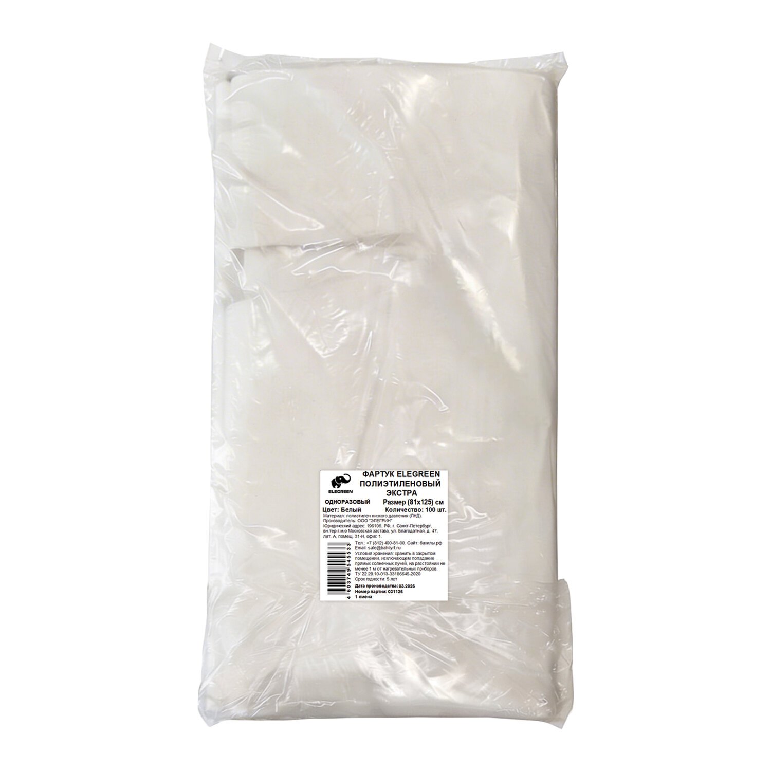 Фартуки полиэтиленовые, КОМПЛЕКТ 100шт, одноразовые, ЭКСТРА, 81х125, 15мкм, ELEGREEN,, ФКб-Пэ81/125Эк