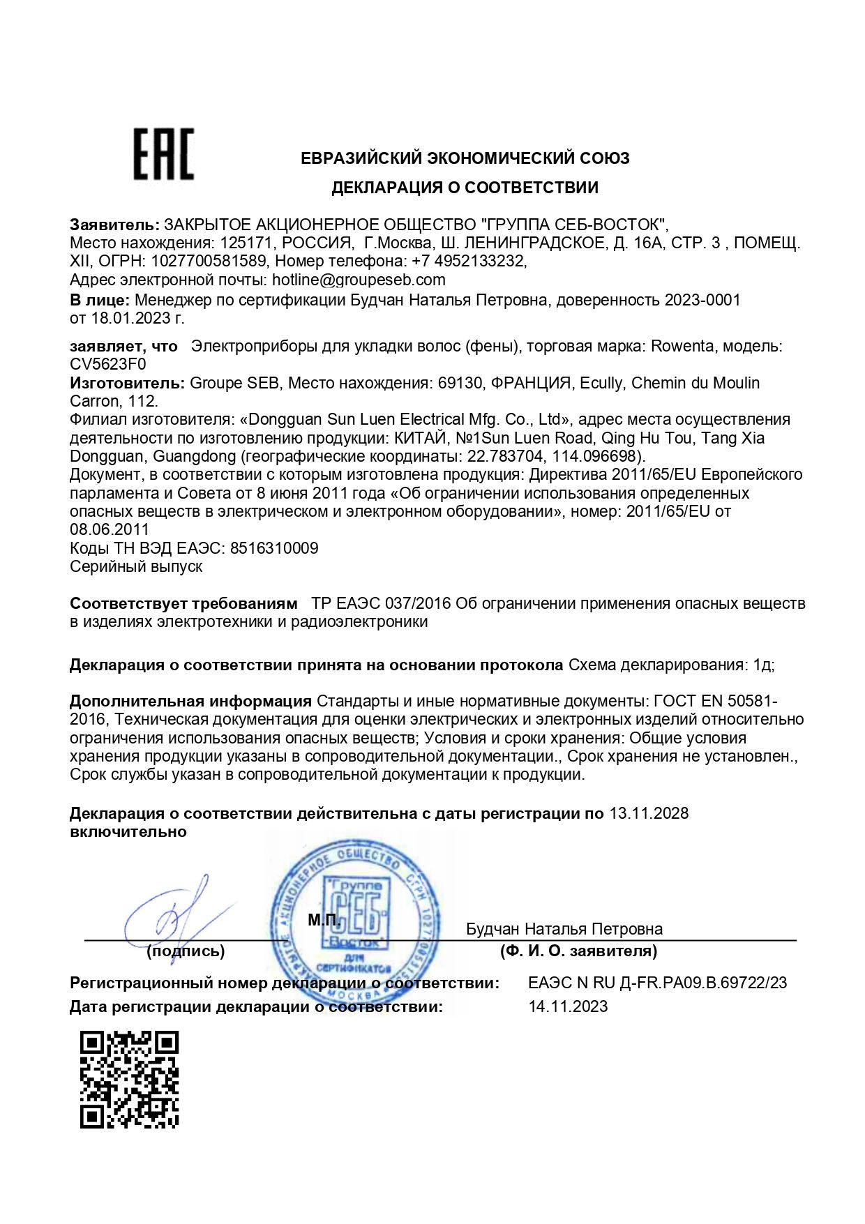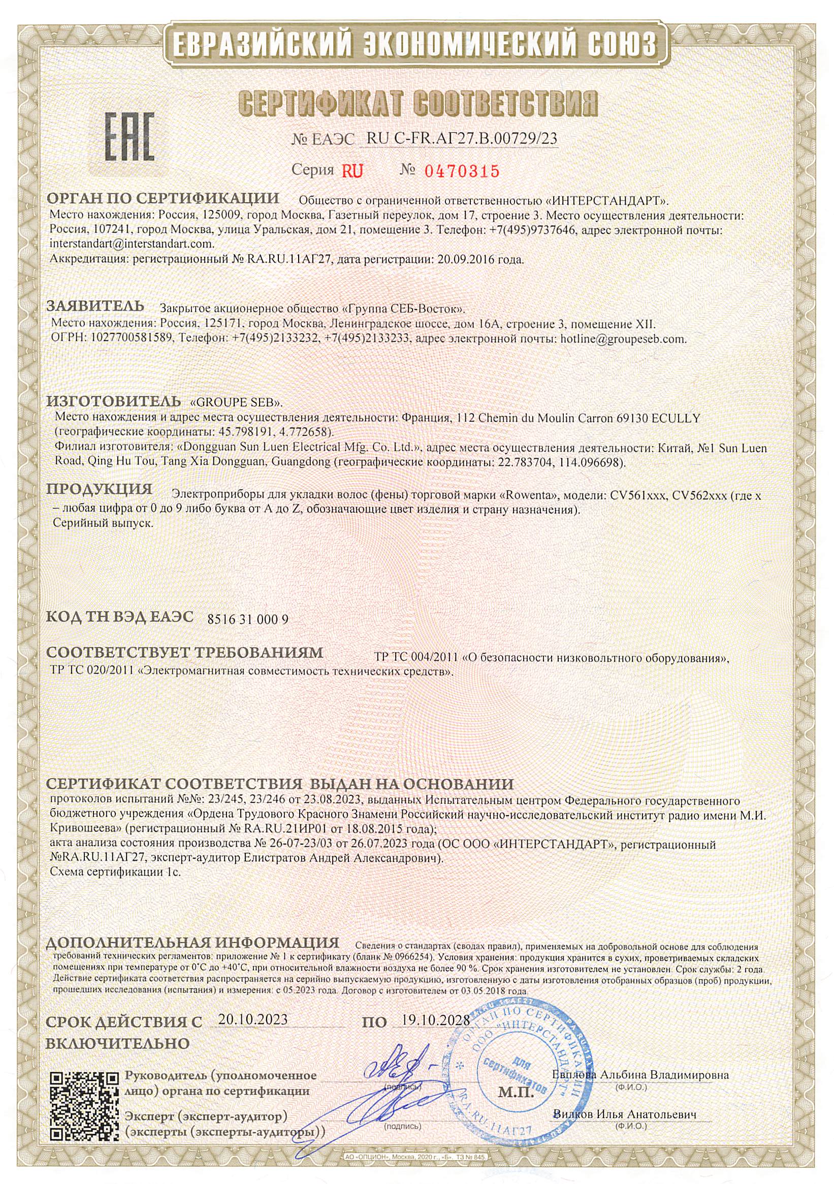 Фен ROWENTA CV5623F0, мощность 2200 Вт, 2 скорости, 3 температурных режима, черный, 1830008470