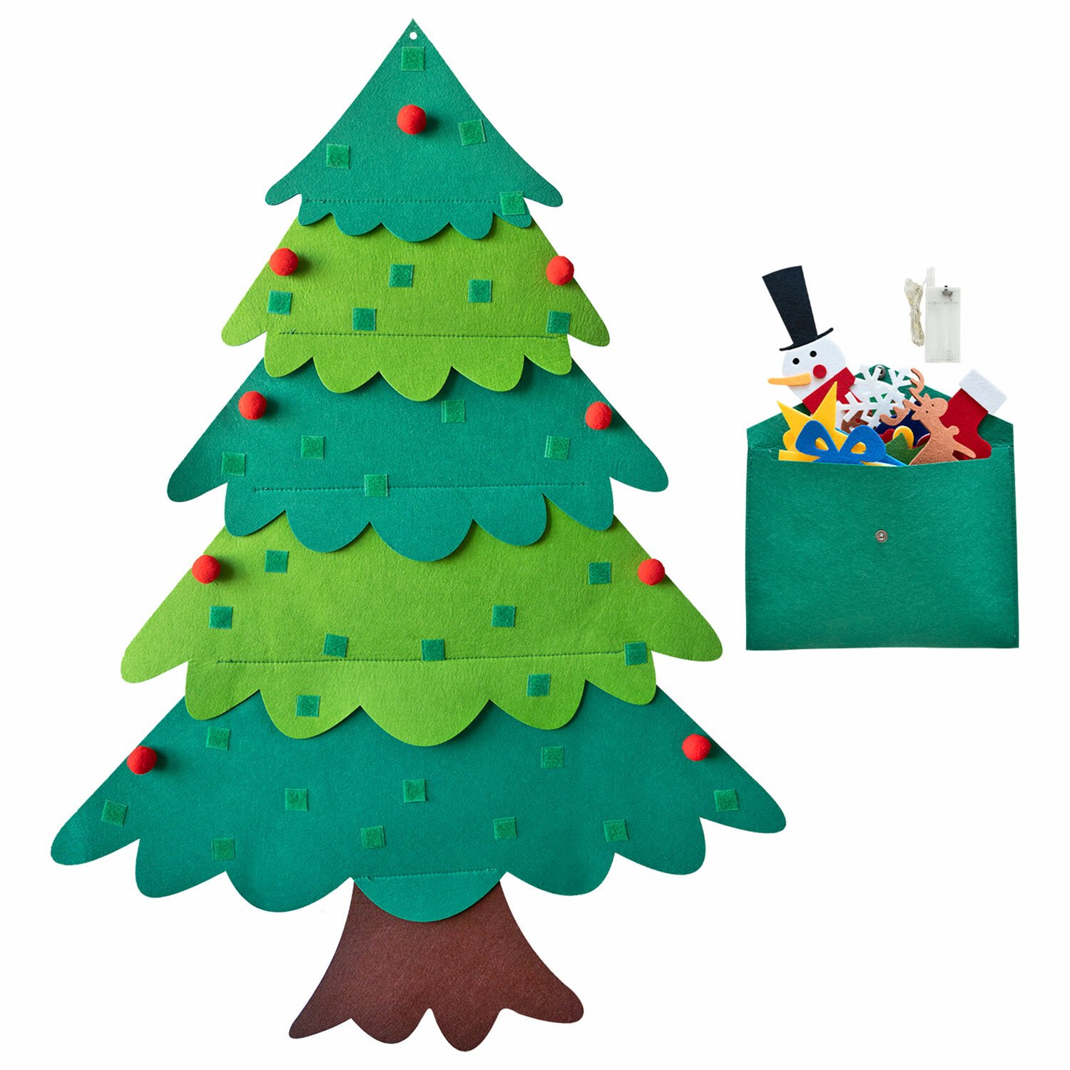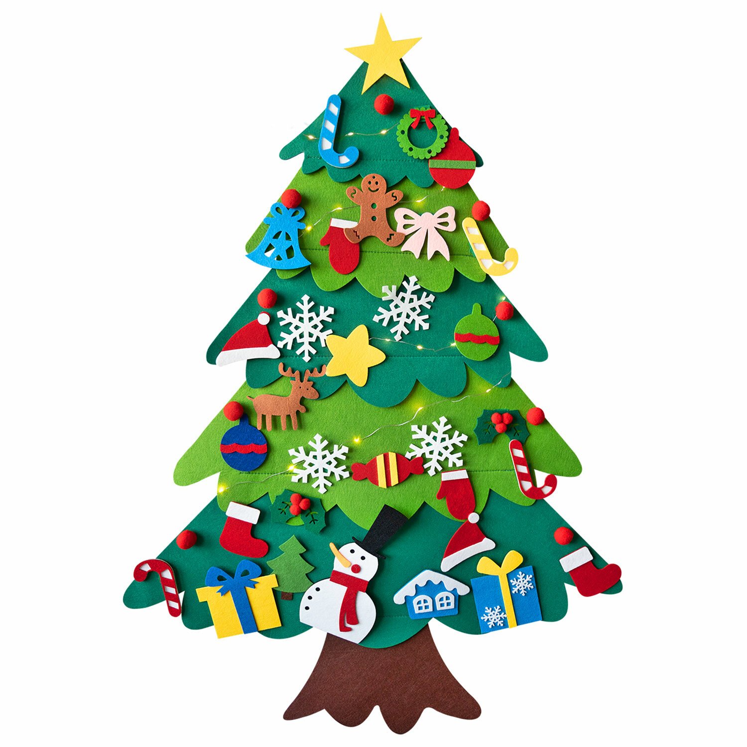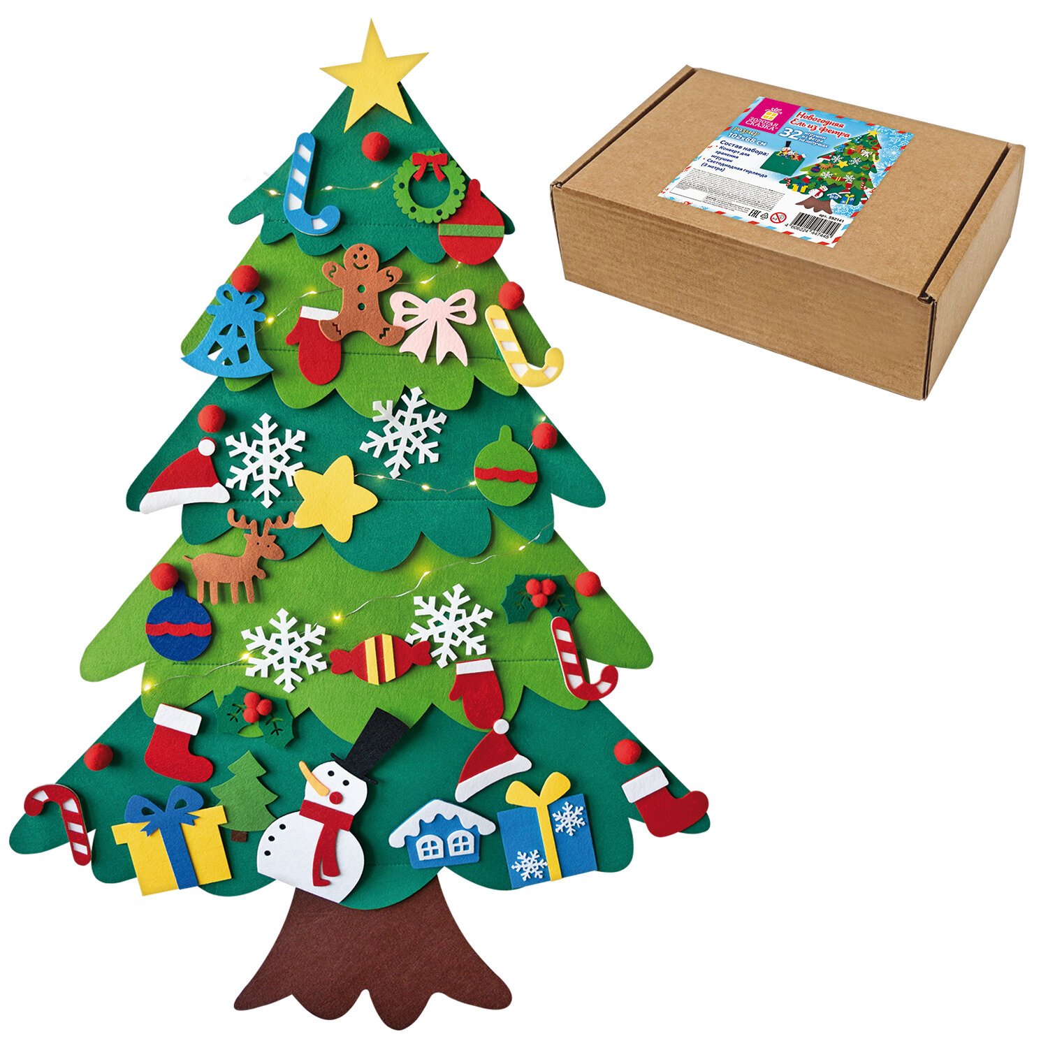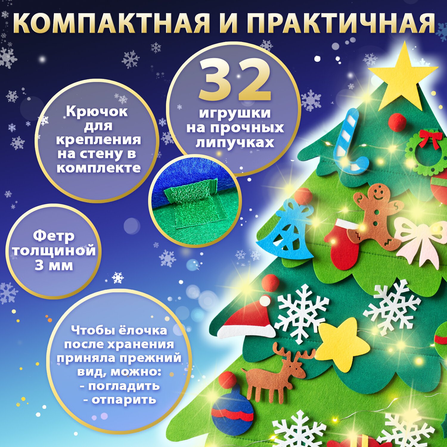 • 32 игрушки из фетра разной формы на прочных липучках и светодиодная гирлянда 3 м – ими можно украсить елочку;