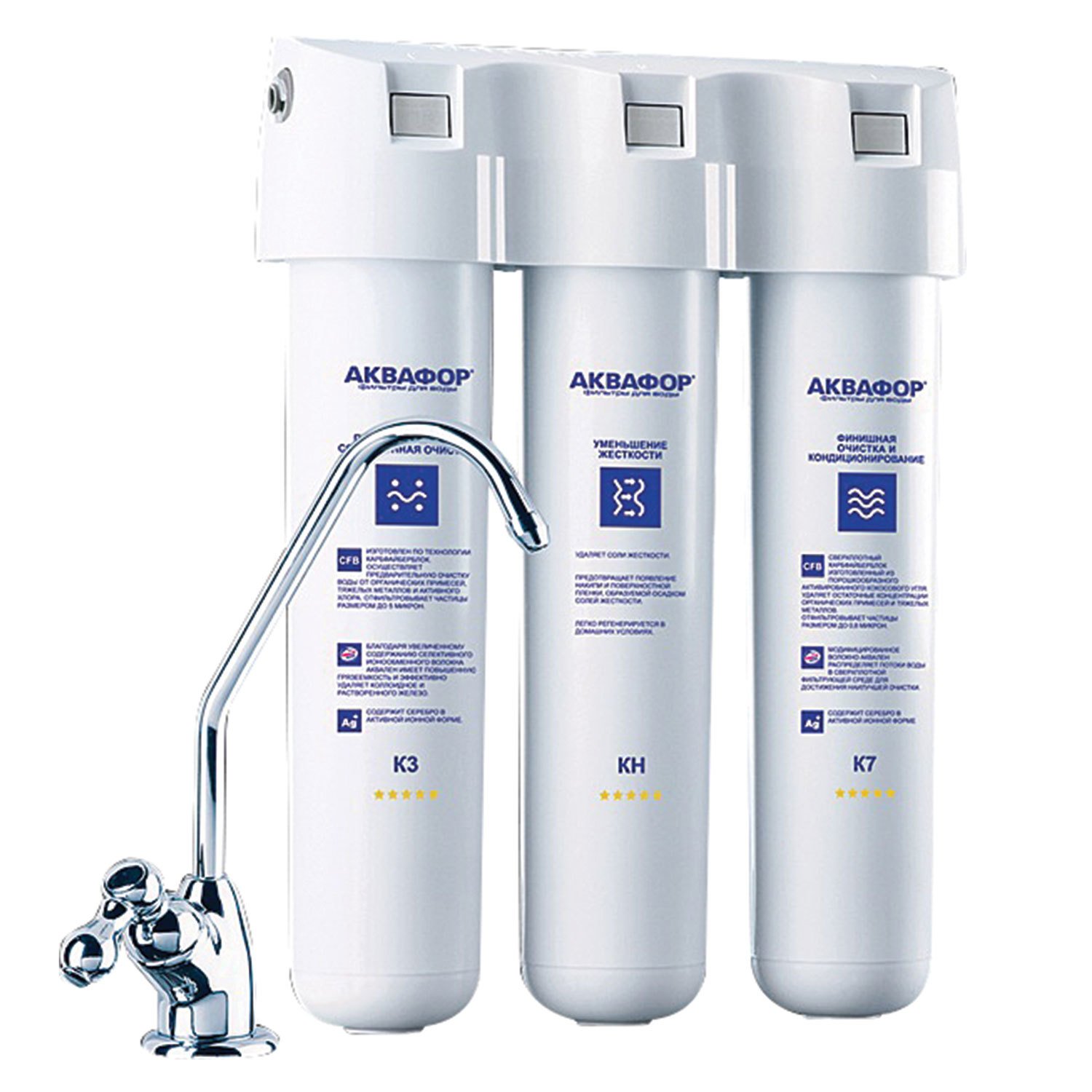 Блок предварительной очистки задерживает частицы размером от 5 микрон, второй – умягчает воду, избавляя от хлопьев в чайнике, а третий обеспечивает финишную очистку от частиц до 0,8 микрон (что в 125 раз тоньше человеческого волоса).