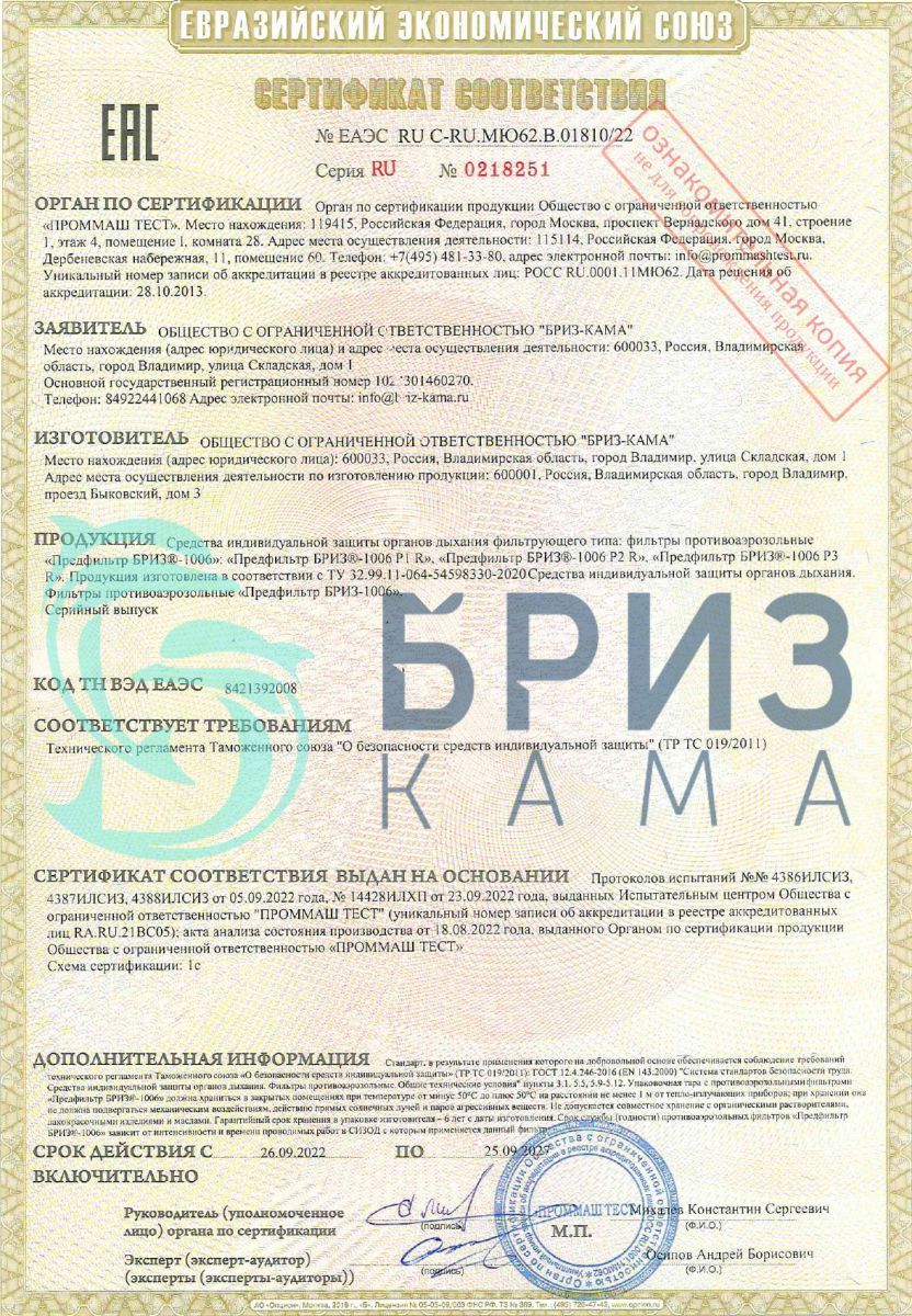Фильтры БРИЗ®-1006 имеют заключение Министерства промышленности и торговли Российской Федерации о подтверждении производства средств индивидуальной защиты на территории РФ.