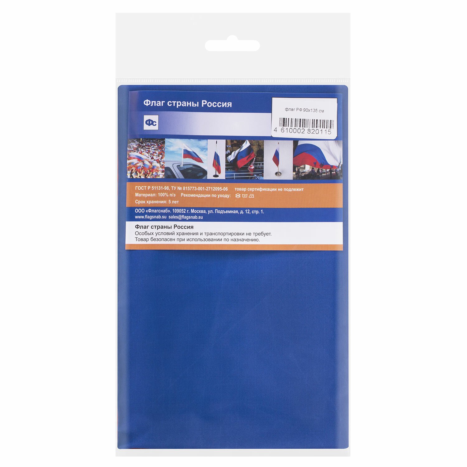 Флаг России, 90х135 см, карман под древко, упаковка с европодвесом, 550021
