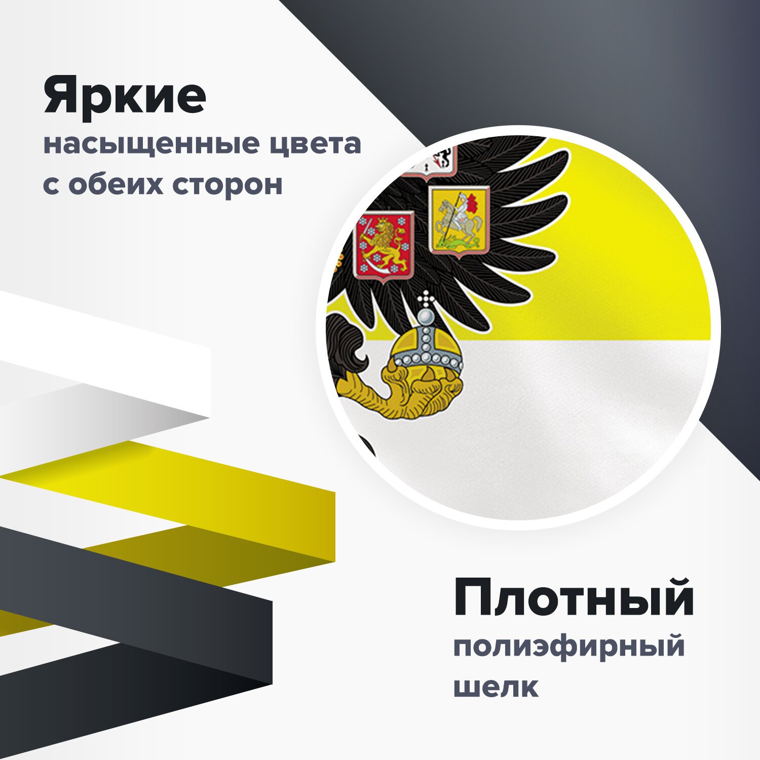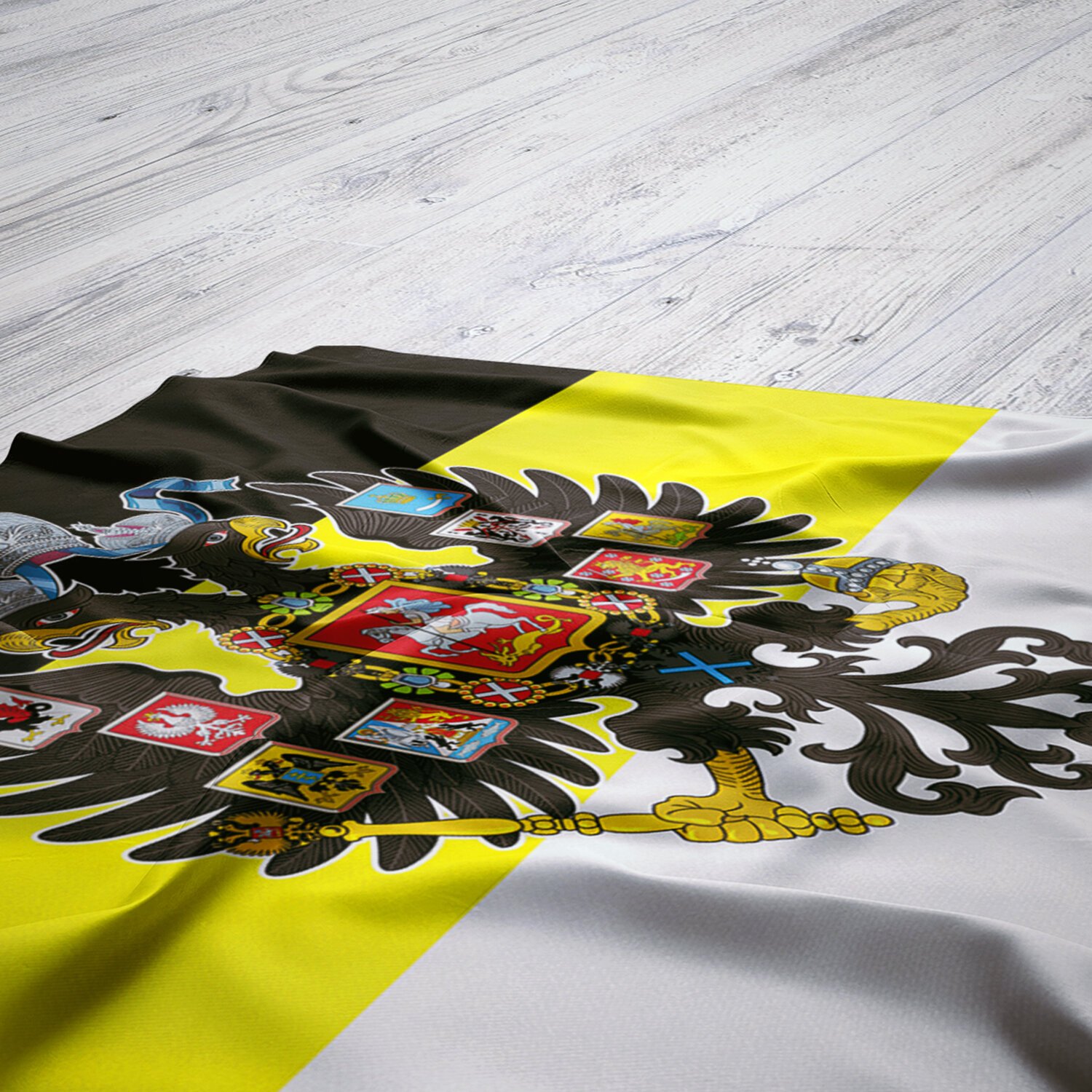 Флаг Российской империи представляет собой прямоугольное полотно из трех равновеликих горизонтальных полос: верхней - черной, средней - желтой и нижней - белого цвета. С двух сторон имеется яркое изображение герба Российской империи.