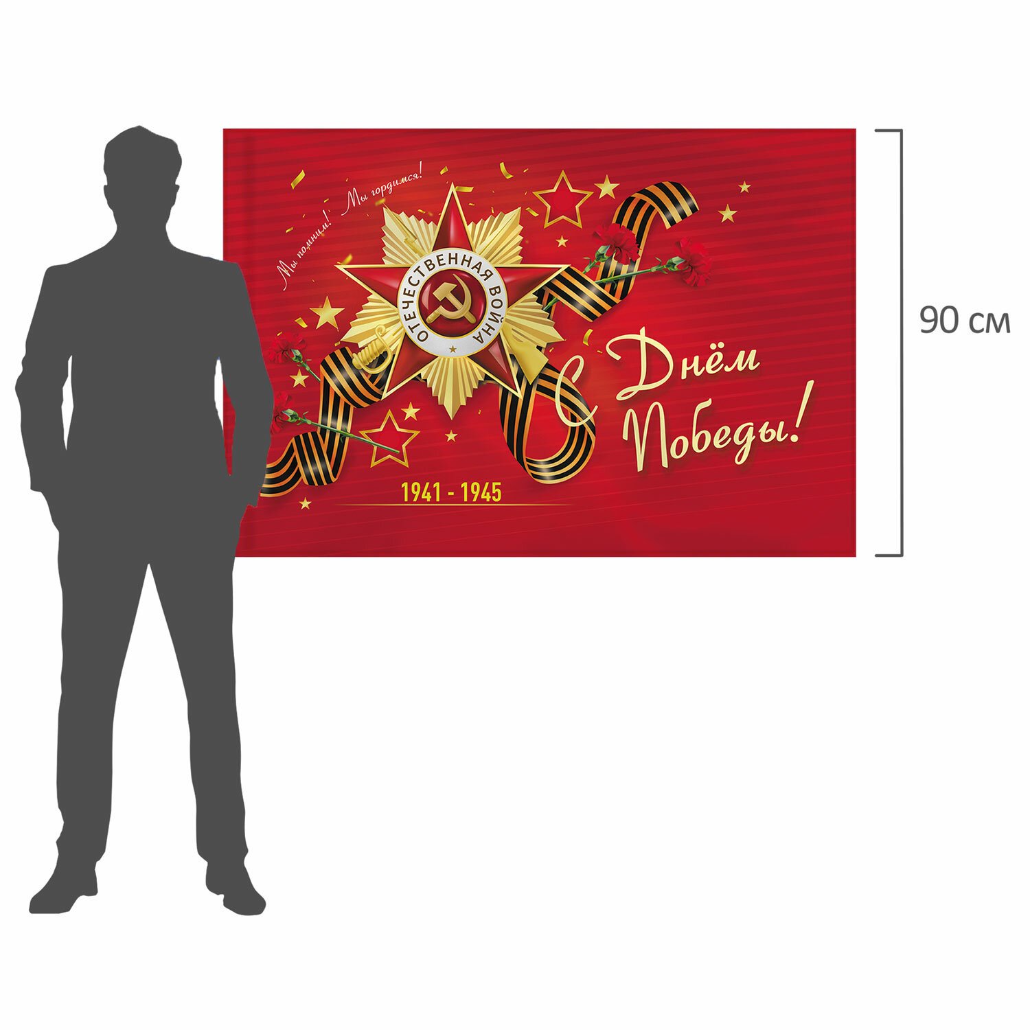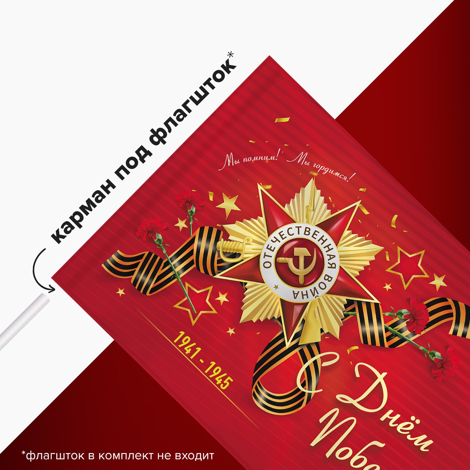 Флаг "С Днем Победы!" представляет собой красное полотно, на котором изображены символы Победы в Великой Отечественной войне - Орден Отечественной войны, Георгиевская лента, красные гвоздики и надписи: "Мы помним! Мы гордимся!", "С Днем Победы!".