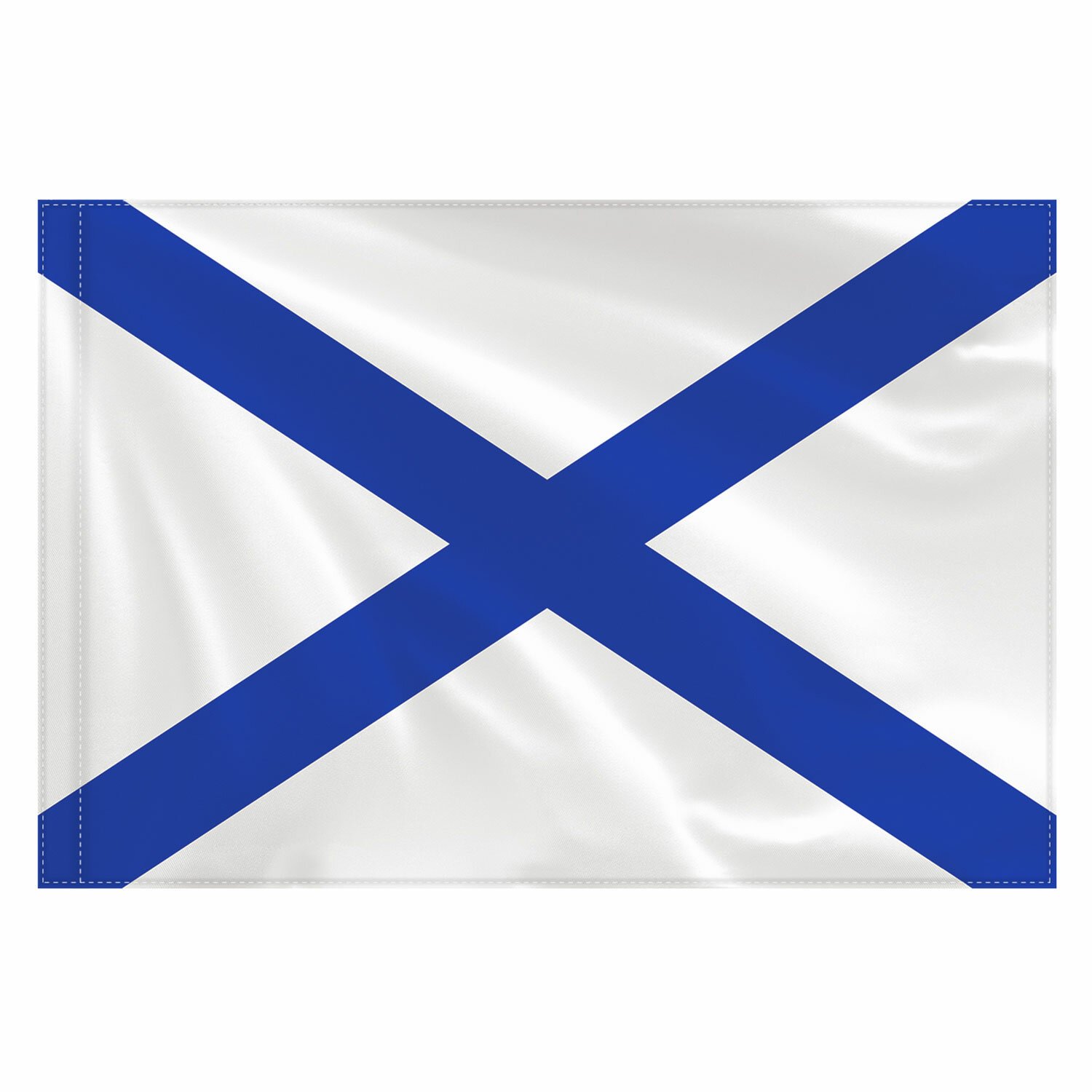Флаг Военно-Морского Флота России "Андреевский флаг" представляет собой прямоугольное двухстороннее полотно белого цвета, пересечённое синим диагональным (Андреевским) крестом, не содержит эмблему ВМФ. Яркое изображение с двух сторон флага.