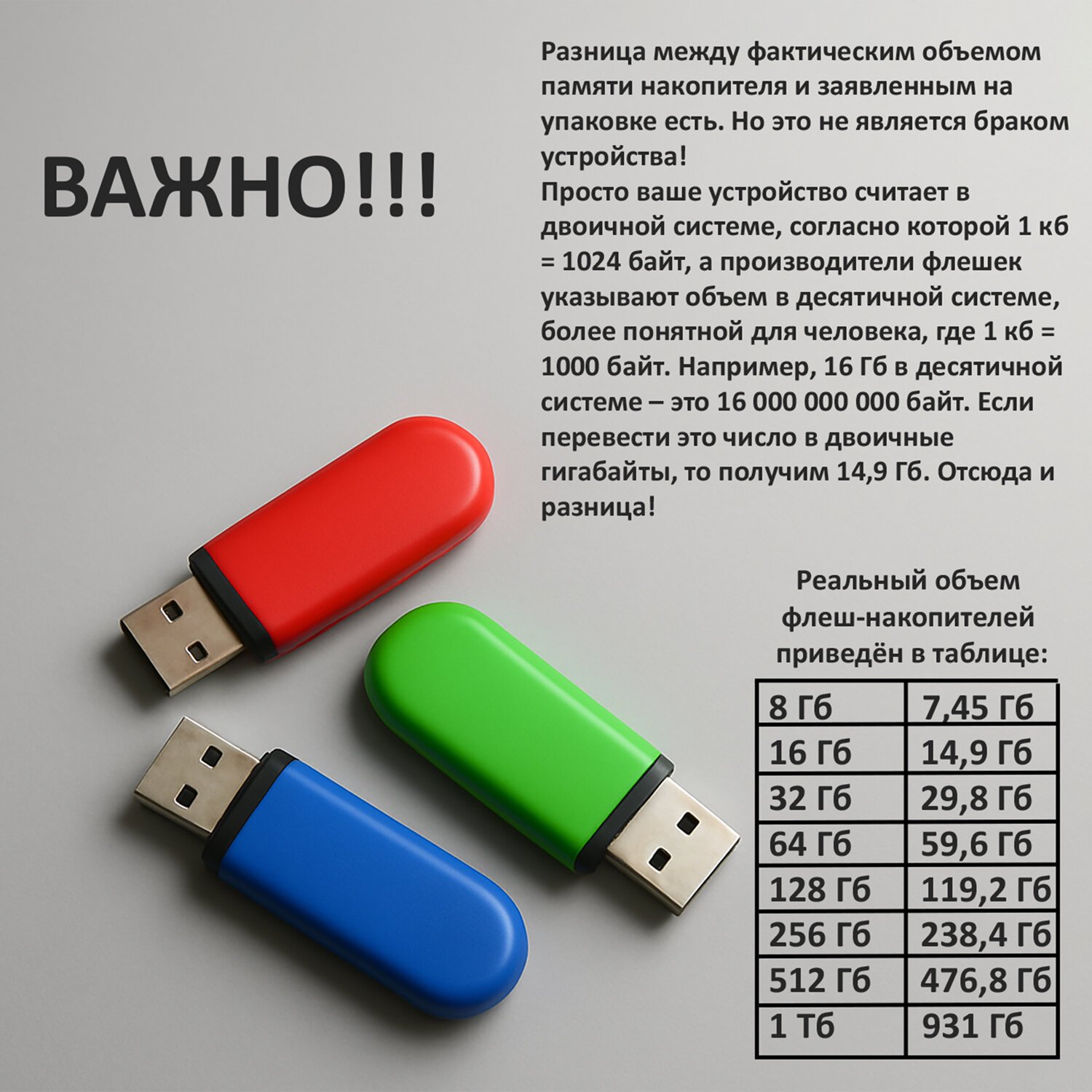 Внимание! Часть указанного на упаковке объема флеш-памяти используется системой компьютера для форматирования и других функций. Поэтому фактический доступный объем для хранения данных меньше указанного.