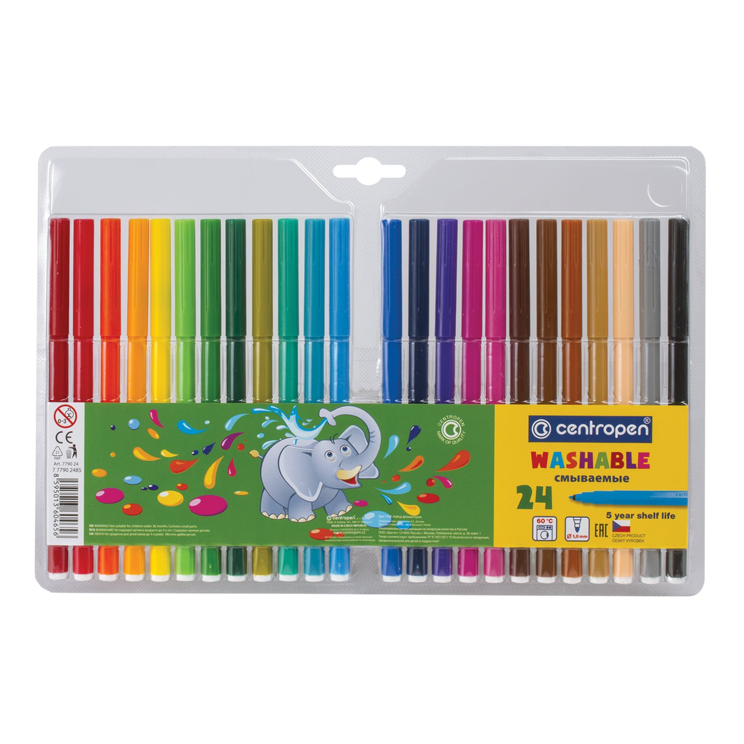 Фломастеры 24 ЦВЕТА CENTROPEN "Washable", смываемые, вентилируемый колпачок, 7790/24TP, 777902485