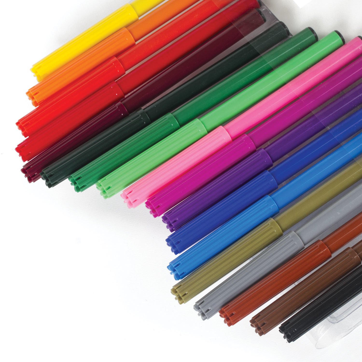 Обладают яркими насыщенными цветами в количестве 18 штук. Удобная круглая форма корпуса, длина которого 139 мм, а диаметр - 8,5 мм. Благодаря толщине линии письма 1 мм и диаметру пишущего узла 2,1 мм процесс раскрашивания становится легким. Длина письма составляет 600 м: такого расхода хватит надолго. Фломастеры изготовлены на водной основе, поэтому они безопасны и легко смываются с большинства материалов и кожи. Наконечник, устойчивый к продавливанию, не проваливается внутрь корпуса и не деформируется даже при сильном нажатии. Полипропиленовый корпус значительно продлевает срок службы фломастеров. Колпачок имеет специальные прорези для вентиляции, которые способствуют прохождению воздуха при попадании в дыхательные пути малыша. Рекомендованы для детей от 3-х лет.