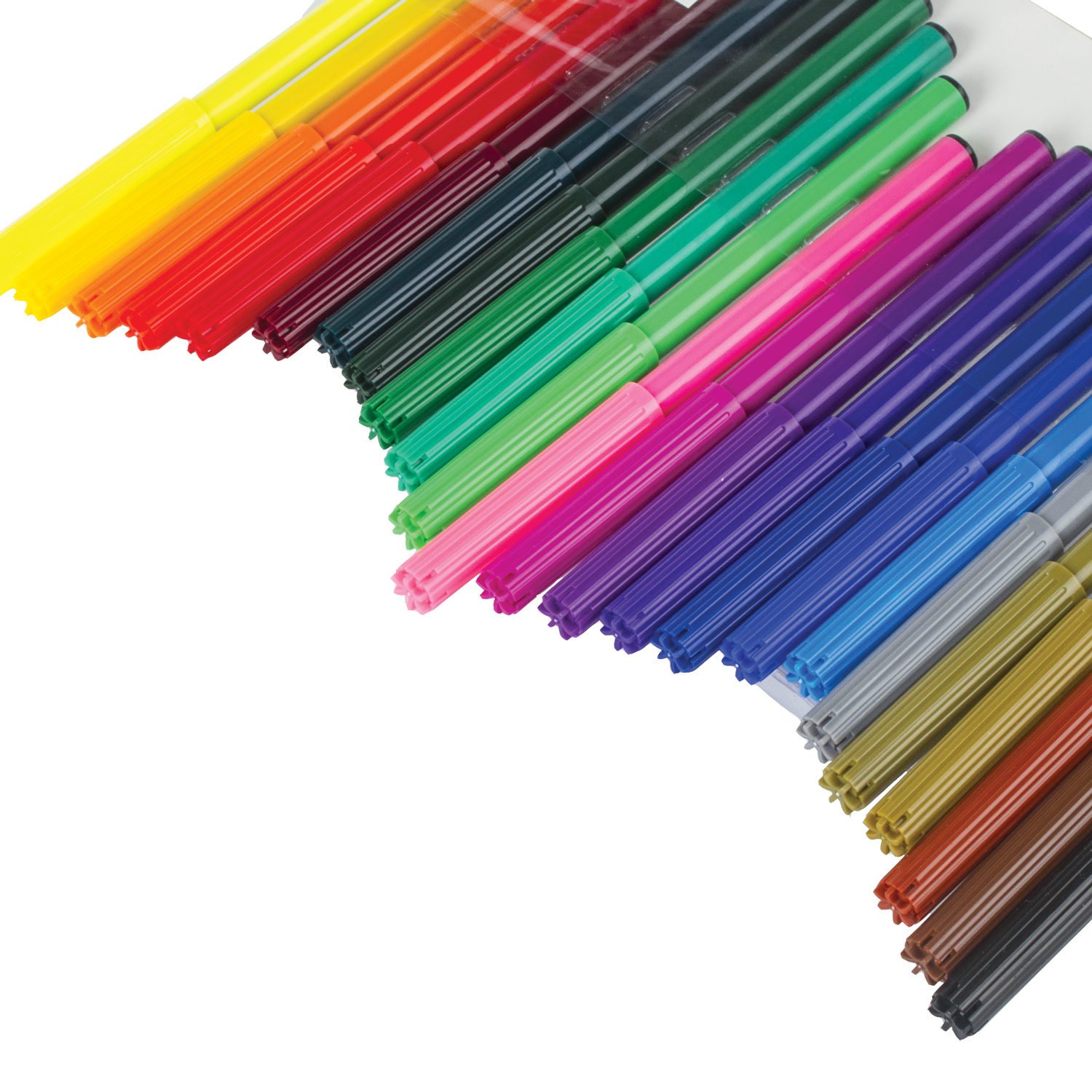 Обладают яркими насыщенными цветами в количестве 24 штук. Удобная круглая форма корпуса, длина которого 139 мм, а диаметр - 8,5 мм. Благодаря толщине линии письма 1 мм и диаметру пишущего узла 2,1 мм процесс раскрашивания становится легким. Длина письма составляет 600 м: такого расхода хватит надолго. Фломастеры изготовлены на водной основе, поэтому они безопасны и легко смываются с большинства материалов и кожи. Наконечник, устойчивый к продавливанию, не проваливается внутрь корпуса и не деформируется даже при сильном нажатии. Полипропиленовый корпус значительно продлевает срок службы фломастеров. Колпачок имеет специальные прорези для вентиляции, которые способствуют прохождению воздуха при попадании в дыхательные пути малыша. Рекомендованы для детей от 3-х лет.