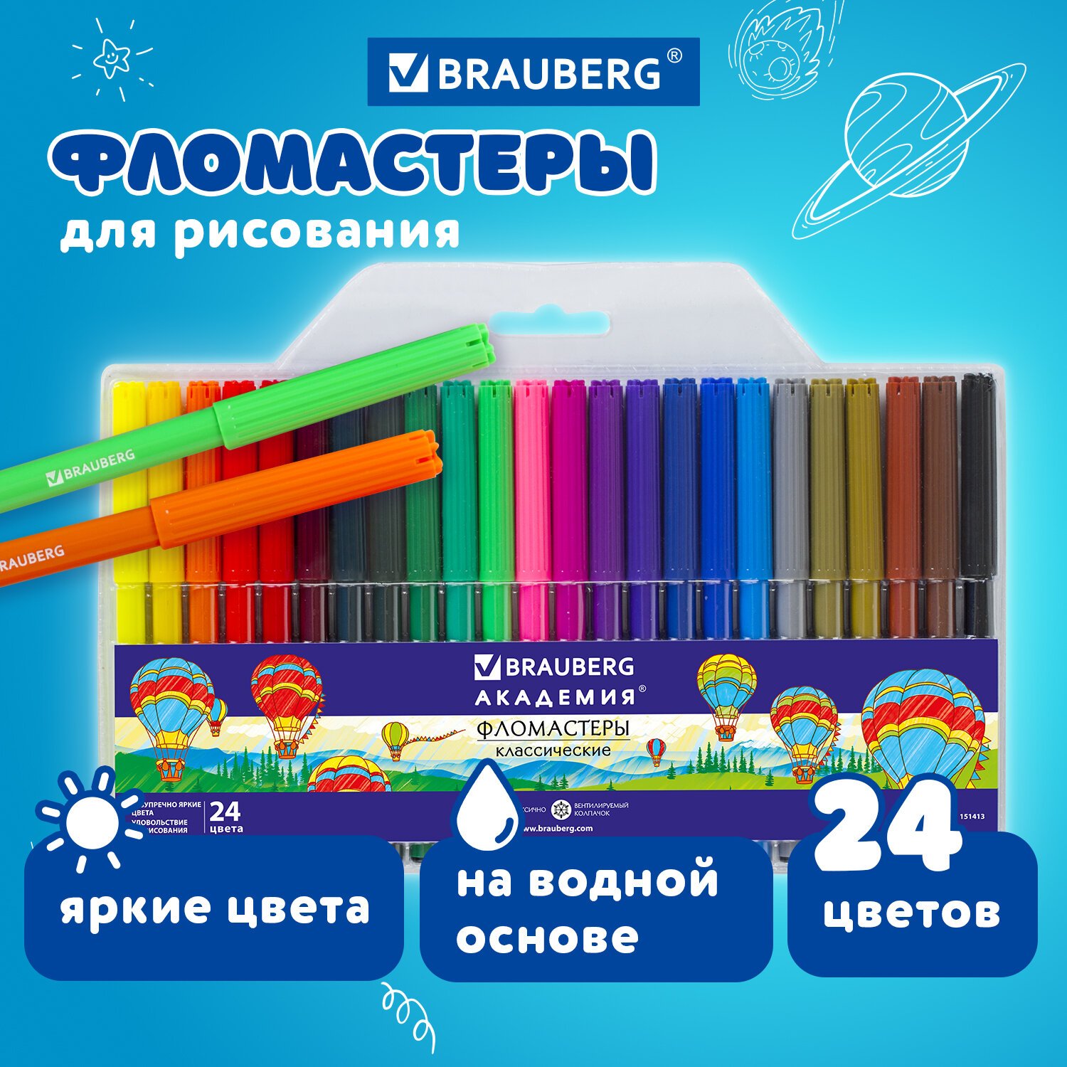Фломастеры BRAUBERG "АКАДЕМИЯ", 24 цвета, вентилируемый колпачок, ПВХ упаковка, 151413