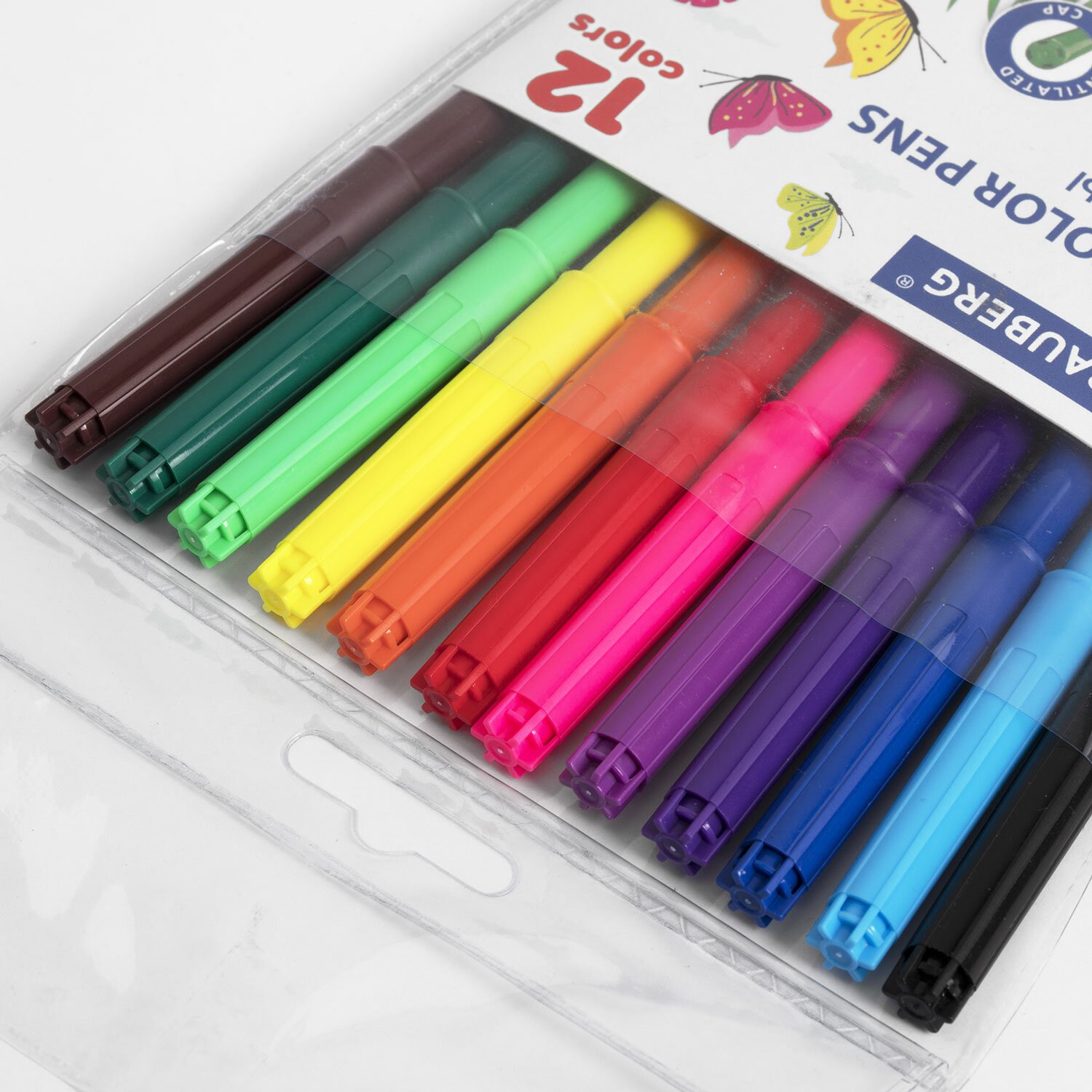 Обладают яркими насыщенными цветами в количестве 12 шт. Удобная круглая форма корпуса, длина которого 135 мм, а диаметр 8,8 мм. Благодаря толщине линии письма 1 мм и диаметру пишущего узла 1,8 мм процесс раскрашивания становится легким. Длина письма составляет 500 м: такого расхода хватит надолго. Фломастеры изготовлены на водной основе, поэтому они безопасны и легко смываются с большинства материалов и кожи. Полипропиленовый корпус значительно продлевает срок службы фломастеров. Колпачок имеет специальные прорези для вентиляции, которые способствуют прохождению воздуха при попадании в дыхательные пути малыша. Рекомендованы для детей от 3 лет.