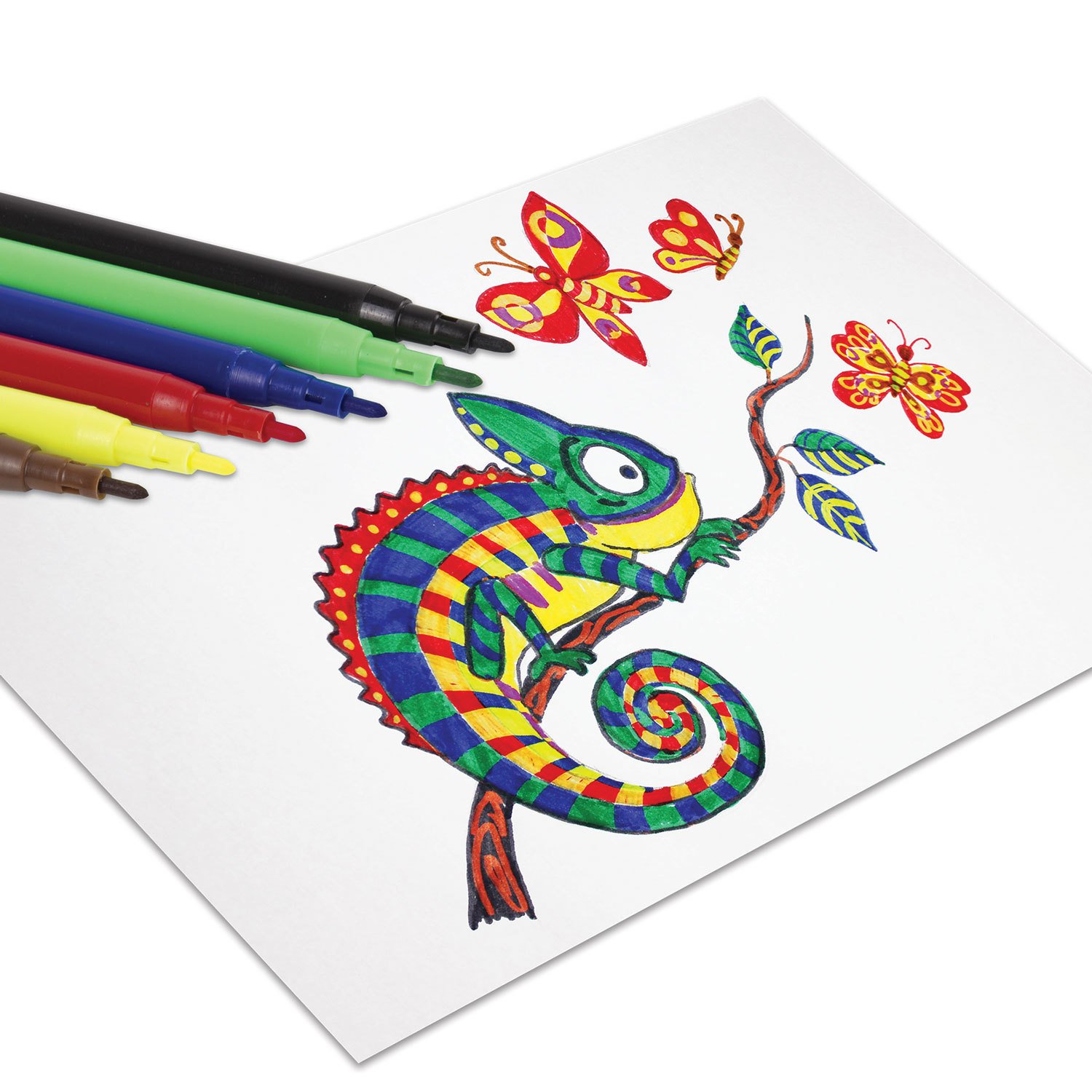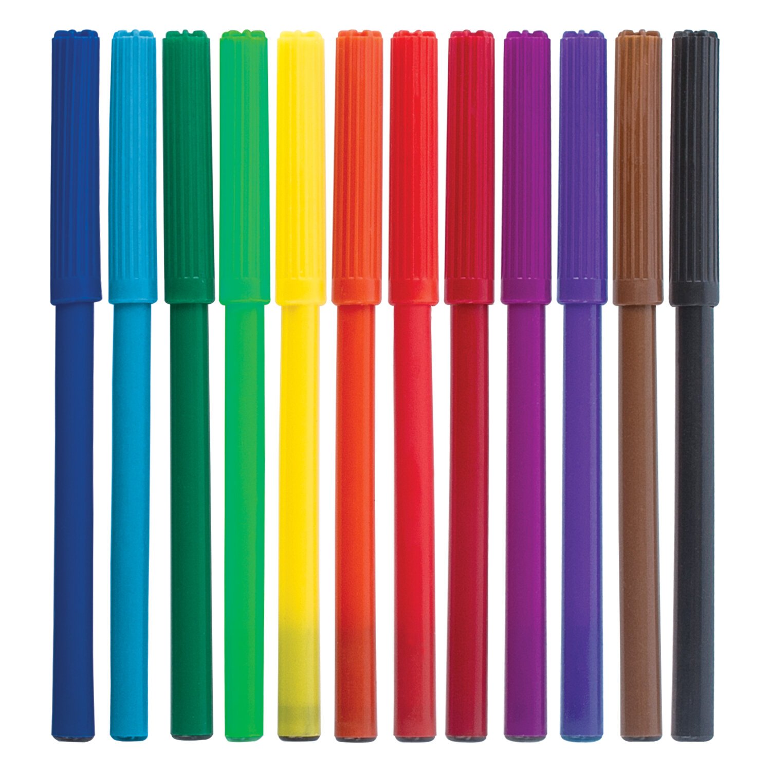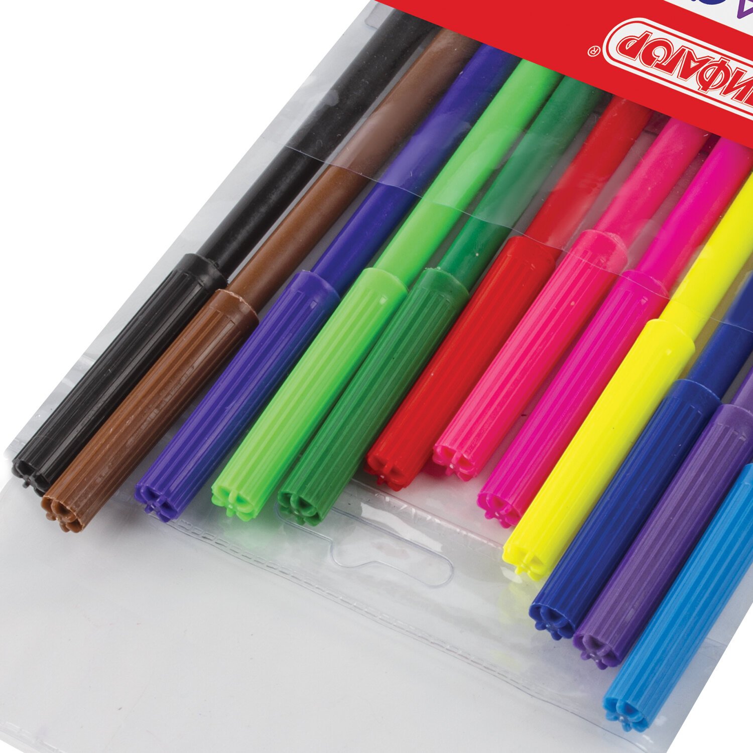 Обладают яркими цветами в количестве 12 штук. Удобная круглая форма корпуса, длина которого 126 мм, а диаметр - 7 мм. Благодаря толщине линии письма 1 мм и диаметру пишущего узла 1,8 мм процесс раскрашивания становится легким. Длина письма составляет 400 м: такого расхода хватит надолго. Фломастеры изготовлены на водной основе, поэтому они безопасны и легко смываются с большинства материалов и кожи. Полипропиленовый корпус значительно продлевает срок службы фломастеров. Колпачок имеет специальные прорези для вентиляции, которые способствуют прохождению воздуха при попадании в дыхательные пути малыша. Рекомендованы для детей от 3-х лет.