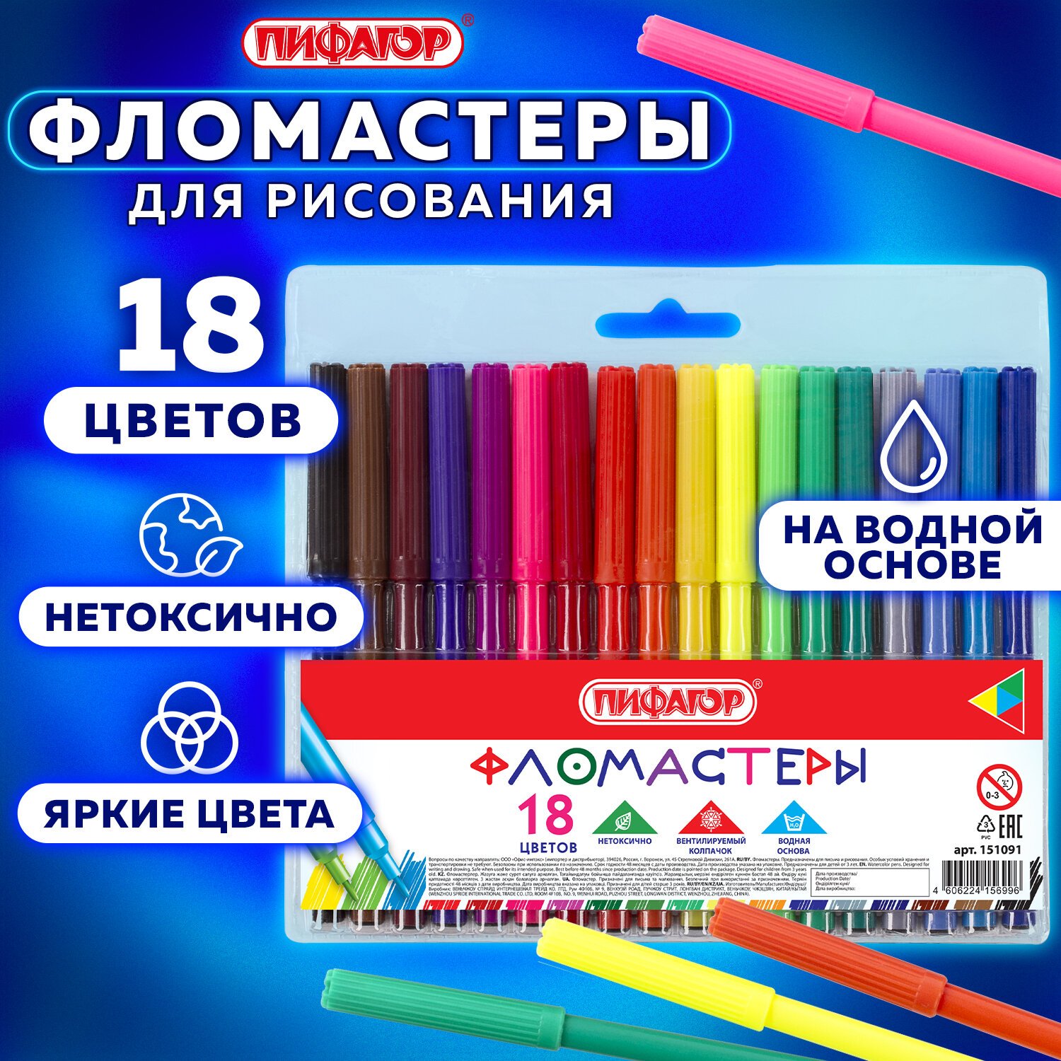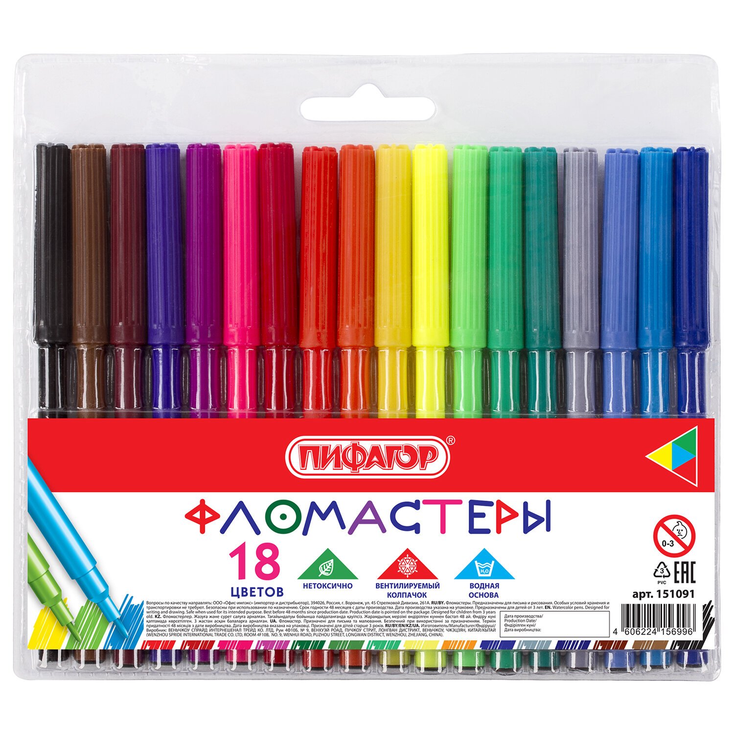 Фломастеры ПИФАГОР, 18 цветов, вентилируемый колпачок, 151091