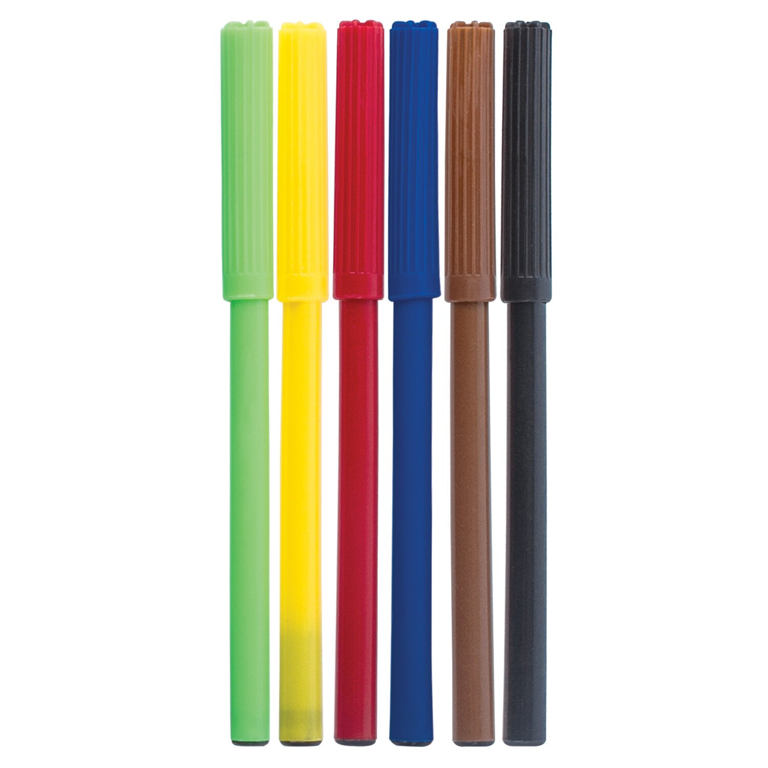 Обладают яркими цветами в количестве 6 штук. Удобная круглая форма корпуса, длина которого 126 мм, а диаметр – 7 мм. Благодаря толщине линии письма 1 мм и диаметру пишущего узла 1,8 мм процесс раскрашивания становится легким. Длина письма составляет 400 м: такого расхода хватит надолго. Фломастеры изготовлены на водной основе, поэтому они безопасны и легко смываются с большинства материалов и кожи. Полипропиленовый корпус значительно продлевает срок службы фломастеров. Колпачок имеет специальные прорези для вентиляции, которые способствуют прохождению воздуха при попадании в дыхательные пути малыша. Рекомендованы для детей от 3 лет.