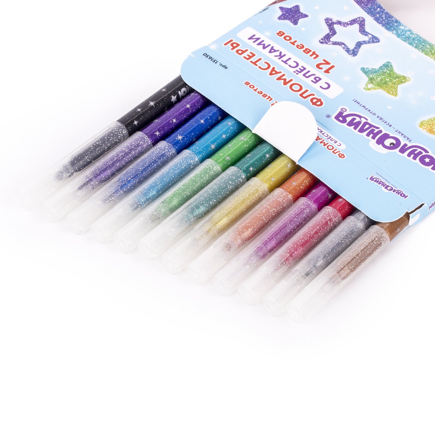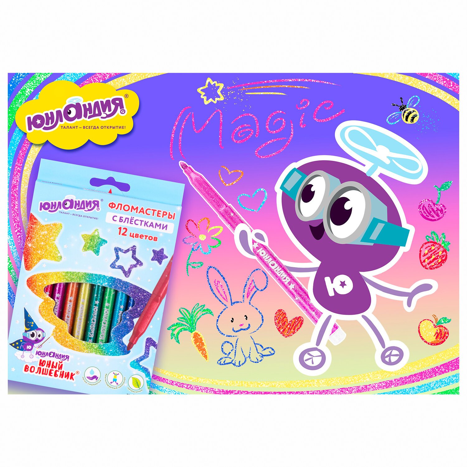Фломастеры с блестками ЮНЛАНДИЯ 12 цветов, "ЮНЫЙ ВОЛШЕБНИК", ударопрочный наконечник, вентилируемый колпачок, картон, 151650