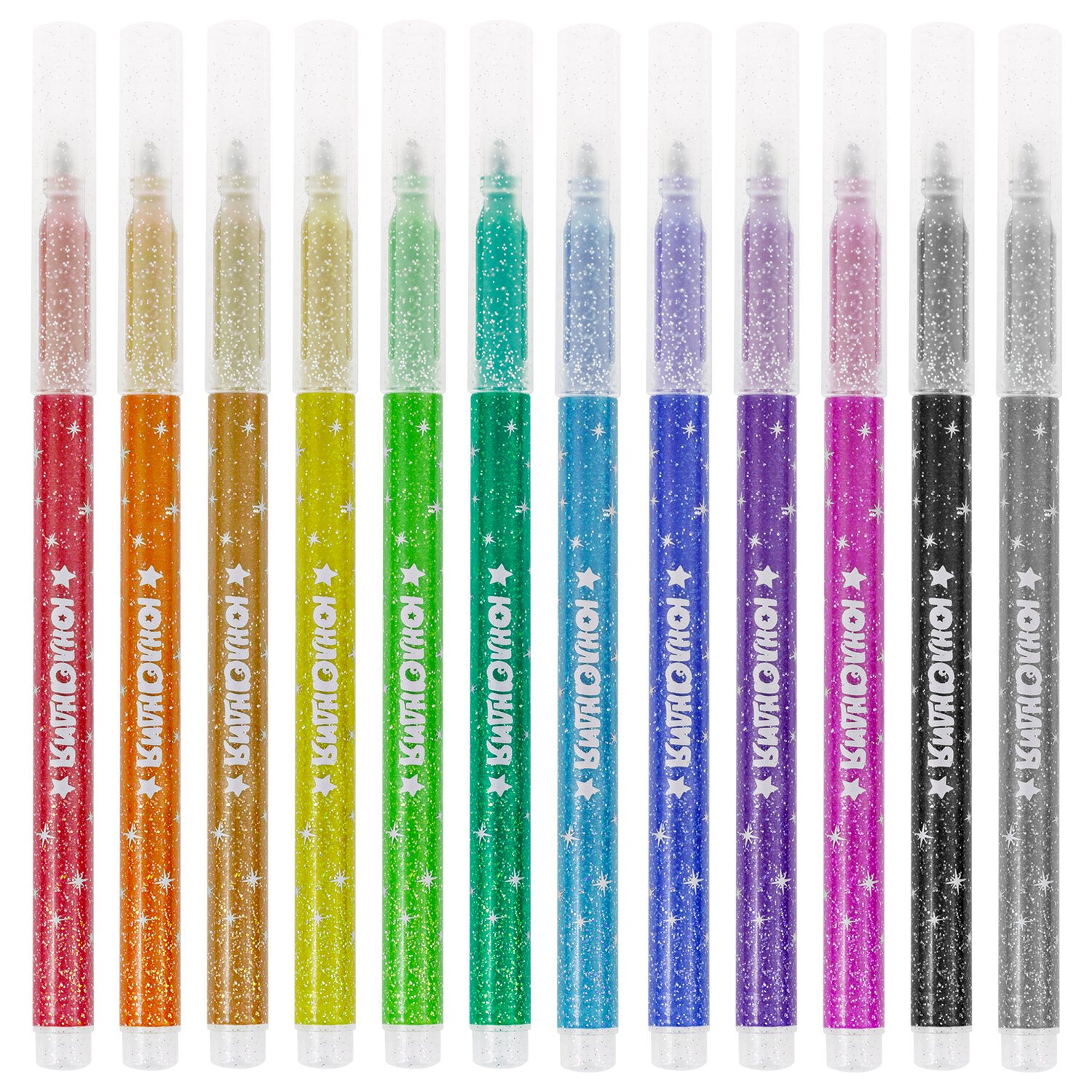 Фломастеры обладают яркими насыщенными цветами в количестве 12 штук. Имеют удобную круглую форму корпуса, длина которого 152 мм, а диаметр - 9 мм, и удобную трехгранную зону захвата. Благодаря толщине линии письма 2 мм и диаметру пишущего узла 3,2 мм процесс раскрашивания становится легким. Длина письма составляет 450 м: такого расхода хватит надолго. Блестки создают волшебный эффект сверкания рисунка, что дает яркий стимул к развитию творческих талантов у детей. Фломастеры изготовлены на водной основе, поэтому они безопасны и легко смываются с большинства материалов и кожи. Наконечник, устойчивый к продавливанию, не проваливается внутрь корпуса и не деформируется даже при сильном нажатии. Полипропиленовый корпус значительно продлевает срок службы фломастеров. Колпачок имеет специальные прорези для вентиляции, которые способствуют прохождению воздуха при попадании в дыхательные пути ребенка. Рекомендованы для детей от 3-х лет.