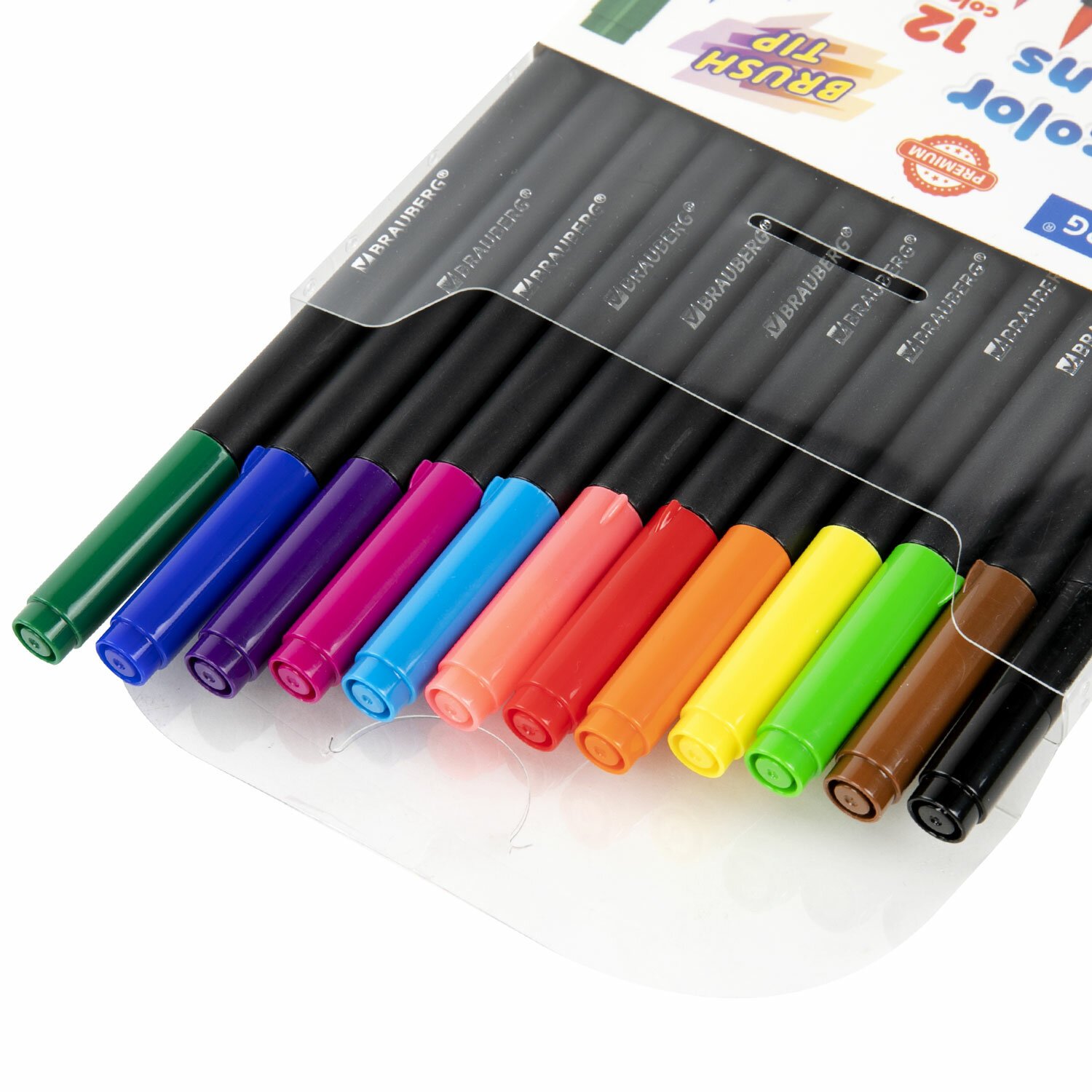 Фломастеры BRAUBERG PREMIUM - набор из 12 круглых фломастеров с наконечником-кистью, смываемыми чернилами на водной основе в ПВХ-упаковке для рисования.