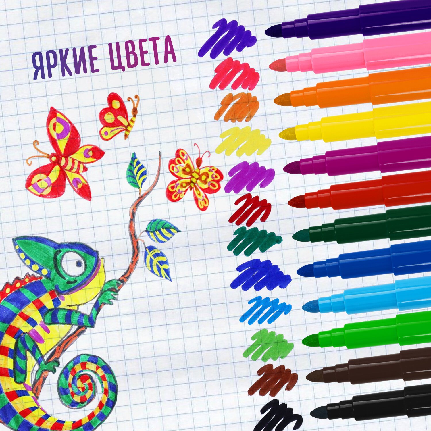 Набор фломастеров с насыщенными, яркими цветами в количестве 12 штук. Фломастеры имеют утолщенный круглый корпус, длина 140 мм, диаметр - 12 мм. Благодаря линии письма 1-3 мм процесс раскрашивания становится легким и приятным. Круглый утолщенный наконечник устойчив к продавливанию, не проваливается внутрь корпуса. Быстросохнущие чернила предотвращают смазывание рисунка. Благодаря полипропиленовому корпусу срок службы фломастеров значительно увеличивается. Прозрачный колпачок имеет специальные прорези для вентиляции. Фломастеры обладают экономным расходом чернил, при этом длина линии письма достигает 300 метров. Рекомендованы для детей от 3-х лет.