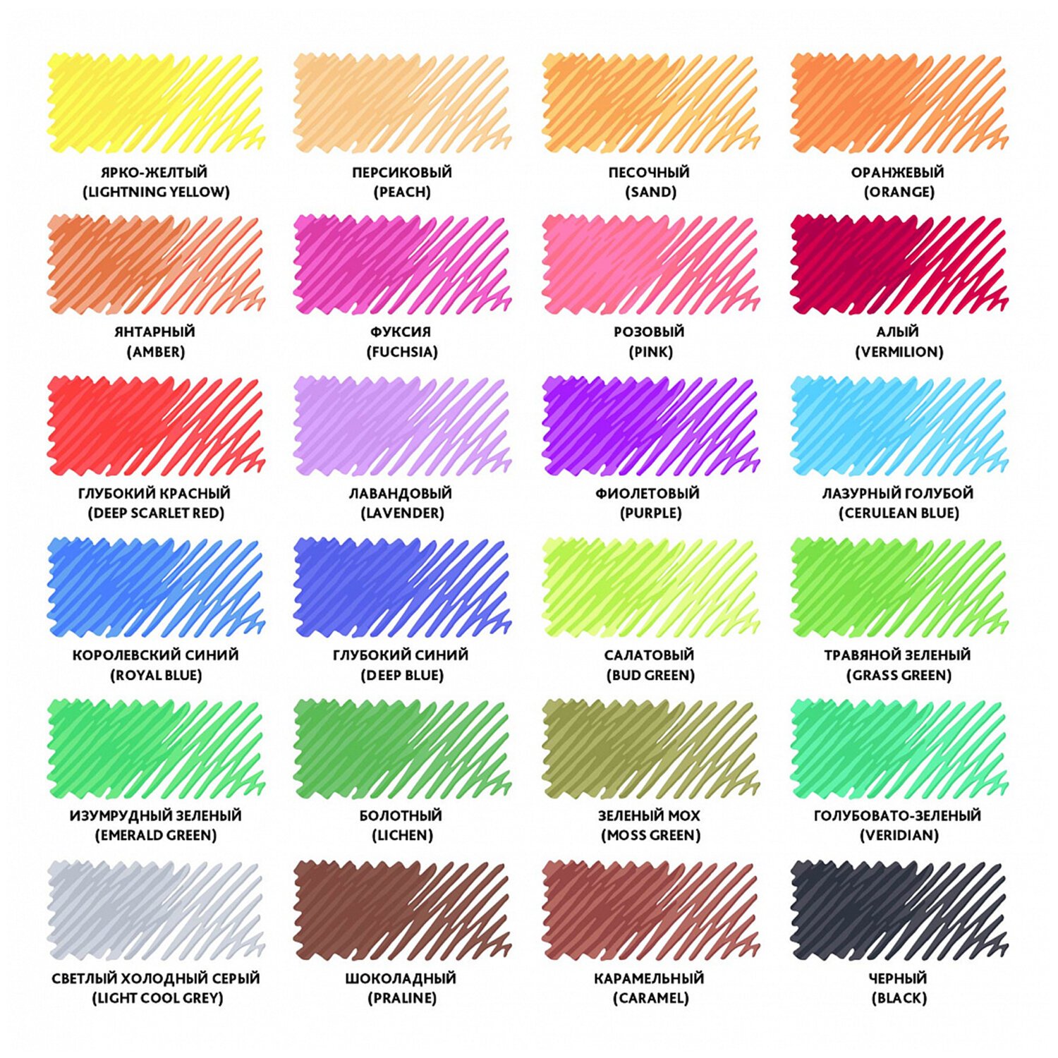 В наборе 24 фломастера, с круглым корпусом из пластика длиной 150 мм и диаметром 8,2 мм. Круглый наконечник из фетра с линией письма 0,5-1 мм удобен для создания тонких линий и прорисовки деталей. Длина письма составляет 350 м: такого расхода хватит надолго. Фломастеры изготовлены на водной основе, поэтому они безопасны и смываются с большинства материалов и кожи. Прозрачный колпачок имеет специальные прорези для вентиляции, которые способствуют прохождению воздуха при попадании в дыхательные пути малыша. Рекомендованы для детей от 3-х лет.