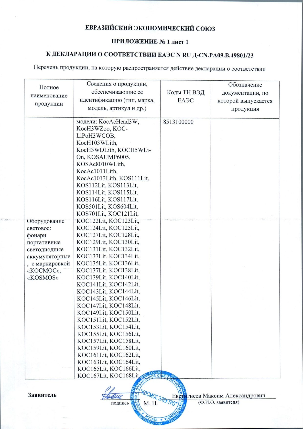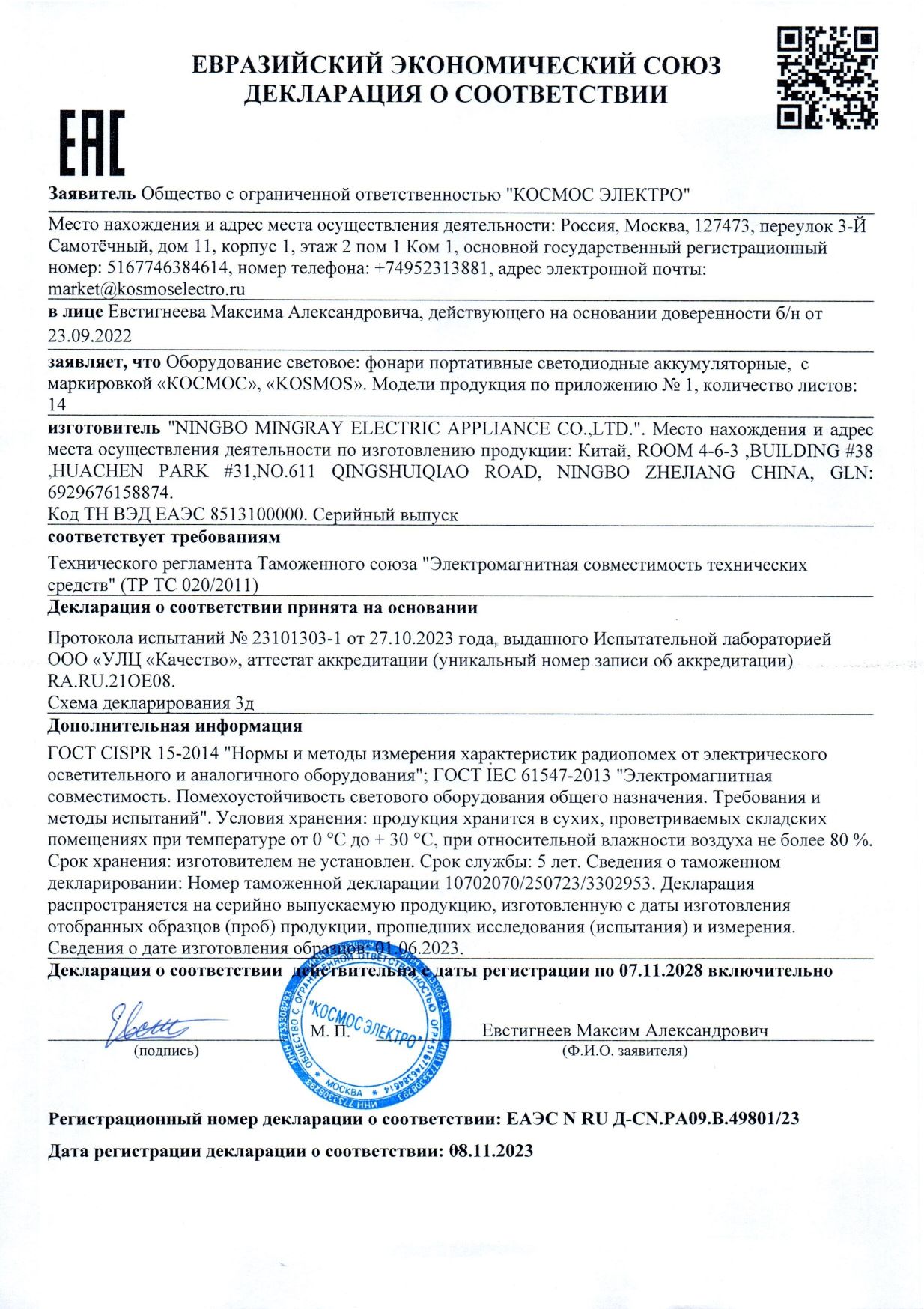 Фонарь аккумуляторный КОСМОС 1 Вт, LED, Li-ion, заряд от USB, KOS117Lit