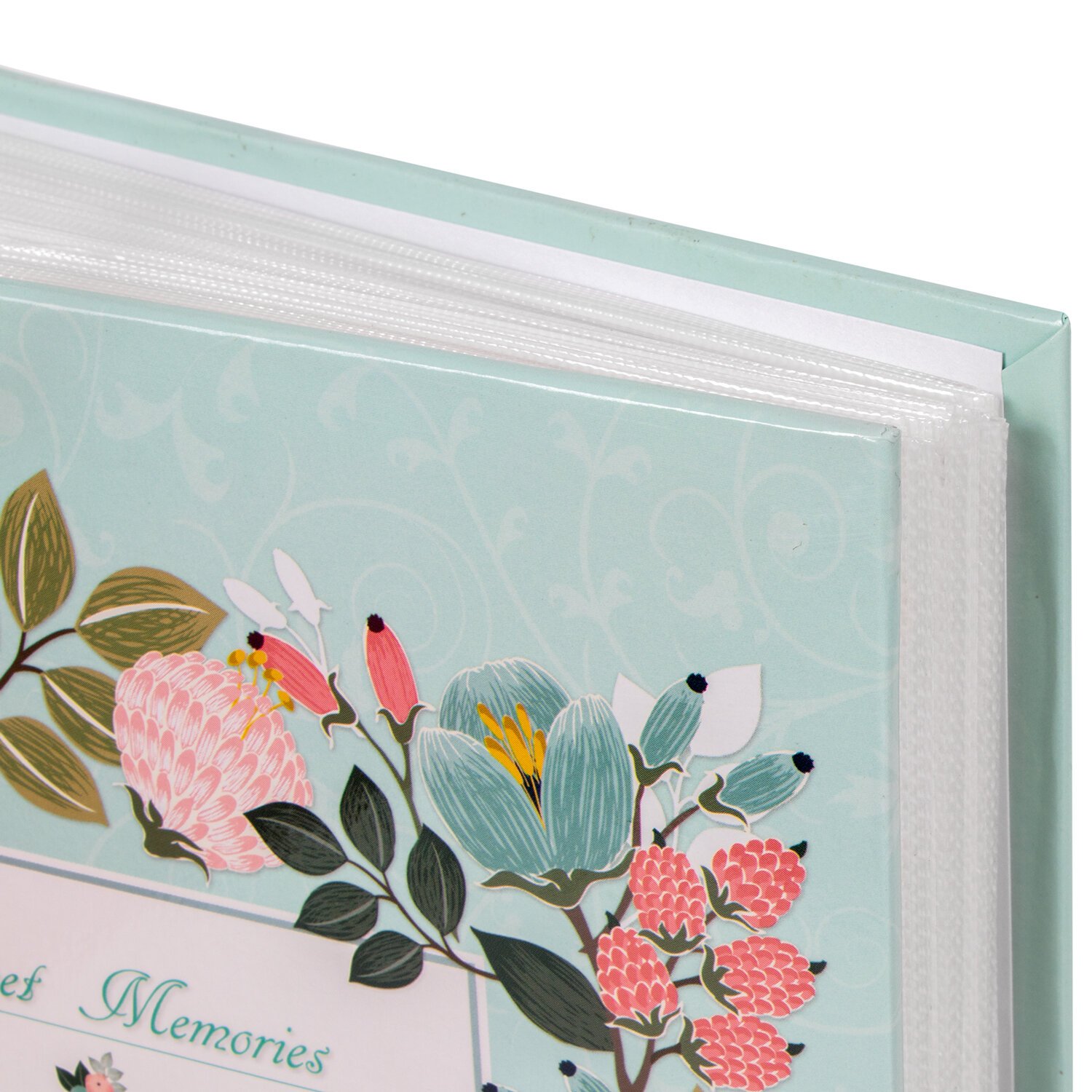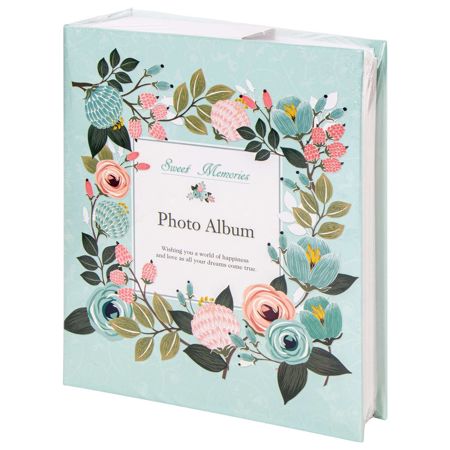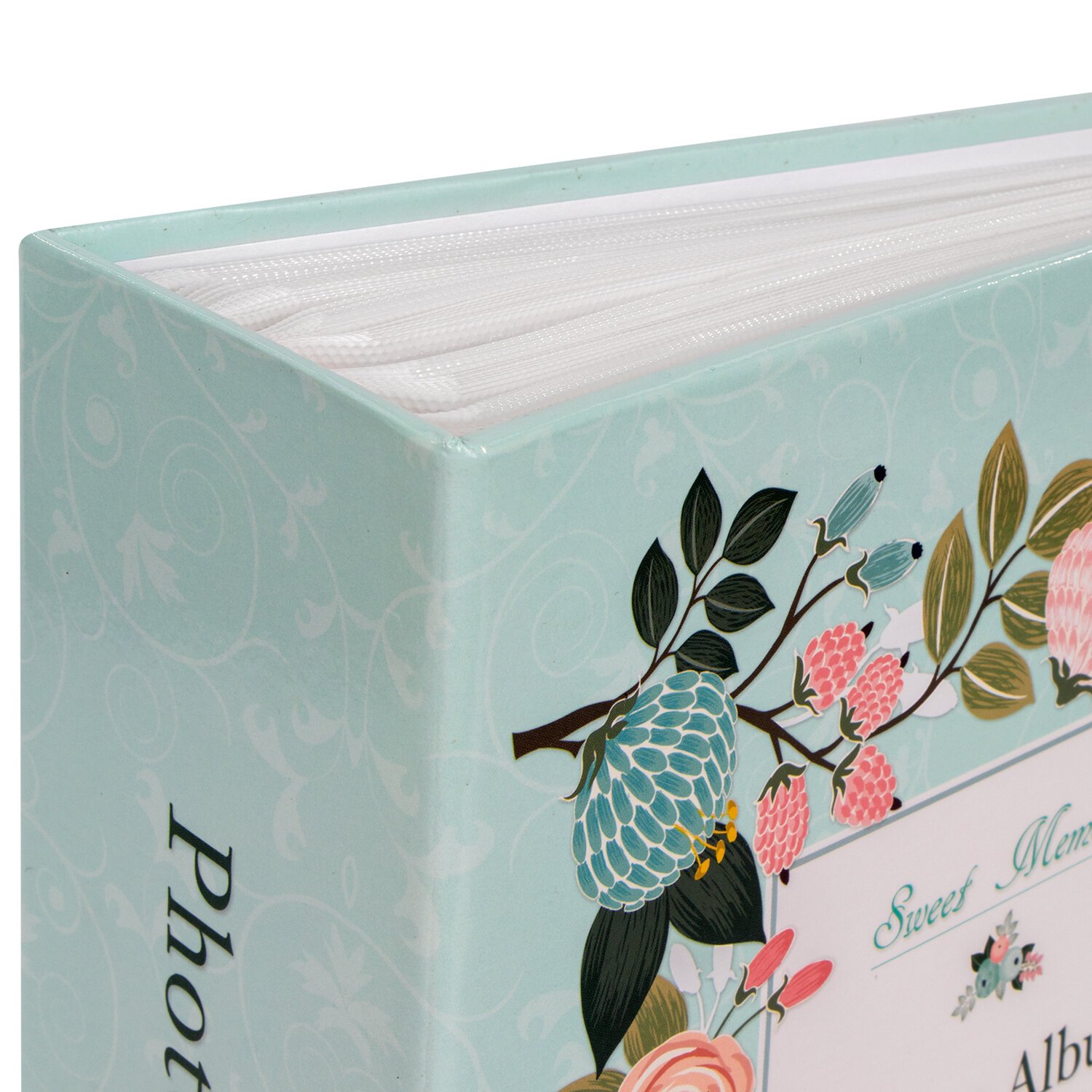 Состоит из 76 полипропиленовых листов размером 17,5х22 см с карманами и вмещает 304 фотографии размером 10х15 см по 2 штуки на странице. Обложка фотоальбома выполнена в бирюзовых тонах с цветочным узором, а его листы склеены в единый блок. Размер альбома - 18х23 см.