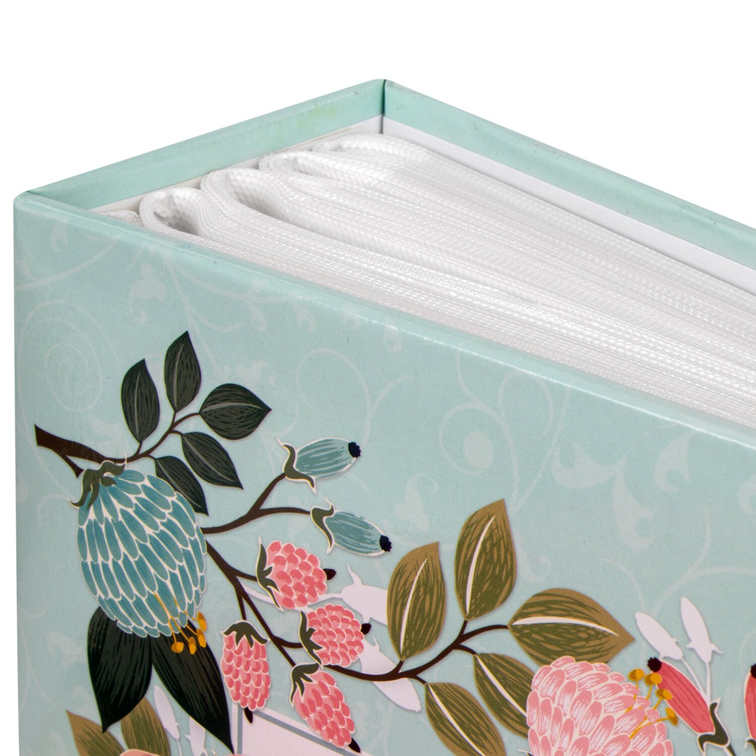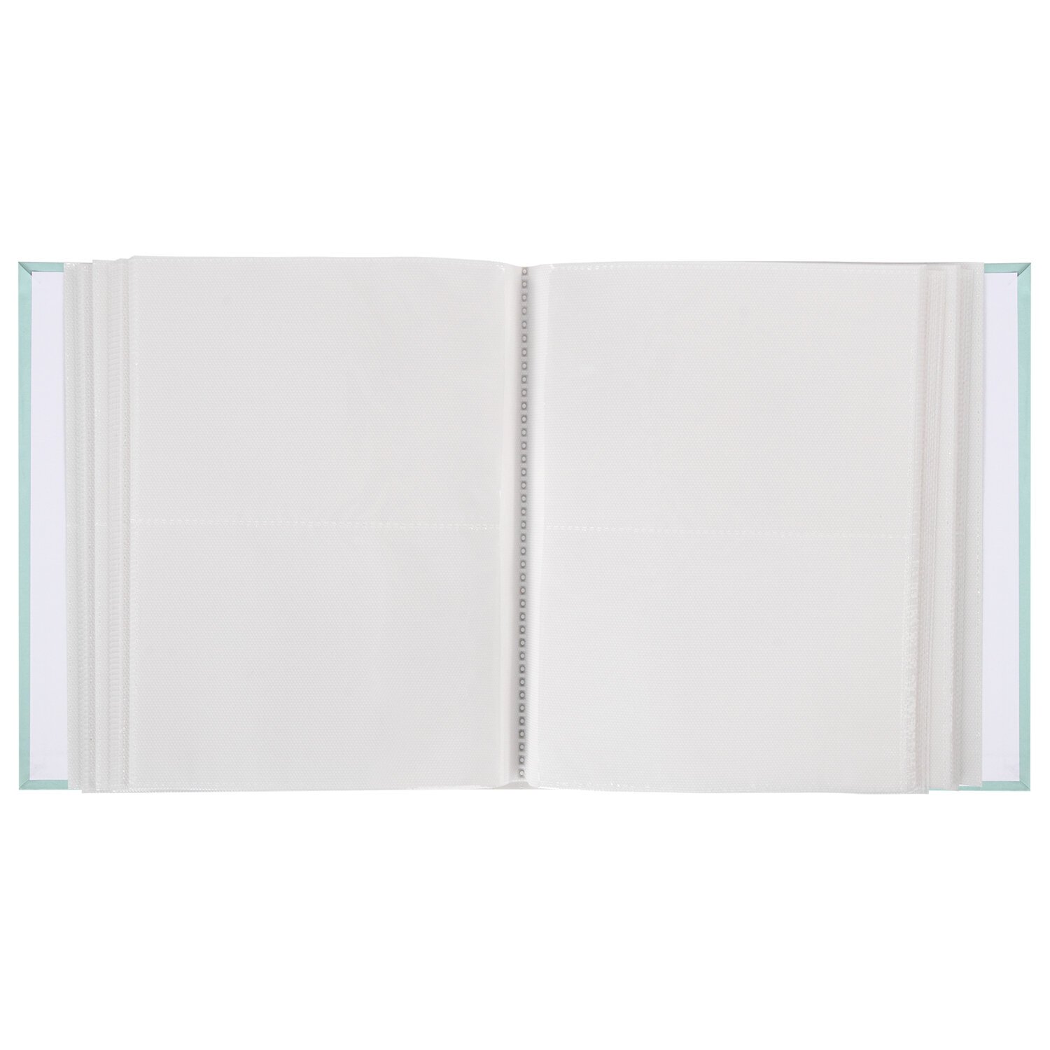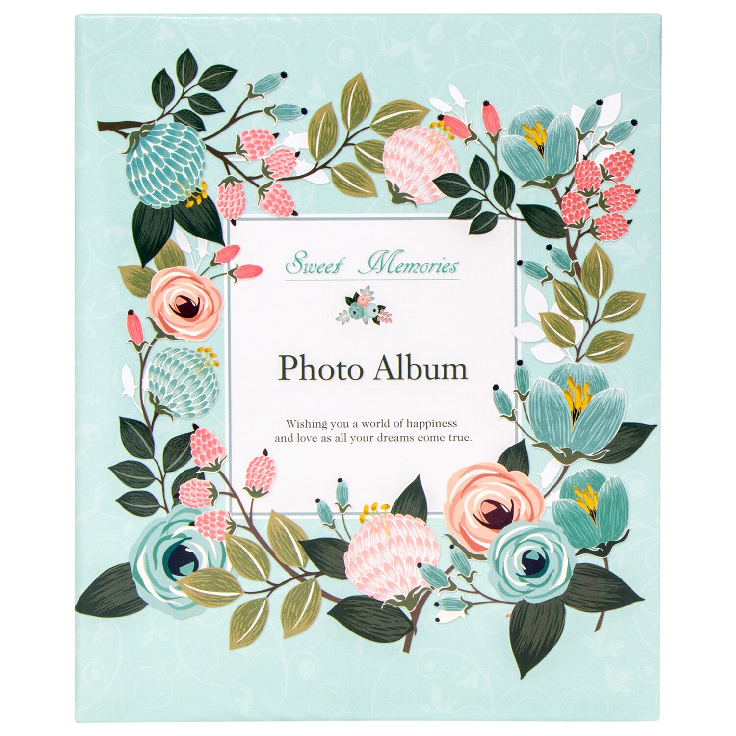 Состоит из 76 полипропиленовых листов размером 17,5х22 см с карманами и вмещает 304 фотографии размером 10х15 см по 2 штуки на странице. Обложка фотоальбома выполнена в бирюзовых тонах с цветочным узором, а его листы склеены в единый блок. Размер альбома - 18х23 см.