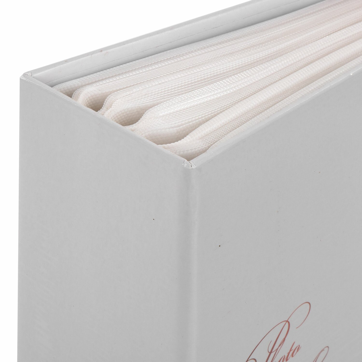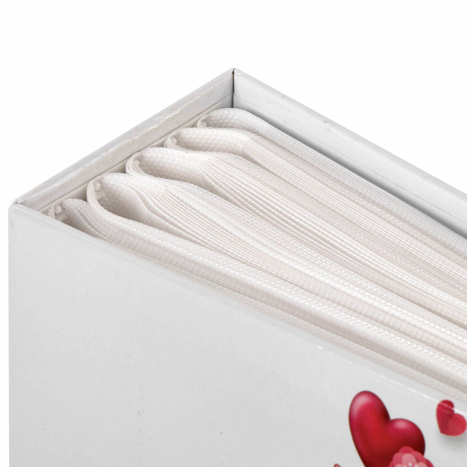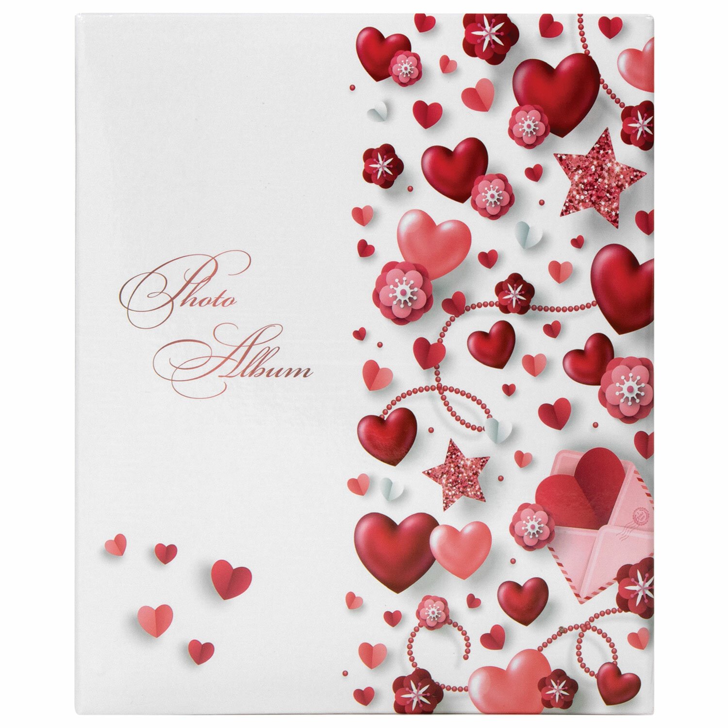 Состоит из 76 полипропиленовых листов размером 17,5х22 см с карманами и вмещает 304 фотографии размером 10х15 см по 2 штуки на странице. Обложка фотоальбома выполнена в белых и красных тонах с изображением сердец и звезд, а его листы склеены в единый блок. Размер - 18х23 см.
